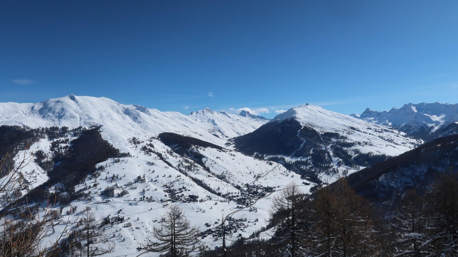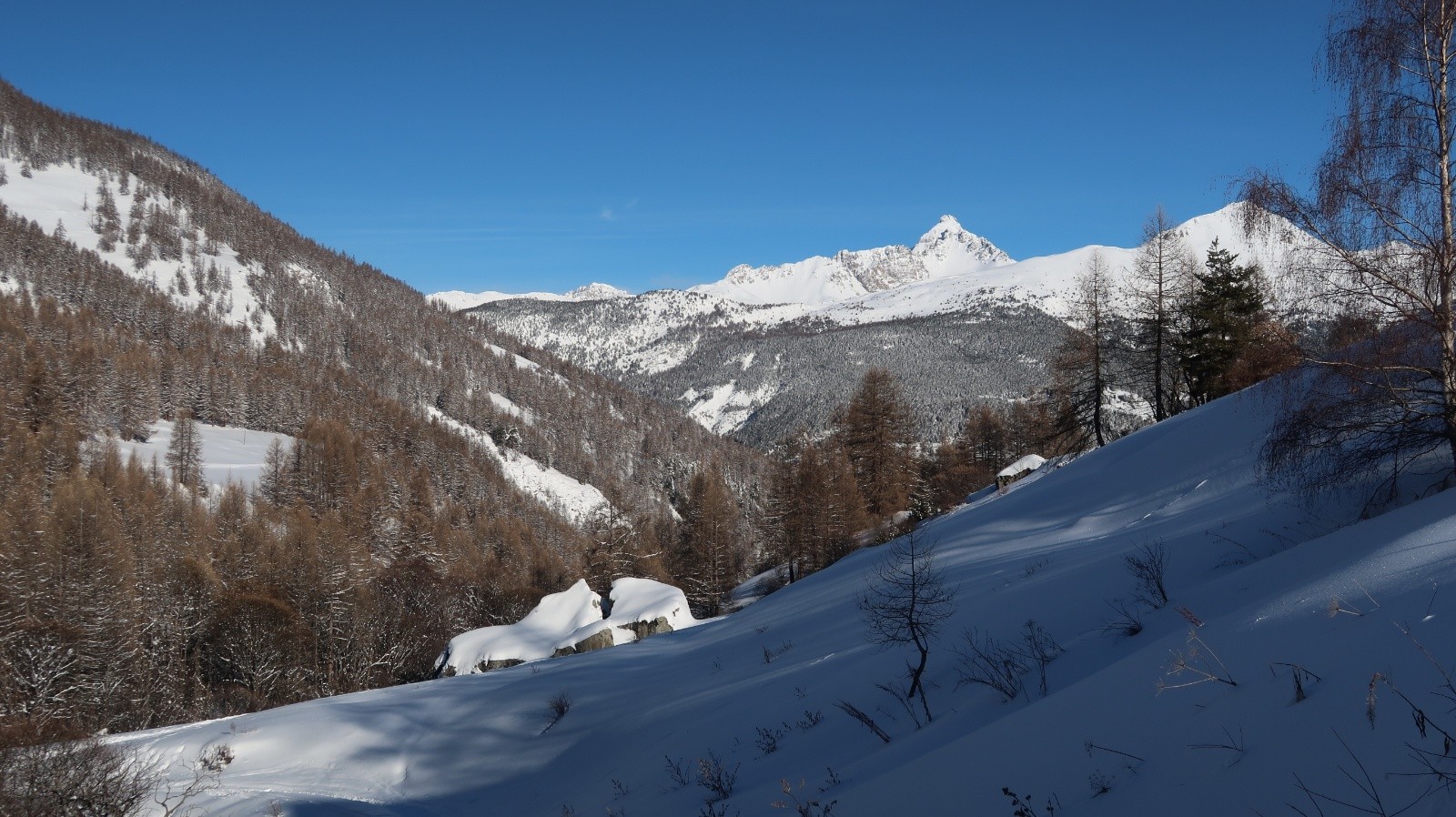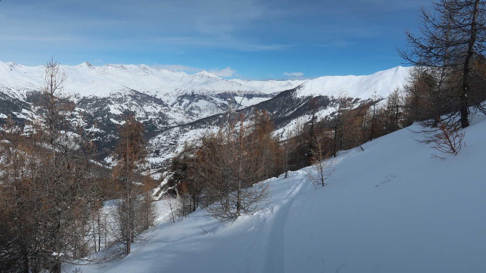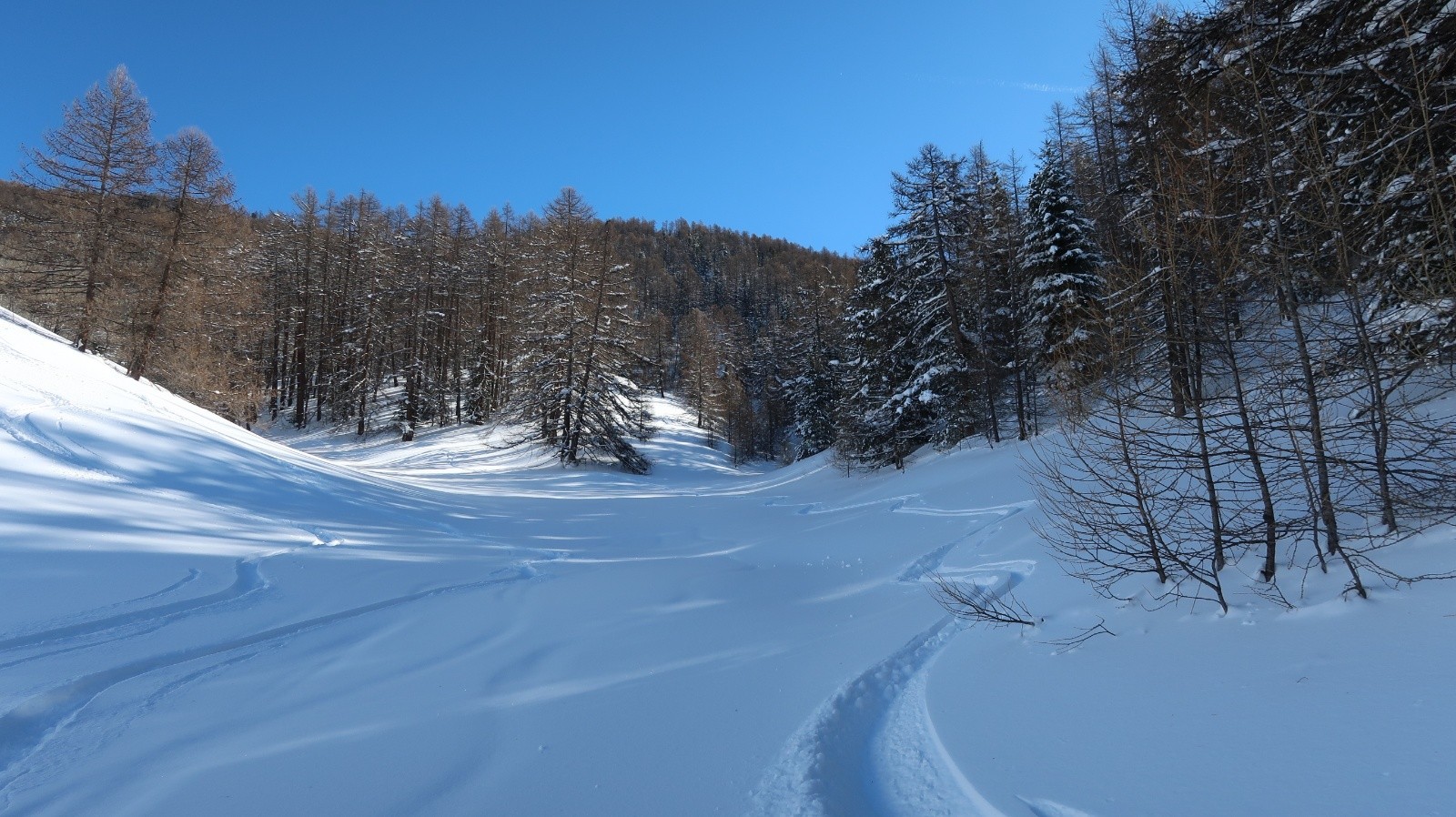 Le soleil est revenu sur le Queyras et les pentes sont recouvertes d'un blanc immaculé. Difficile de résister à l'appel de la montagne. Sur les conseils de Fabrice du gîte "Les Arolles" je monte en direction du sommet Bûcher afin d'avoir une idée des possibilités du secteur. La neige est toute légère en forêt, pas de sous couche fragile à cette altitude, pas de travail du vent. Je descends plein ouest dans le mélézin appelé Bois Noir, du ski de rêve avec de la pente. Arrivé près du torrent de Bramousse, je longe le GR5 puis remonte dans le Bois des Vallonnets. Je trouve une trace bien faite qui me conduit au Serre des Vallonnets. J'entame la plus belle descente de la saison versant nord est en passant par la Chapelle St Simon. Enfin de la pente dans une poudreuse de cinéma, c'est parfait jusqu'en bas. Une journée queyrassine mémorable.