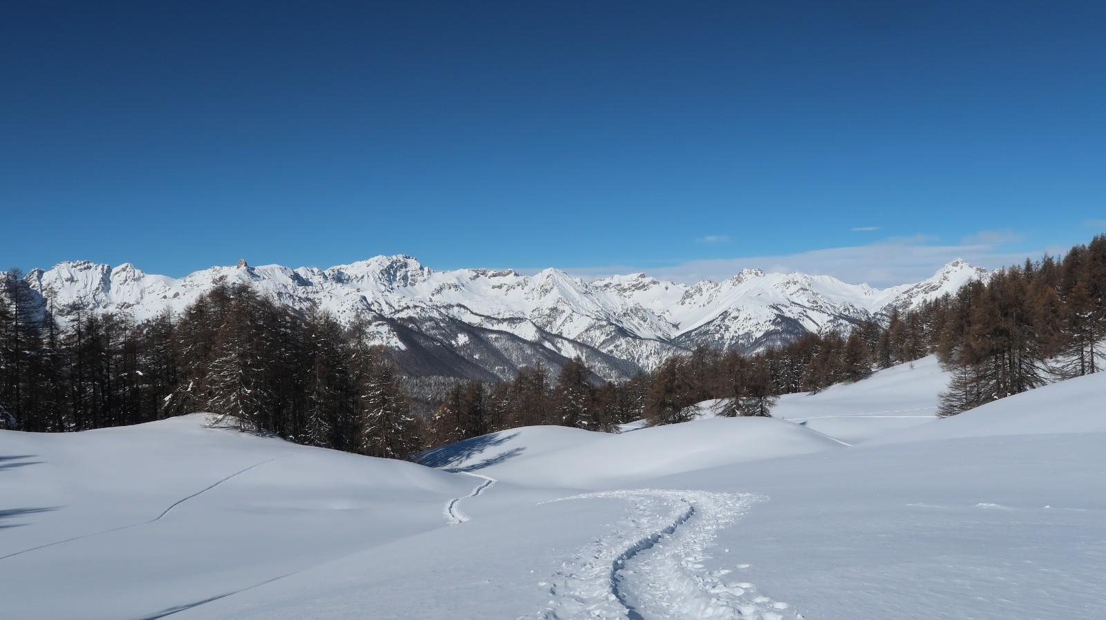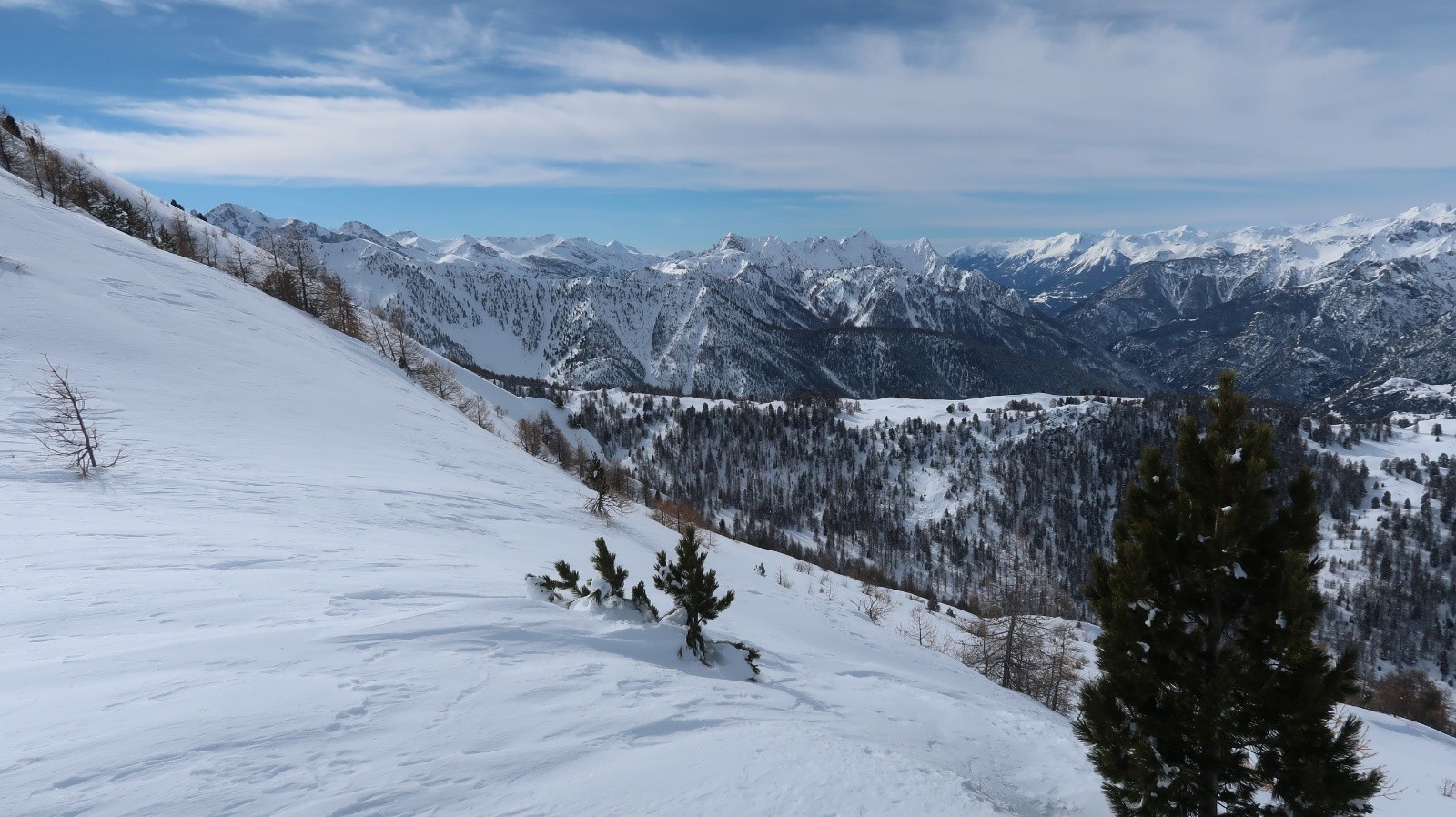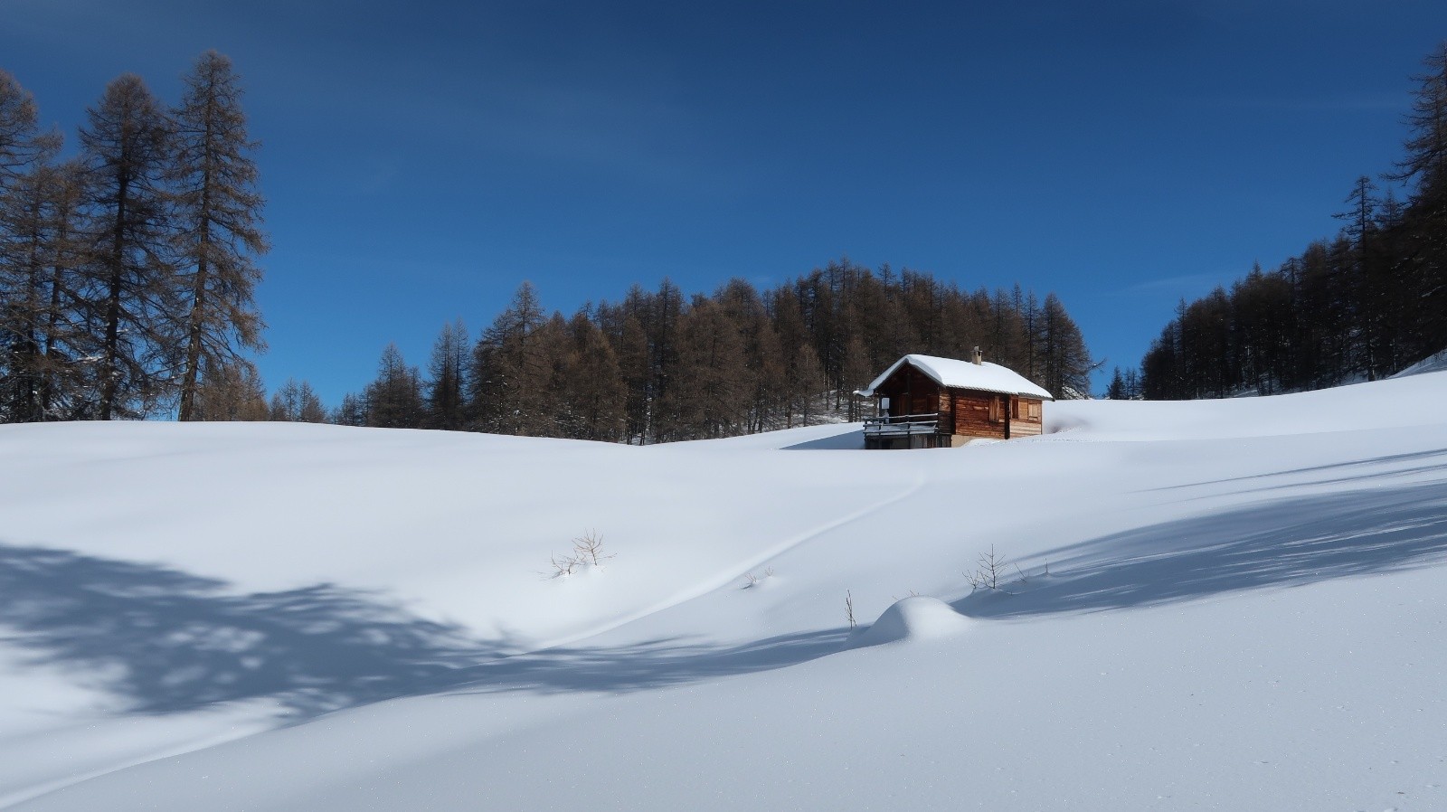 Le soleil est revenu sur le Queyras et les pentes sont recouvertes d'un blanc immaculé. Difficile de résister à l'appel de la montagne. Sur les conseils de Fabrice du gîte "Les Arolles" je monte en direction du sommet Bûcher afin d'avoir une idée des possibilités du secteur. La neige est toute légère en forêt, pas de sous couche fragile à cette altitude, pas de travail du vent. Je descends plein ouest dans le mélézin appelé Bois Noir, du ski de rêve avec de la pente. Arrivé près du torrent de Bramousse, je longe le GR5 puis remonte dans le Bois des Vallonnets. Je trouve une trace bien faite qui me conduit au Serre des Vallonnets. J'entame la plus belle descente de la saison versant nord est en passant par la Chapelle St Simon. Enfin de la pente dans une poudreuse de cinéma, c'est parfait jusqu'en bas. Une journée queyrassine mémorable.