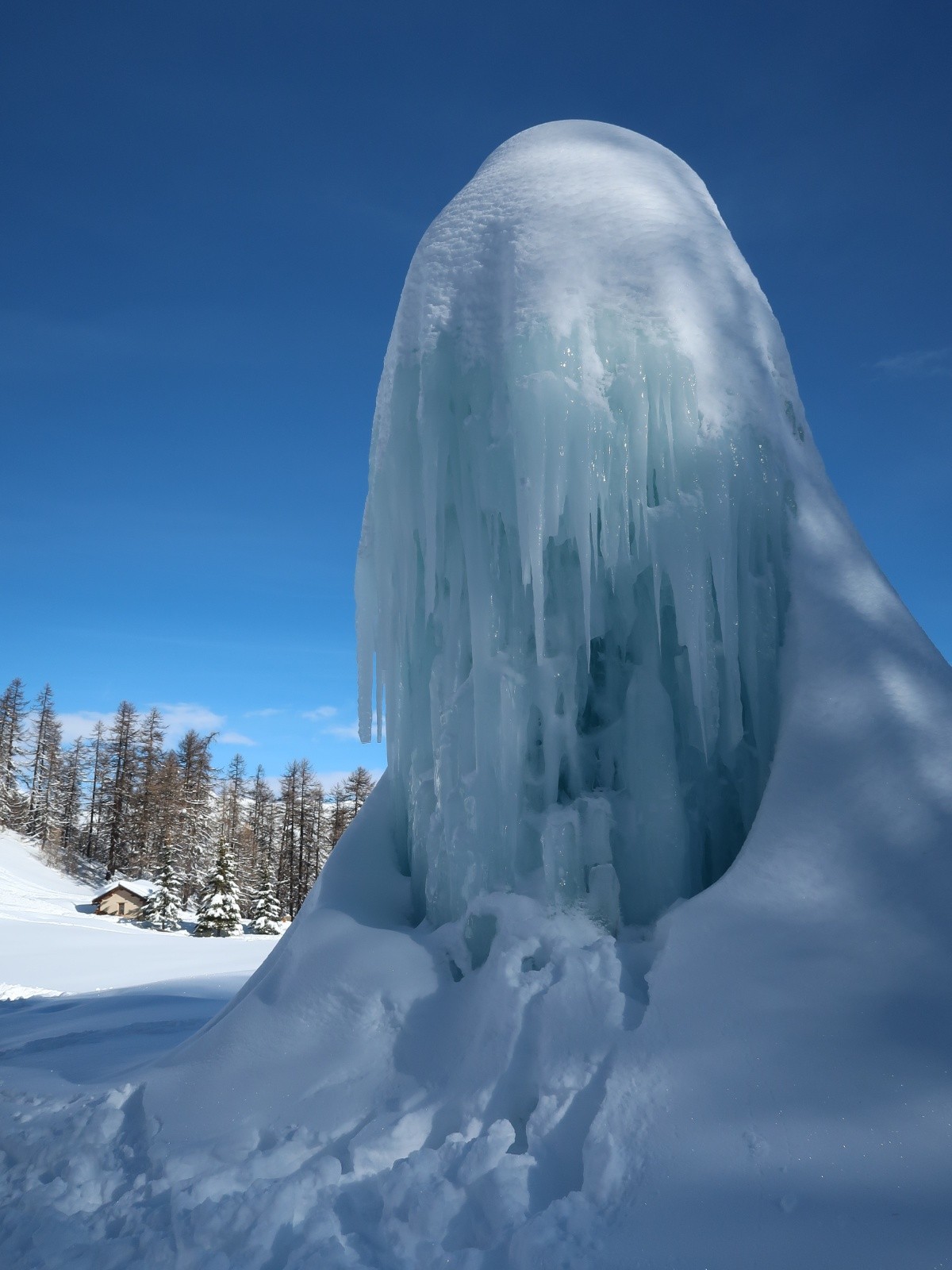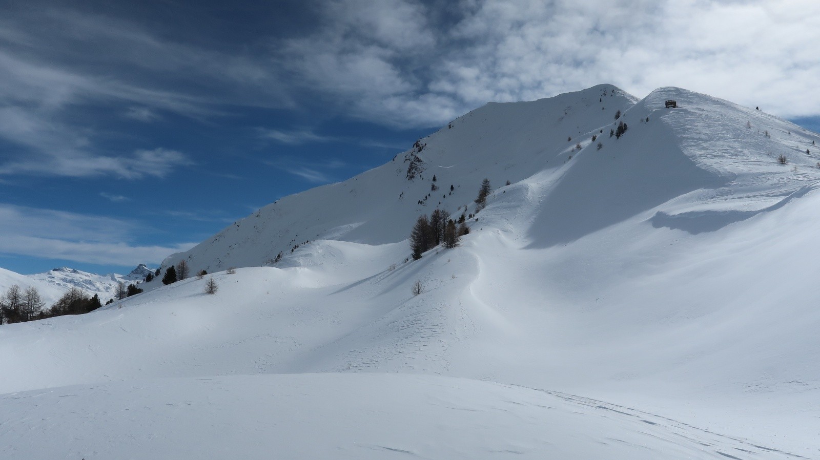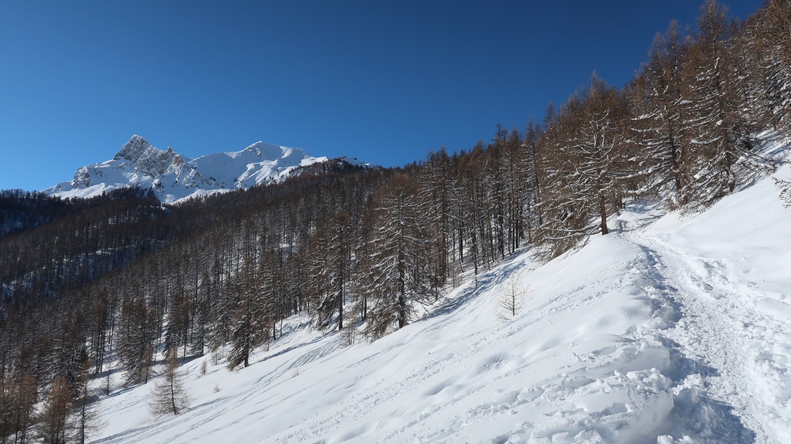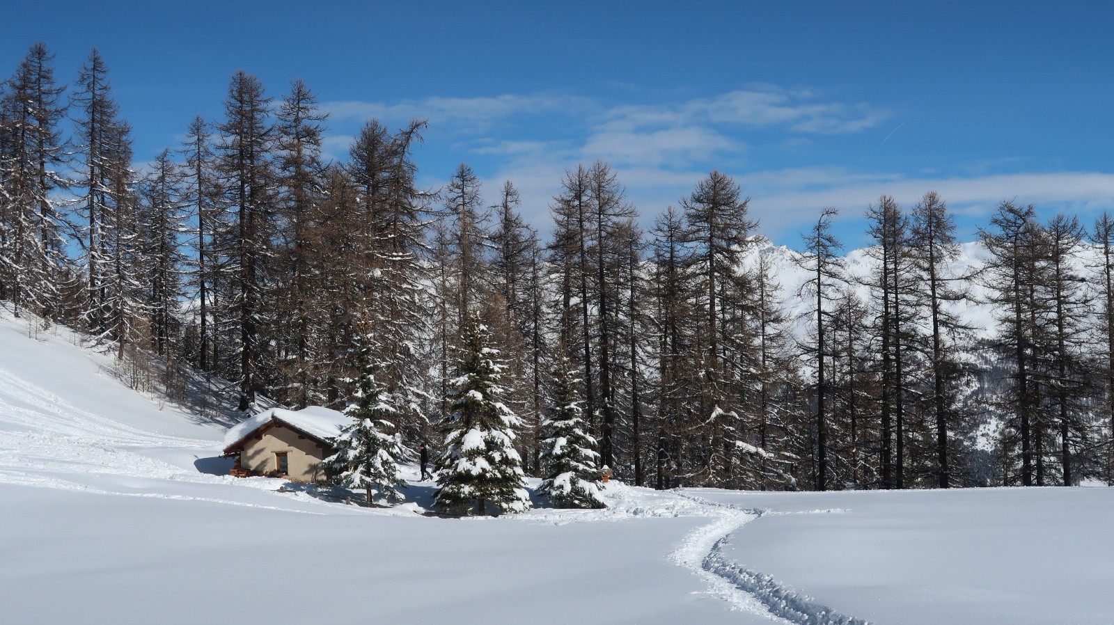 Le soleil est revenu sur le Queyras et les pentes sont recouvertes d'un blanc immaculé. Difficile de résister à l'appel de la montagne. Sur les conseils de Fabrice du gîte "Les Arolles" je monte en direction du sommet Bûcher afin d'avoir une idée des possibilités du secteur. La neige est toute légère en forêt, pas de sous couche fragile à cette altitude, pas de travail du vent. Je descends plein ouest dans le mélézin appelé Bois Noir, du ski de rêve avec de la pente. Arrivé près du torrent de Bramousse, je longe le GR5 puis remonte dans le Bois des Vallonnets. Je trouve une trace bien faite qui me conduit au Serre des Vallonnets. J'entame la plus belle descente de la saison versant nord est en passant par la Chapelle St Simon. Enfin de la pente dans une poudreuse de cinéma, c'est parfait jusqu'en bas. Une journée queyrassine mémorable.