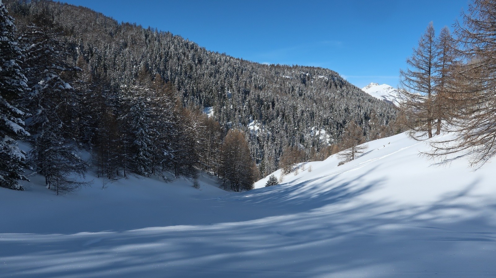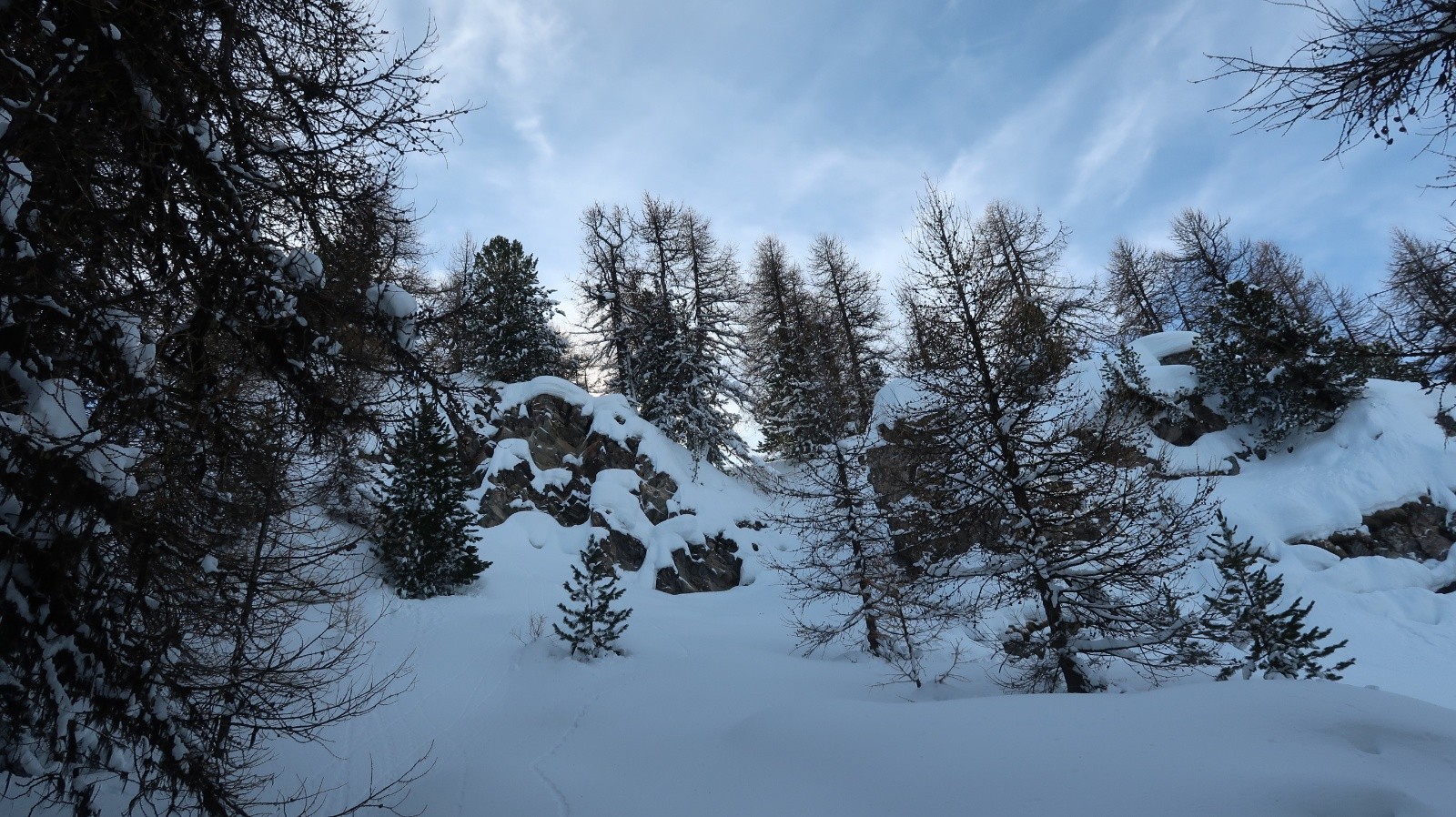 Conditions pour le ski : Excellentes de faut en bas sur toutes les orientations de ce secteur boisé.