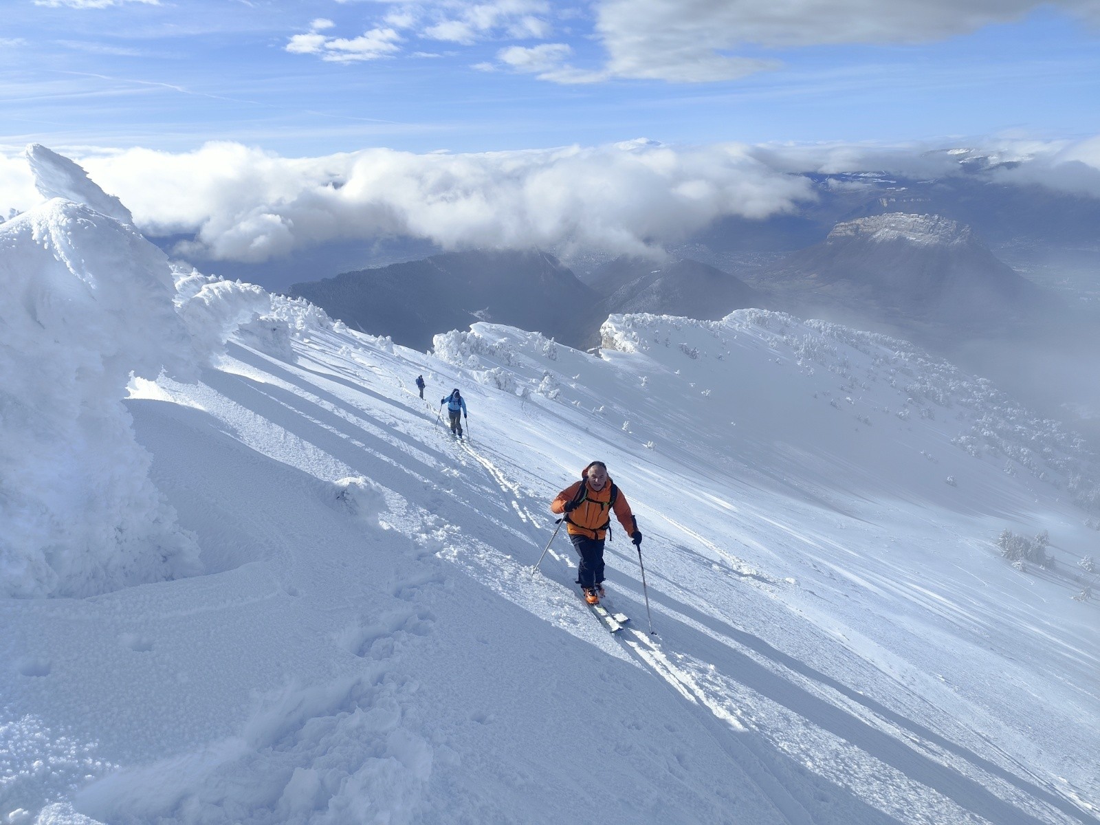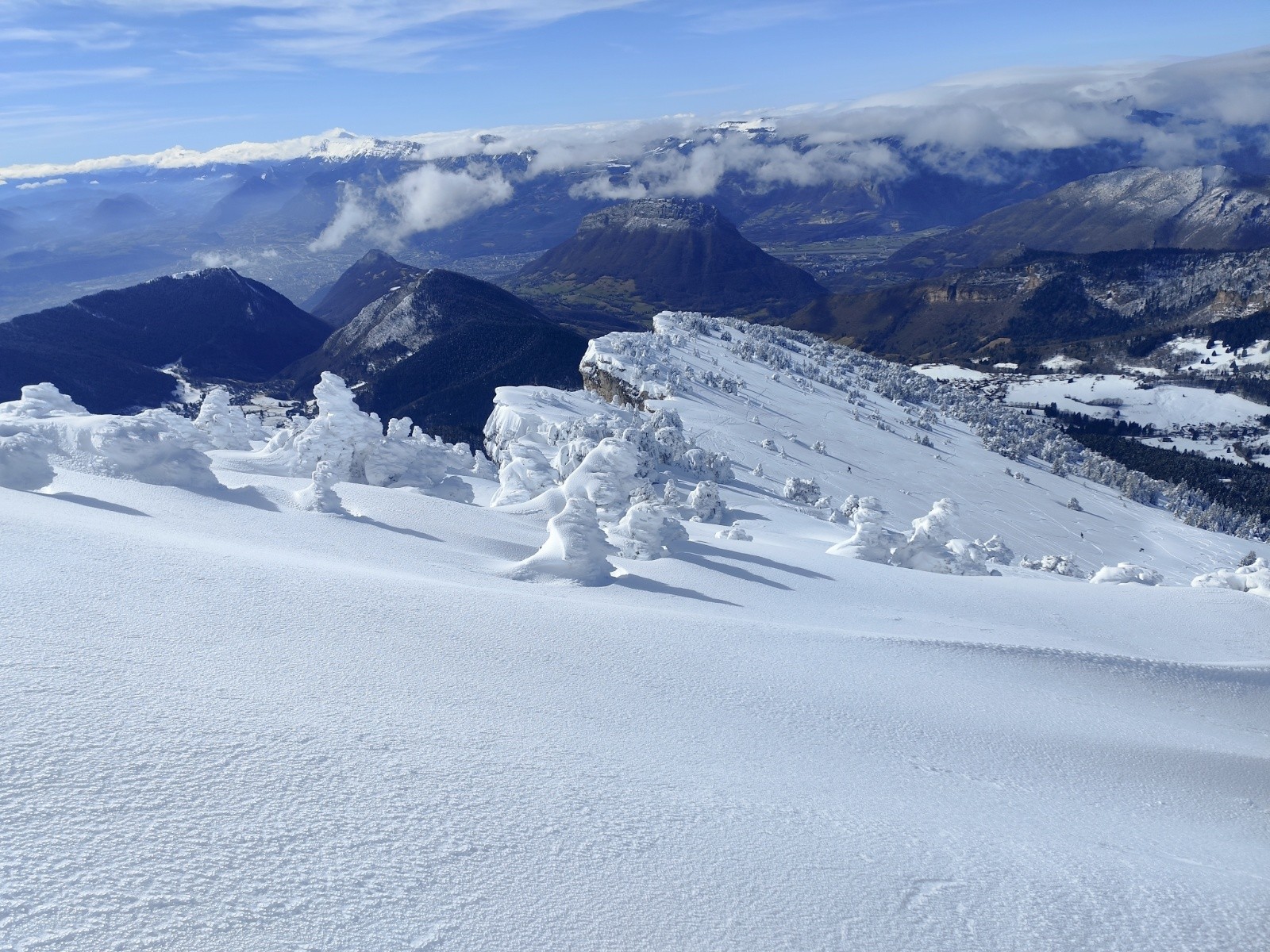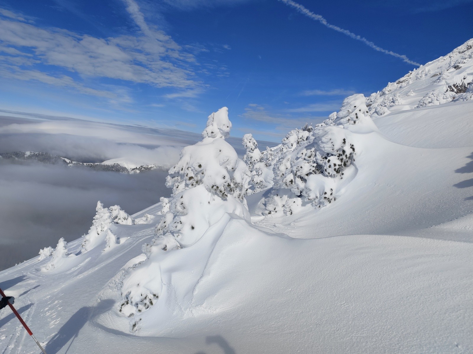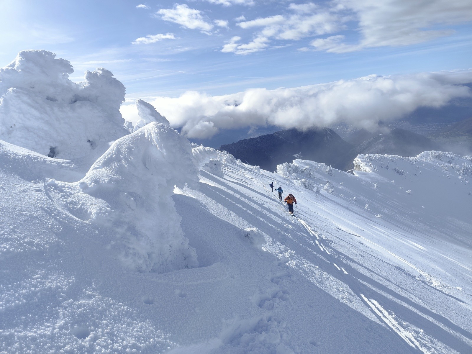 Le Point culminant du Massif de la Chartreuse, Chamechaude offrait ce matin un contraste saisissant entre les falaises austères de sa face Est, le gris froid du bas resté dans le brouillard et le haut surplombant la mer de nuages. Son décor tout blanchie ses sapins recouverts d'une neige sculptée par le vent aux multiples formes imaginaires. Cela faisait longtemps que l'on avait pas vu un paysage de carte postale au sommet du géant de chartreuse. La croix domine et est recouverte d'une épaisseur de neige exceptionnelle, l'accès au sommet se fait facilement à pieds (câble invisible), les corniches sculptées impressionnent. Ce sera pour certains leur premier Chamechaude à ski réalisé au bilan dans de bonnes conditions. La neige du haut invite à repeauter à plusieurs reprises, car bien agréable à skier avec en bonus, le soleil. Le bas est resté sous les nuages dans une neige bien plus lourde aux alentours de 1400m. On serait bien resté plus longtemps a tricoter autour de ses coins secrets mais on avait un horaire de retour pour midi. On terminera par le pas du lapin intégralement skiable vue les hauteurs de neige au plaisir d'y revenir.