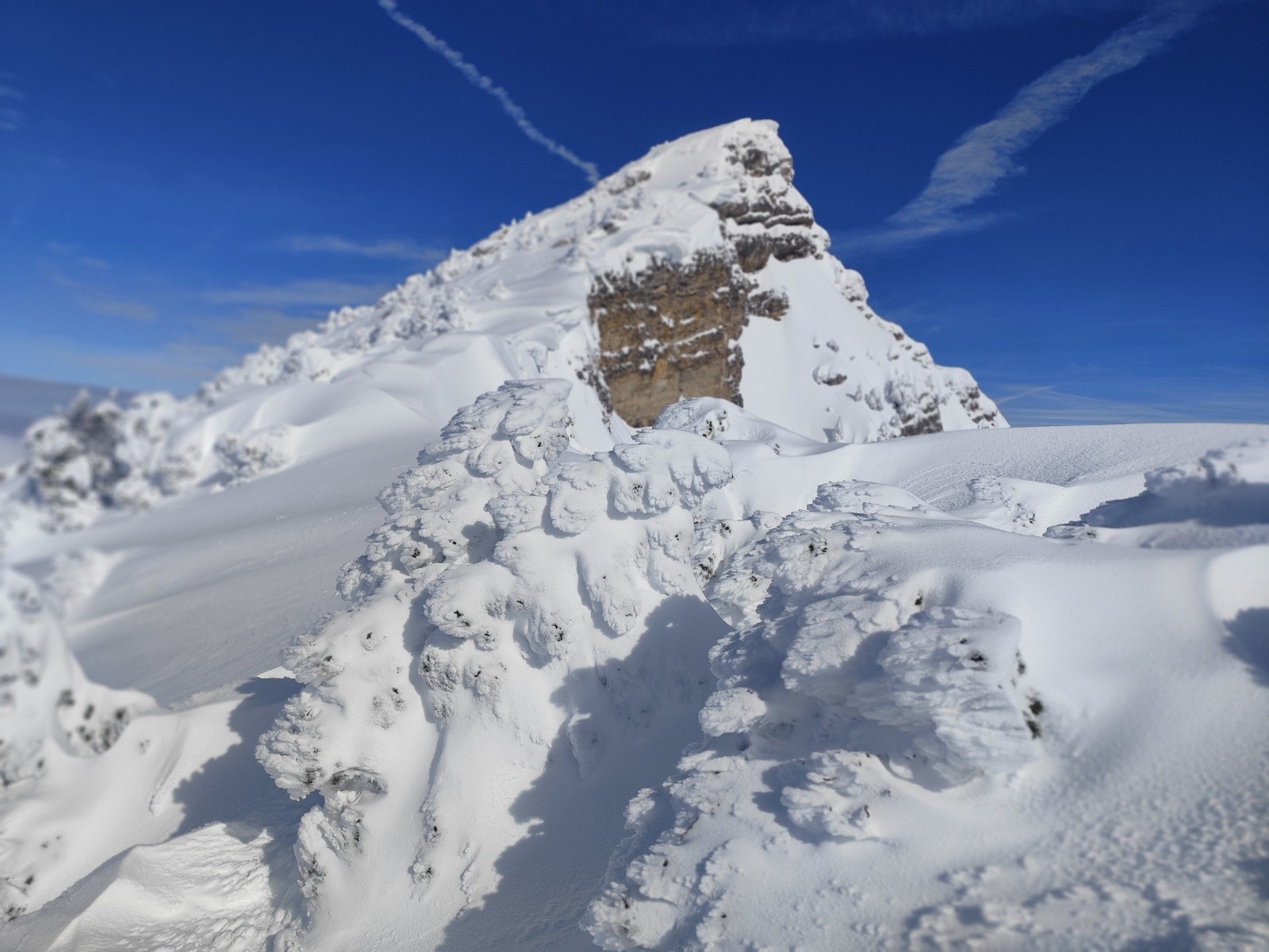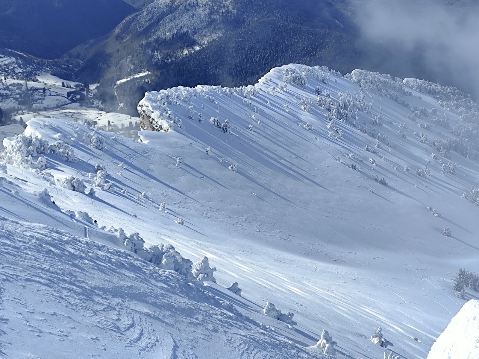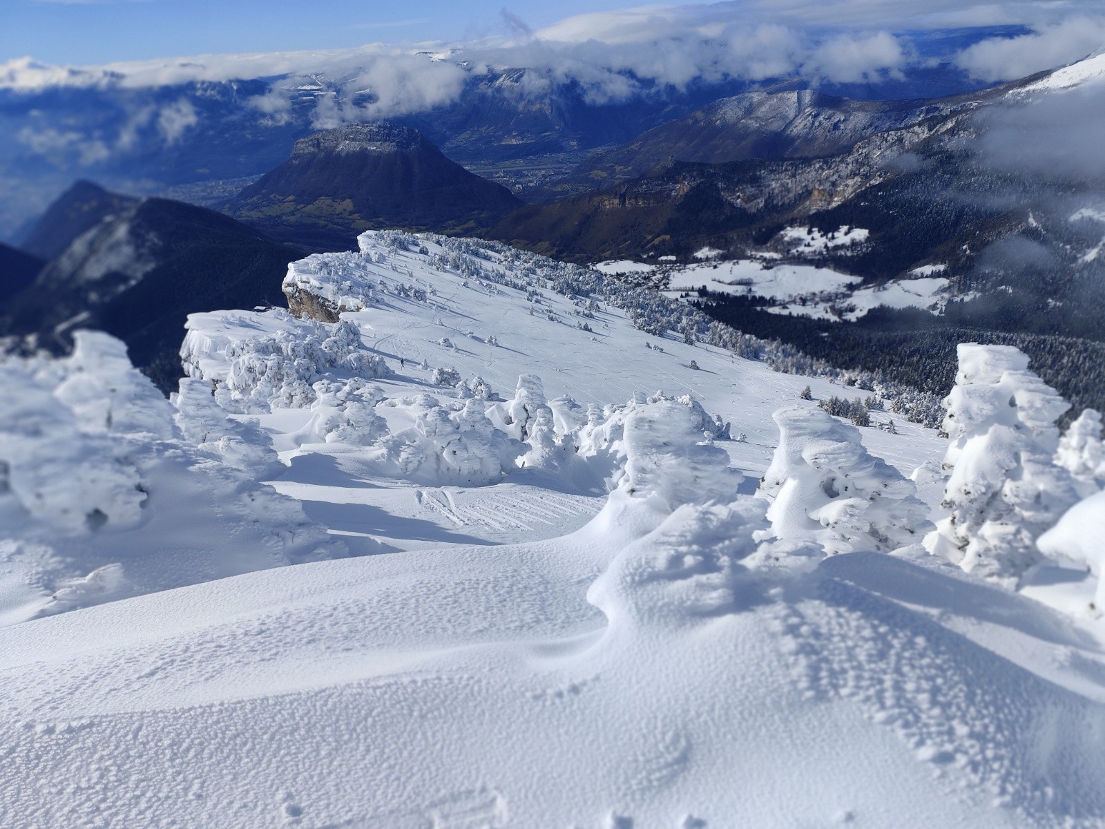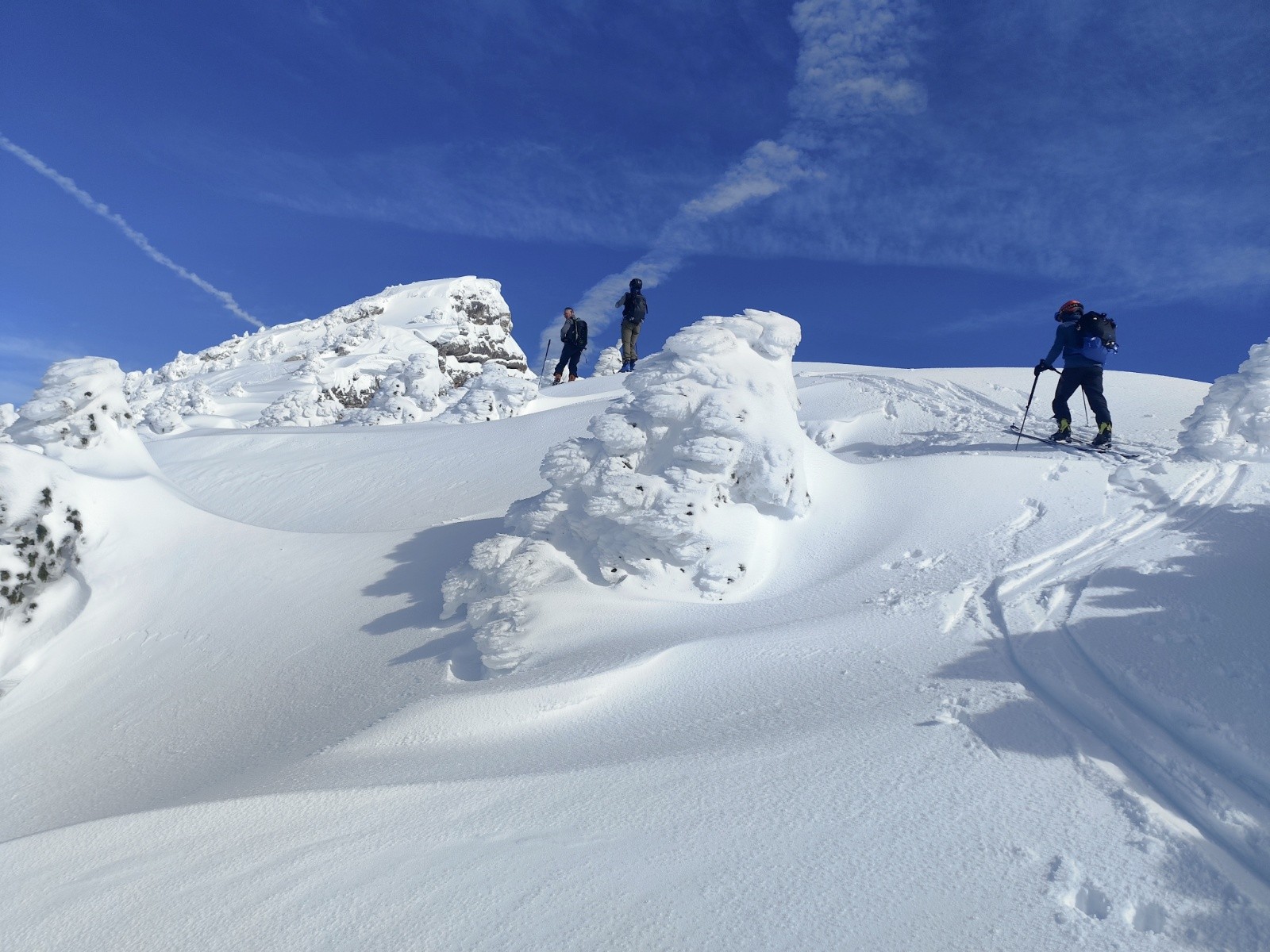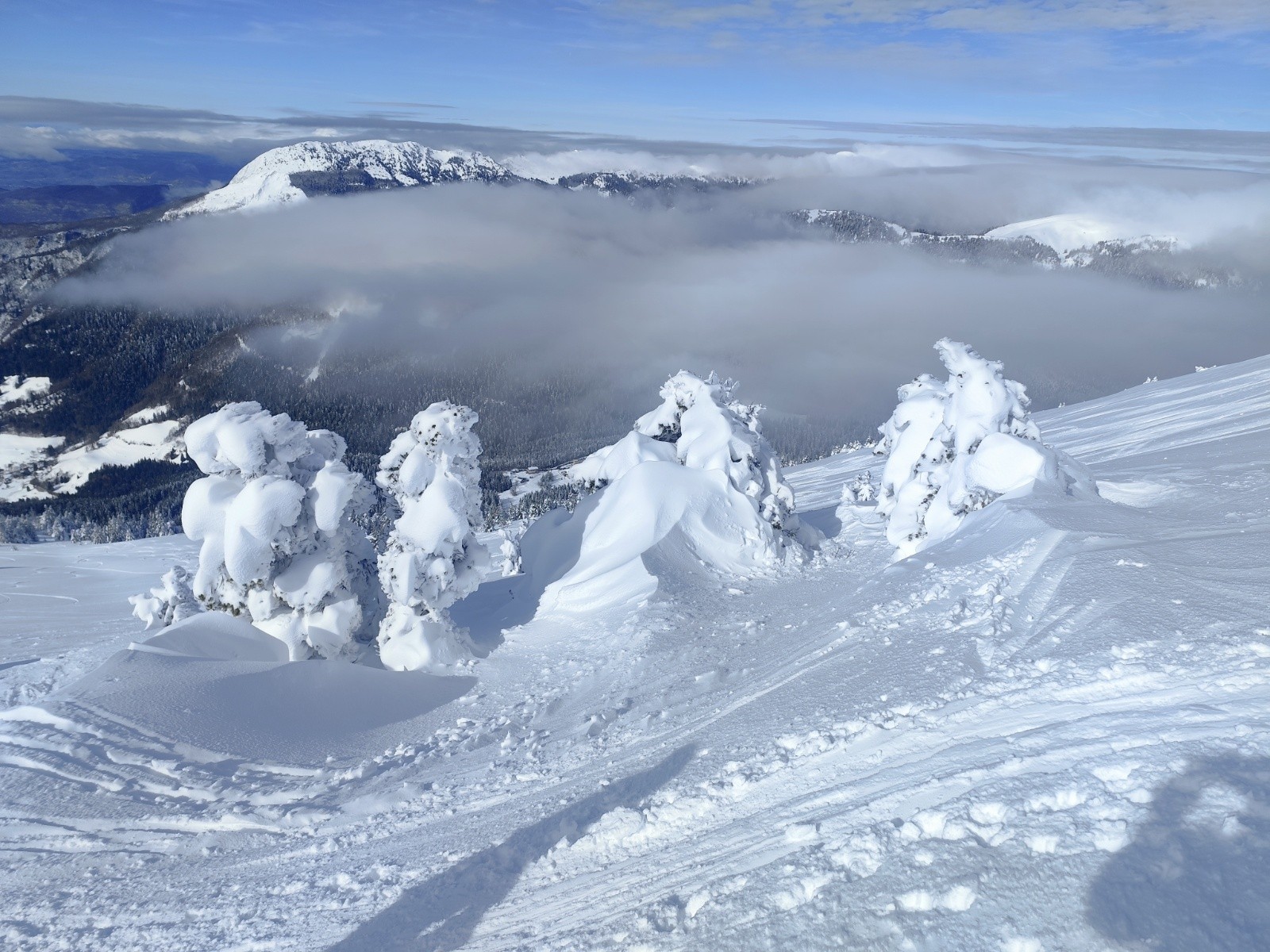 Le Point culminant du Massif de la Chartreuse, Chamechaude offrait ce matin un contraste saisissant entre les falaises austères de sa face Est, le gris froid du bas resté dans le brouillard et le haut surplombant la mer de nuages. Son décor tout blanchie ses sapins recouverts d'une neige sculptée par le vent aux multiples formes imaginaires. Cela faisait longtemps que l'on avait pas vu un paysage de carte postale au sommet du géant de chartreuse. La croix domine et est recouverte d'une épaisseur de neige exceptionnelle, l'accès au sommet se fait facilement à pieds (câble invisible), les corniches sculptées impressionnent. Ce sera pour certains leur premier Chamechaude à ski réalisé au bilan dans de bonnes conditions. La neige du haut invite à repeauter à plusieurs reprises, car bien agréable à skier avec en bonus, le soleil. Le bas est resté sous les nuages dans une neige bien plus lourde aux alentours de 1400m. On serait bien resté plus longtemps a tricoter autour de ses coins secrets mais on avait un horaire de retour pour midi. On terminera par le pas du lapin intégralement skiable vue les hauteurs de neige au plaisir d'y revenir.
