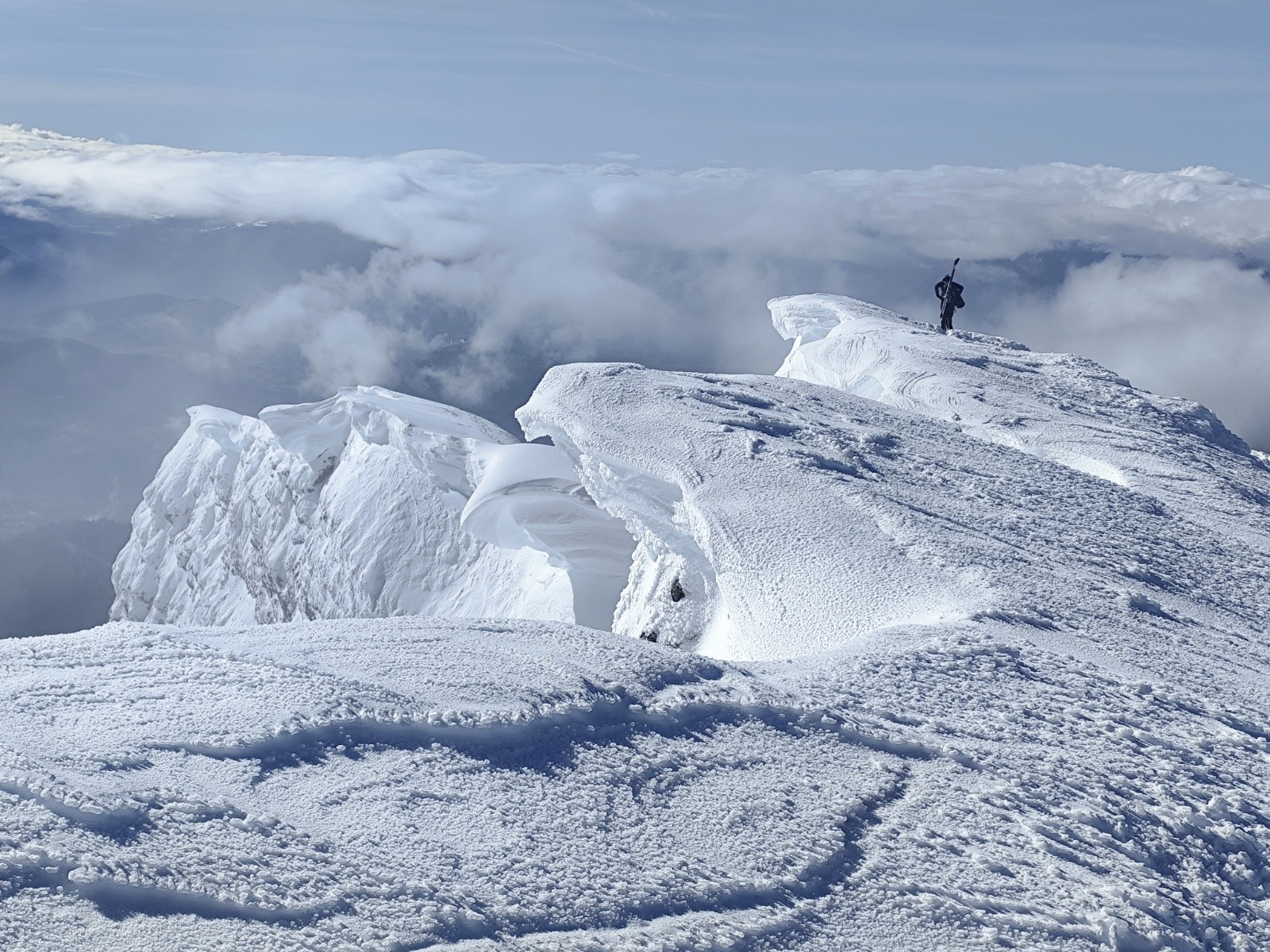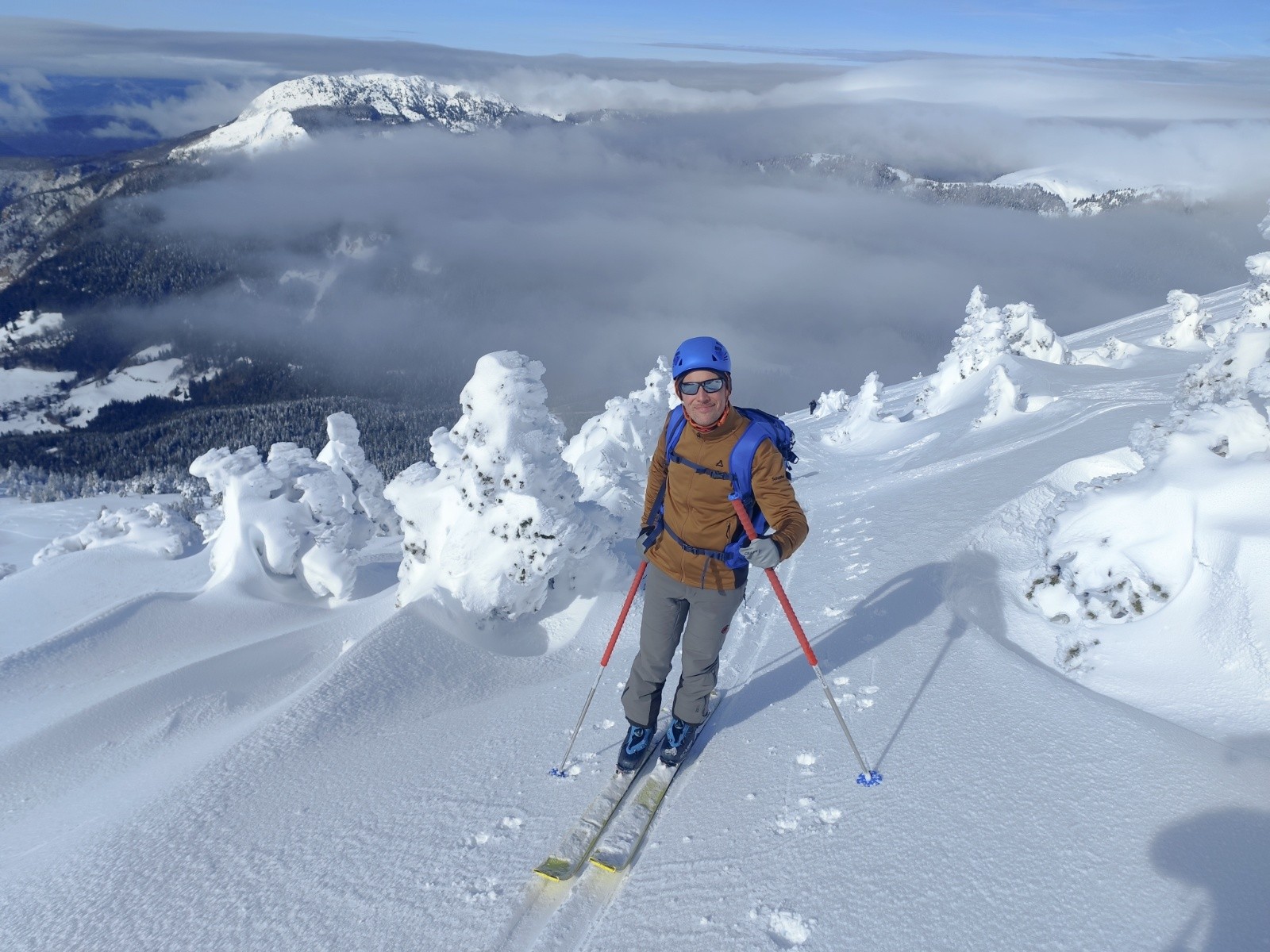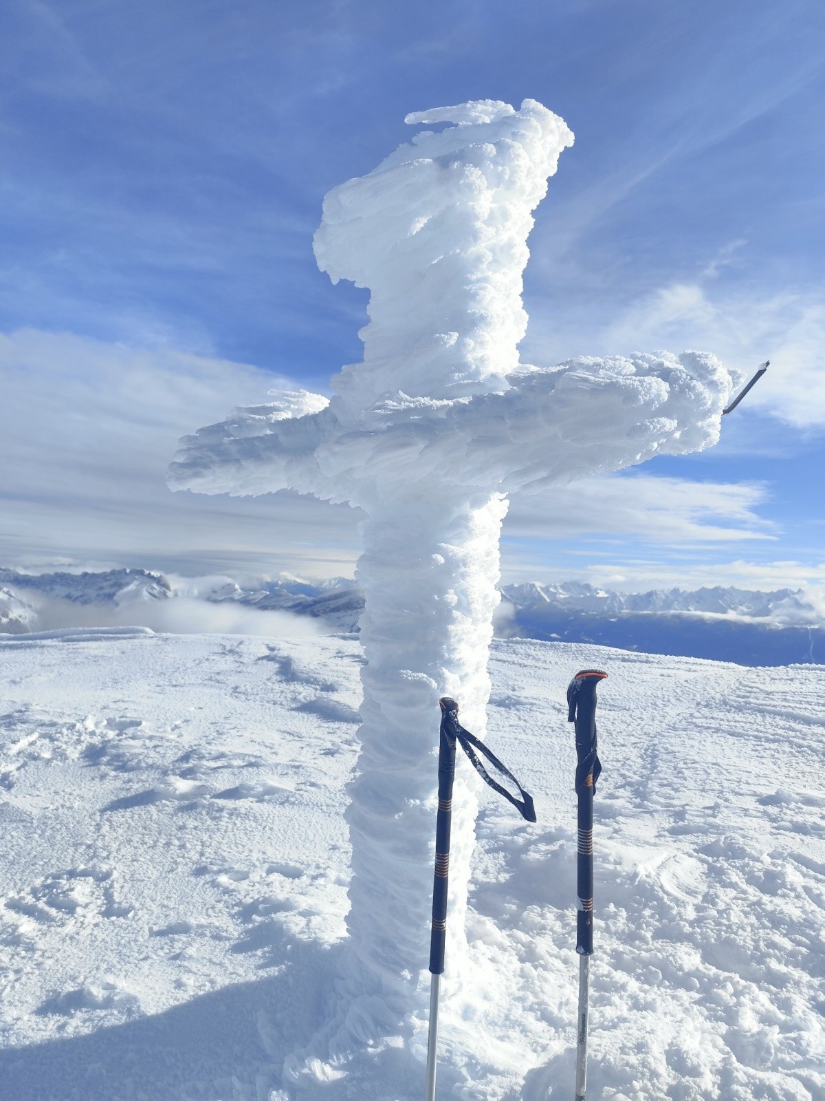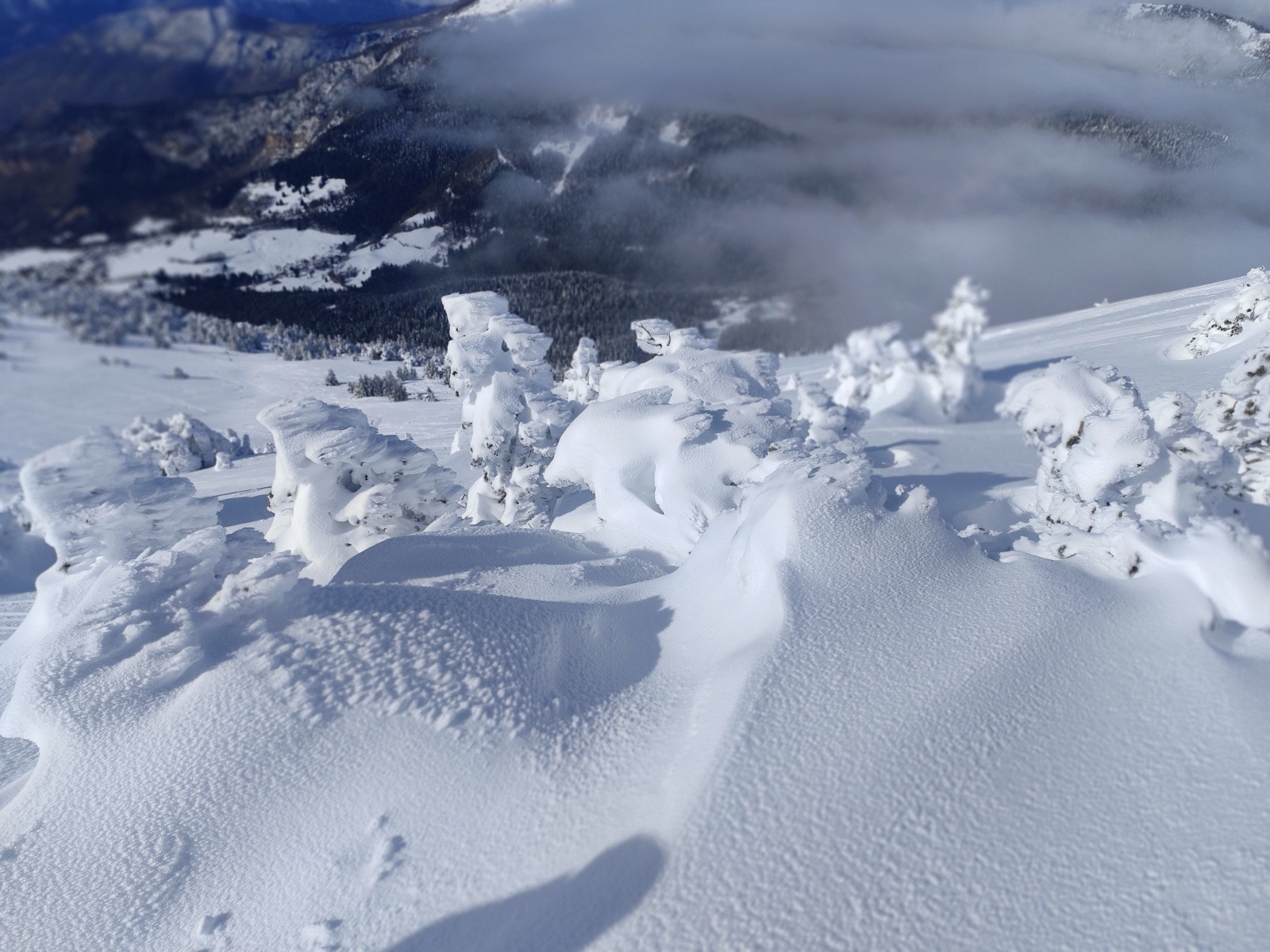 Le Point culminant du Massif de la Chartreuse, Chamechaude offrait ce matin un contraste saisissant entre les falaises austères de sa face Est, le gris froid du bas resté dans le brouillard et le haut surplombant la mer de nuages. Son décor tout blanchie ses sapins recouverts d'une neige sculptée par le vent aux multiples formes imaginaires. Cela faisait longtemps que l'on avait pas vu un paysage de carte postale au sommet du géant de chartreuse. La croix domine et est recouverte d'une épaisseur de neige exceptionnelle, l'accès au sommet se fait facilement à pieds (câble invisible), les corniches sculptées impressionnent. Ce sera pour certains leur premier Chamechaude à ski réalisé au bilan dans de bonnes conditions. La neige du haut invite à repeauter à plusieurs reprises, car bien agréable à skier avec en bonus, le soleil. Le bas est resté sous les nuages dans une neige bien plus lourde aux alentours de 1400m. On serait bien resté plus longtemps a tricoter autour de ses coins secrets mais on avait un horaire de retour pour midi. On terminera par le pas du lapin intégralement skiable vue les hauteurs de neige au plaisir d'y revenir.