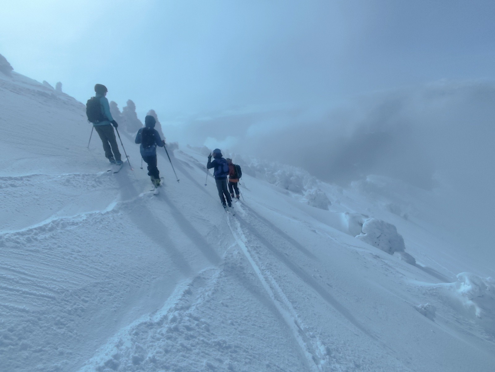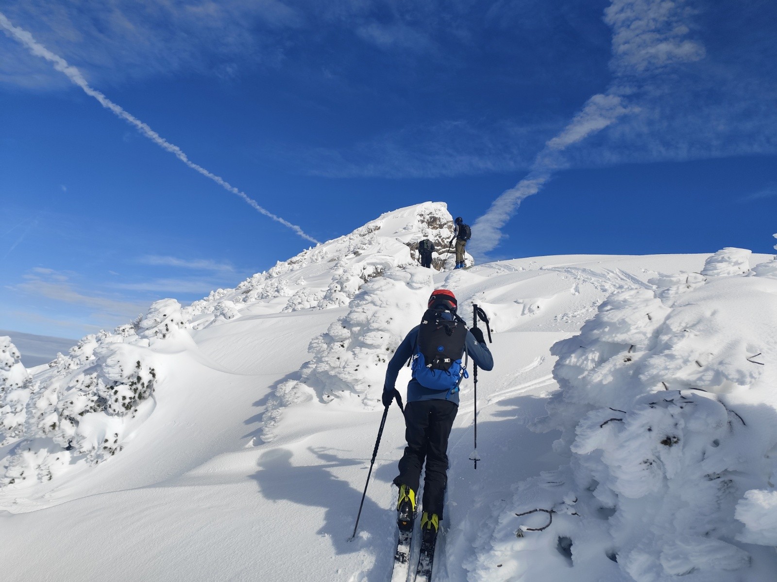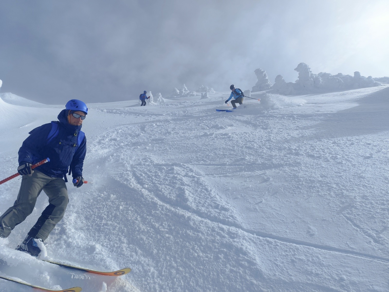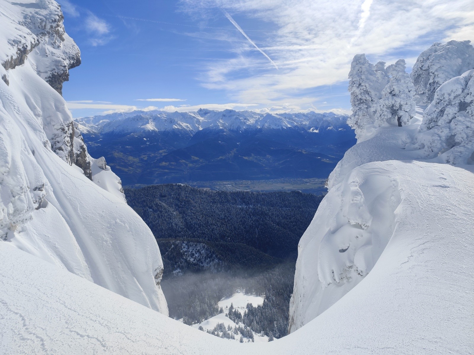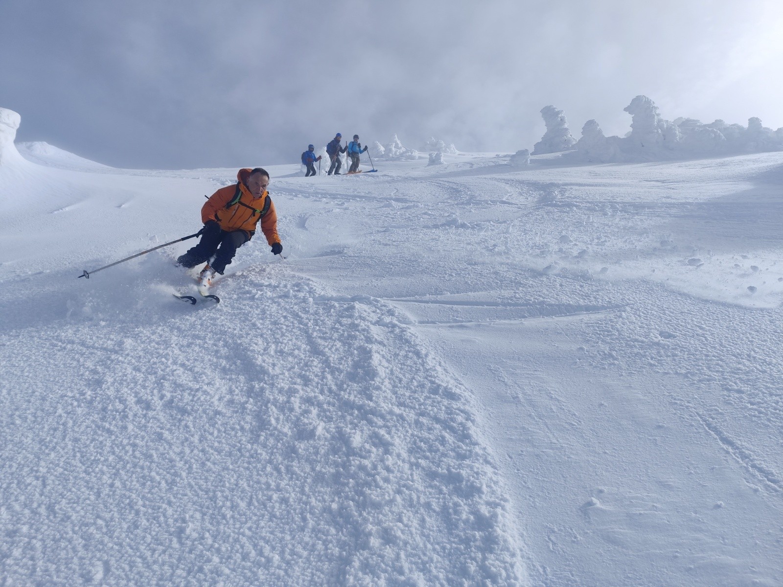 Le Point culminant du Massif de la Chartreuse, Chamechaude offrait ce matin un contraste saisissant entre les falaises austères de sa face Est, le gris froid du bas resté dans le brouillard et le haut surplombant la mer de nuages. Son décor tout blanchie ses sapins recouverts d'une neige sculptée par le vent aux multiples formes imaginaires. Cela faisait longtemps que l'on avait pas vu un paysage de carte postale au sommet du géant de chartreuse. La croix domine et est recouverte d'une épaisseur de neige exceptionnelle, l'accès au sommet se fait facilement à pieds (câble invisible), les corniches sculptées impressionnent. Ce sera pour certains leur premier Chamechaude à ski réalisé au bilan dans de bonnes conditions. La neige du haut invite à repeauter à plusieurs reprises, car bien agréable à skier avec en bonus, le soleil. Le bas est resté sous les nuages dans une neige bien plus lourde aux alentours de 1400m. On serait bien resté plus longtemps a tricoter autour de ses coins secrets mais on avait un horaire de retour pour midi. On terminera par le pas du lapin intégralement skiable vue les hauteurs de neige au plaisir d'y revenir.