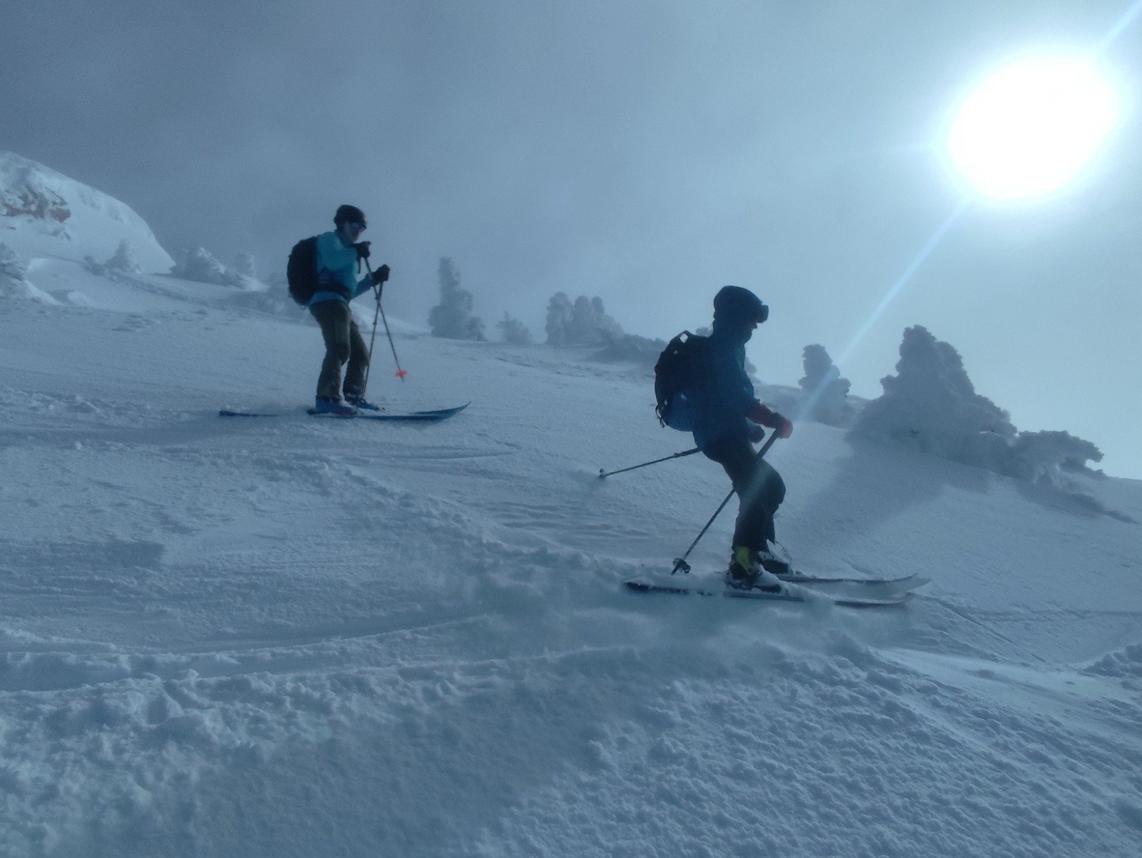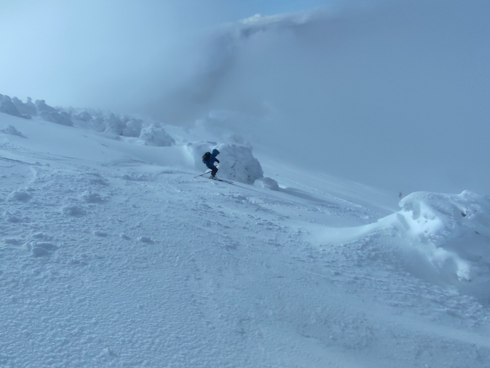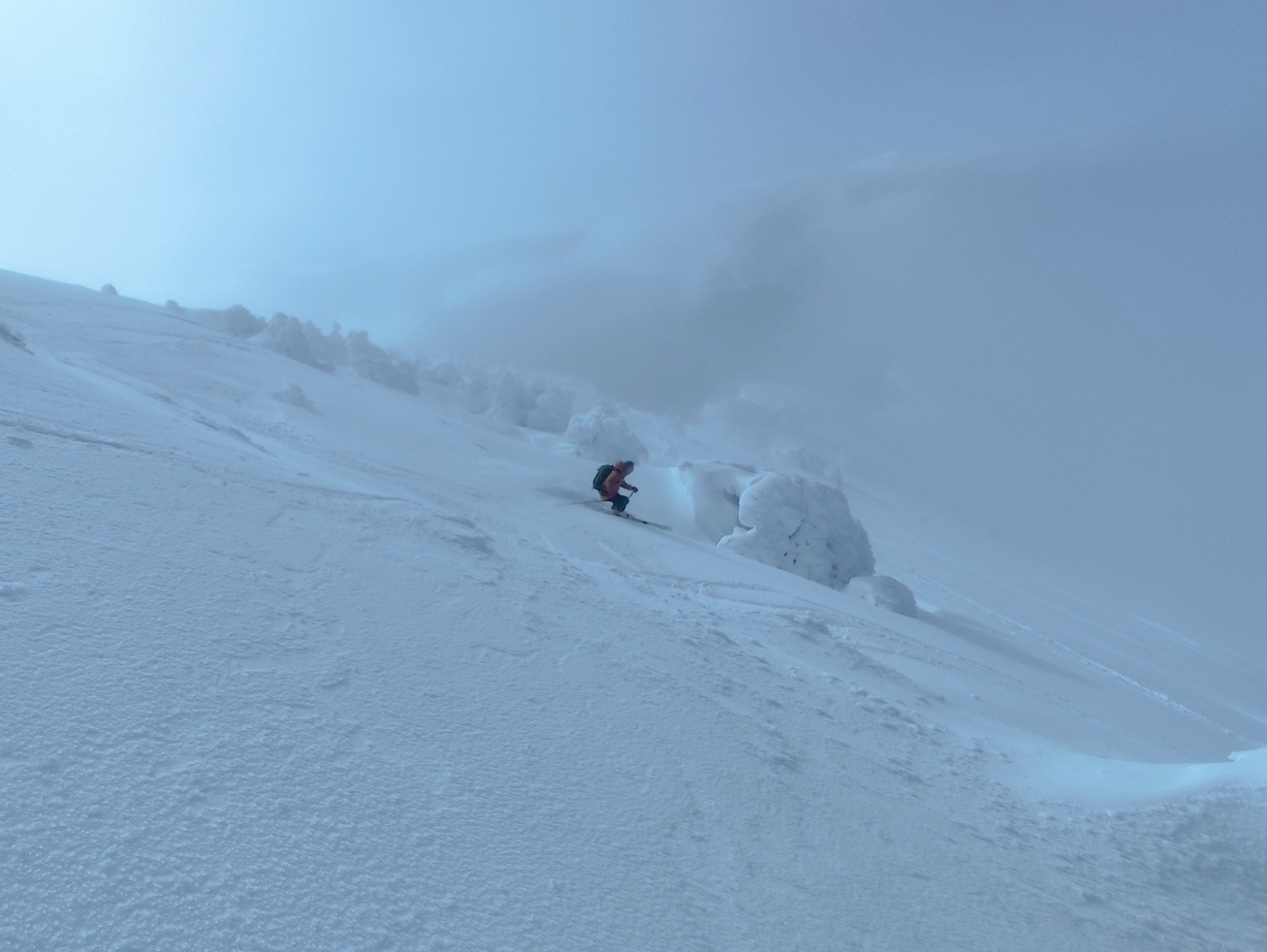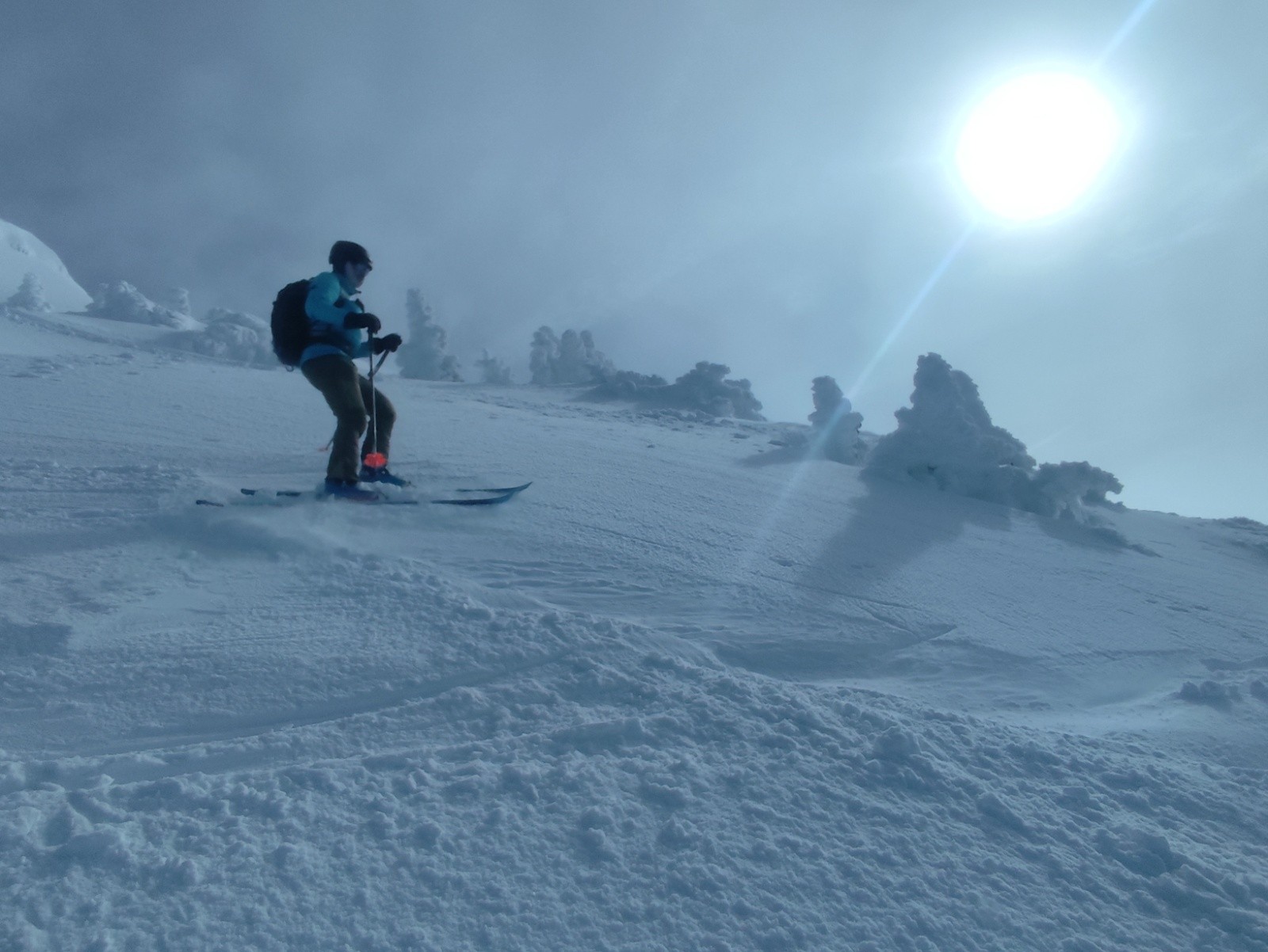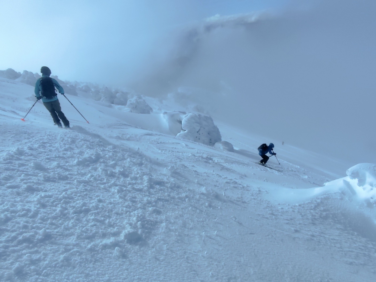 Sous le sommet, quelques parties en neige durcies et ventées, poudreuse tassée qui passe bien
