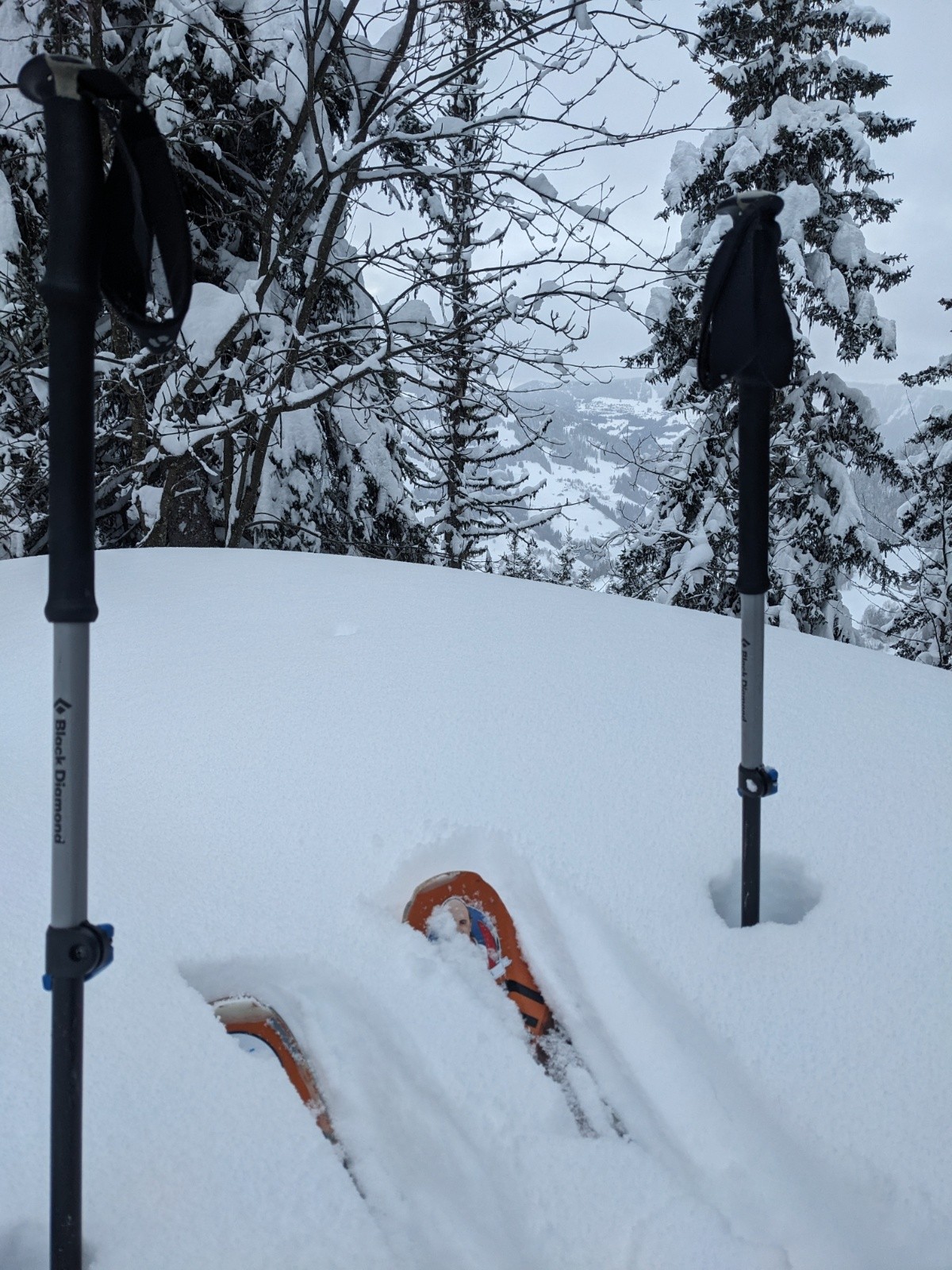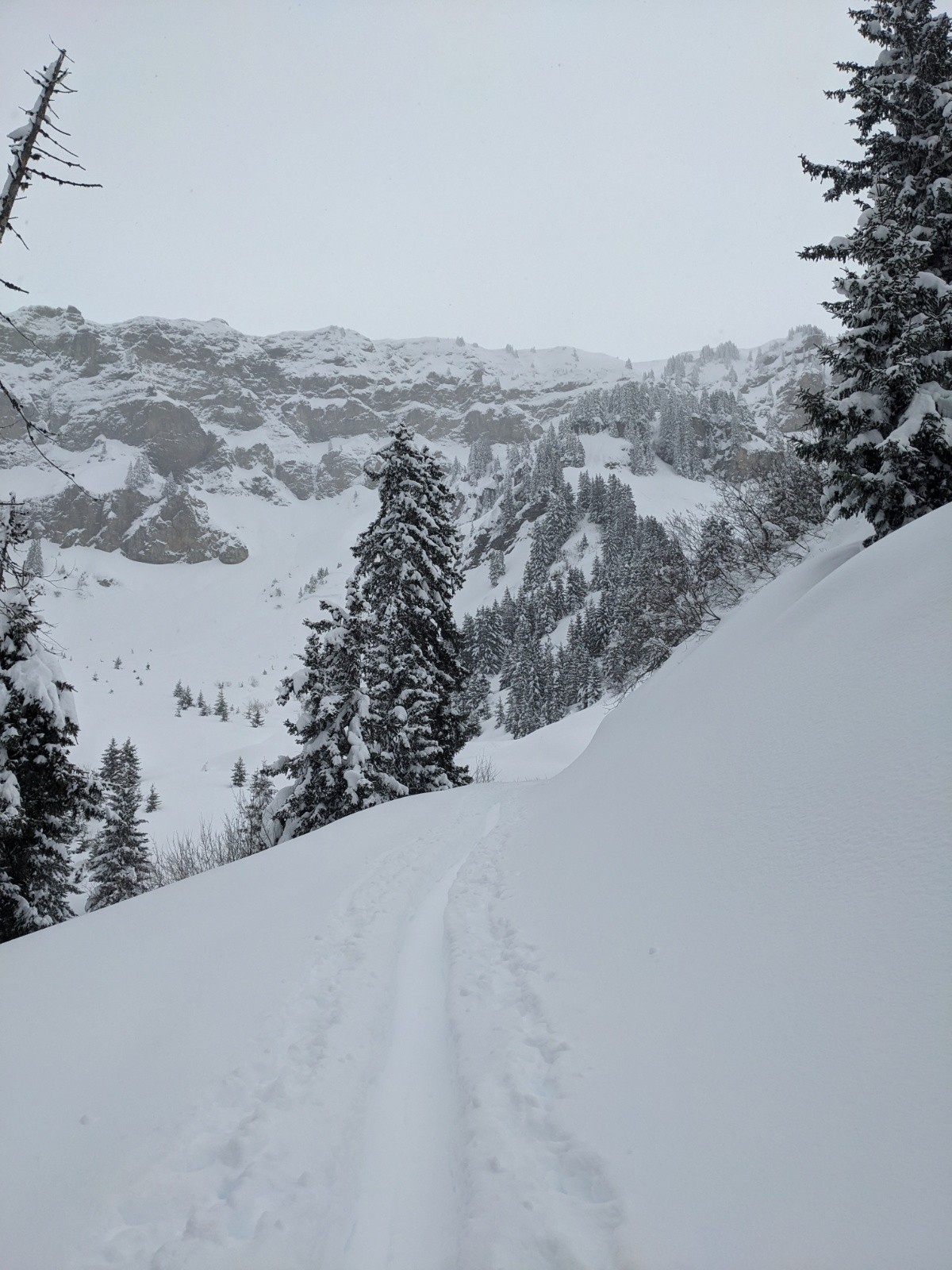 Vers 1400 m / 1500m, de premiers signes me font dire que la neige commence à être meilleure, cela se confirme vite. Les "gentils" traceurs avaient filés plein ouest, je vise nord ouest où c'est super bon ! Petit repeautage avec une mission dans une neige bien profonde le temps de retrouver la trace de montée, les arbres sont d'un grand secours (c'est un peu crouté en dessous). Deuxième descente toujours vers Les Plans où c'est parfait jusqu'à 1500 m, encore skiable sur une centaine de D+ puis pourri.