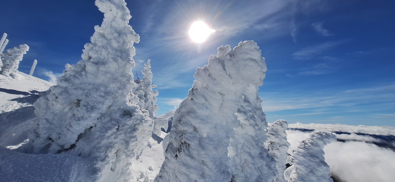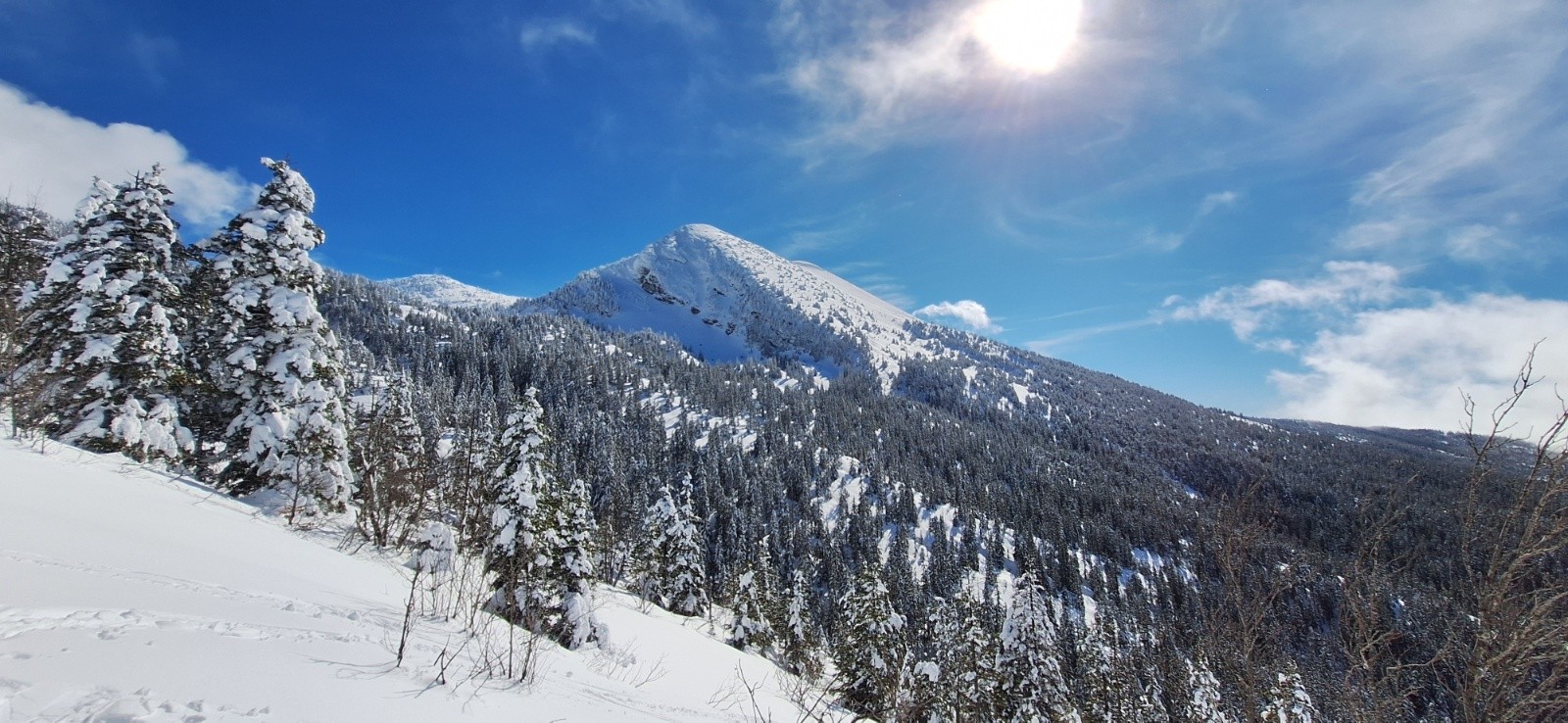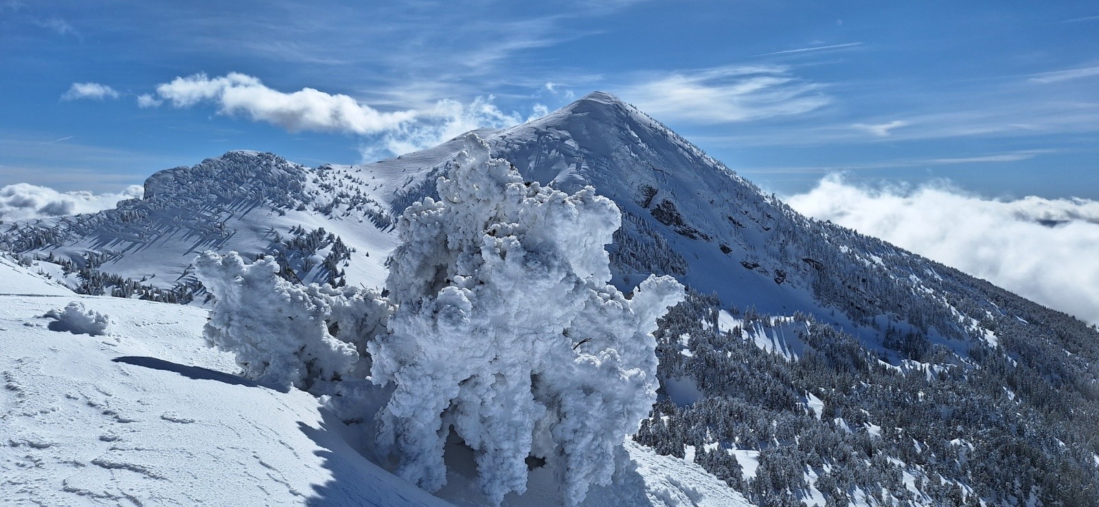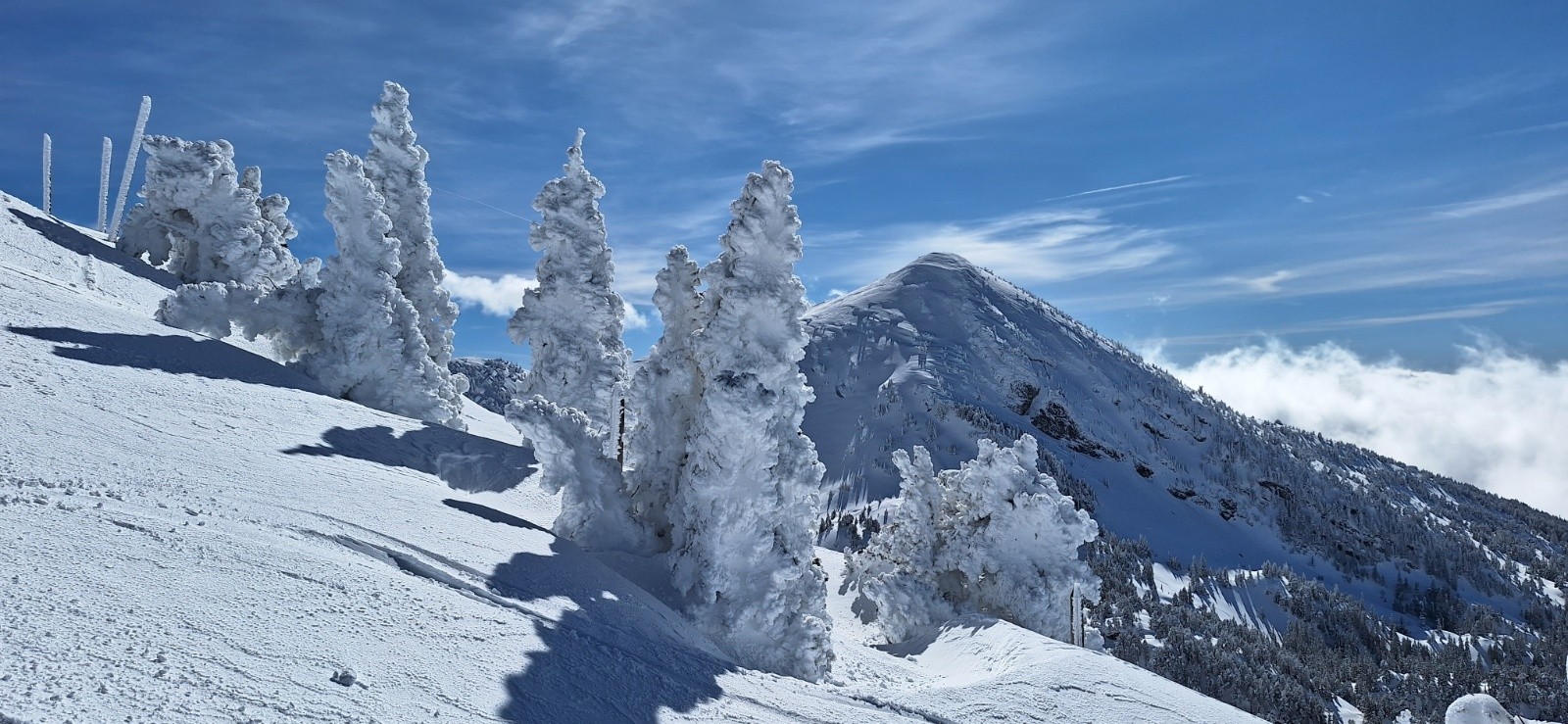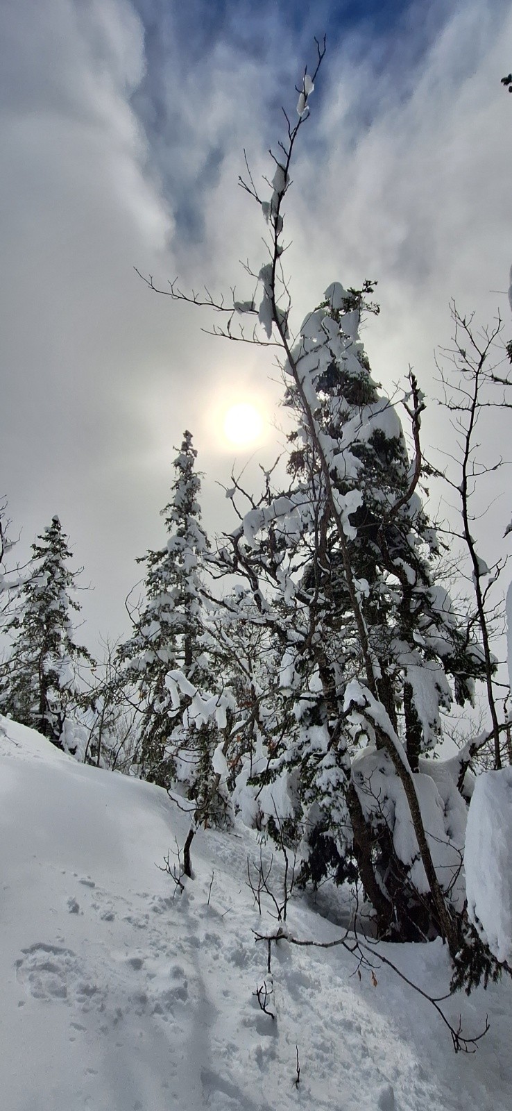 On remonte comme précédemment un peu à fond les ballons pour ne pas faire trop attendre Elodie et papa... Mais c'est là que l'éclaircie arrive enfin et nous offre une superbe vue sur le sommet qu'on avait fait dans le brouillard matinal🤩. Du coup après un coup de téléphone on continue pour profiter un peu du beau temps pendant qu'en bas ça boit le vin chaud🍷. La prolongation de la montée est bien sympa même si les pistes sont très proches. Les arbres sont meringués, splendides😍!