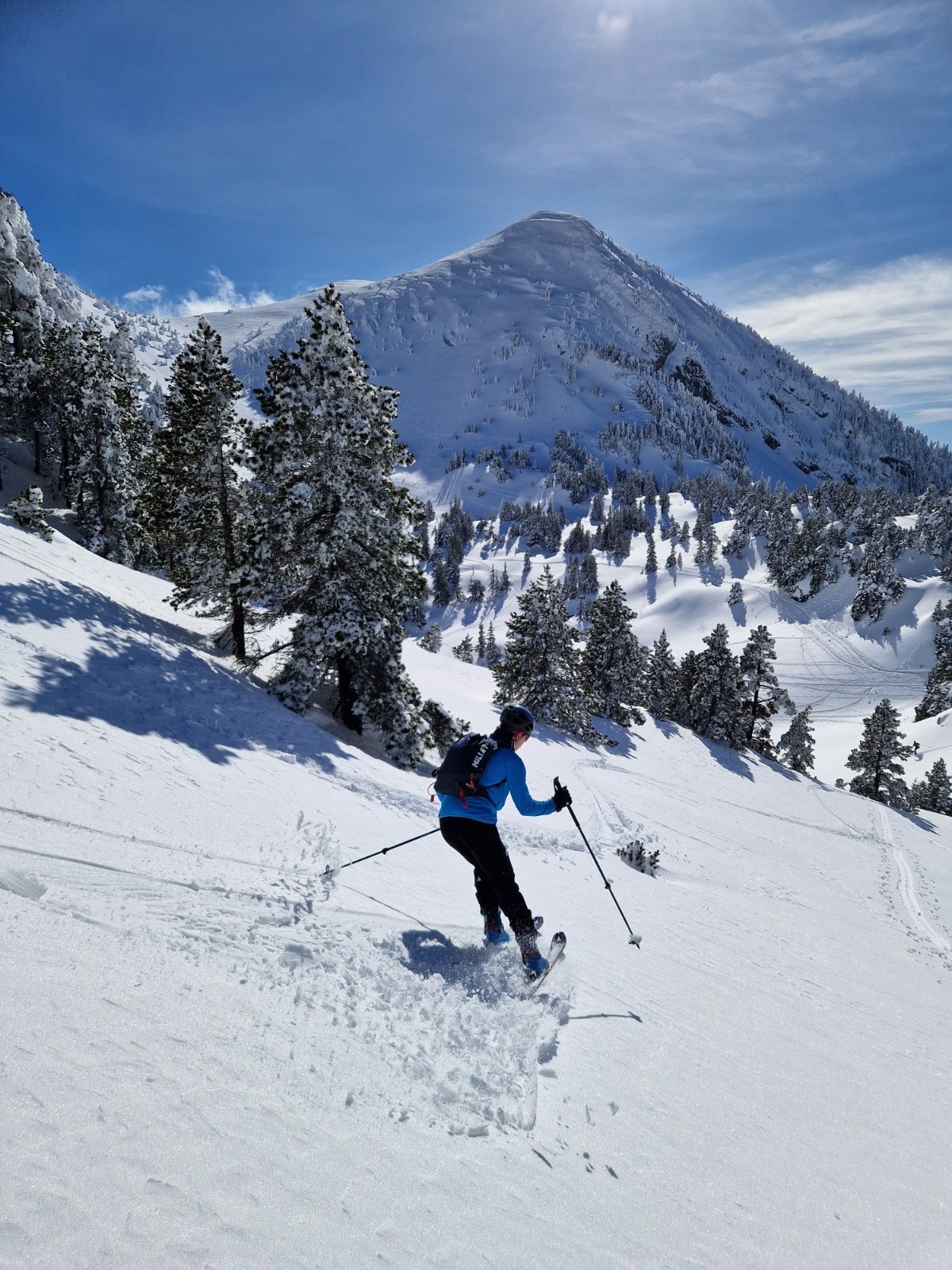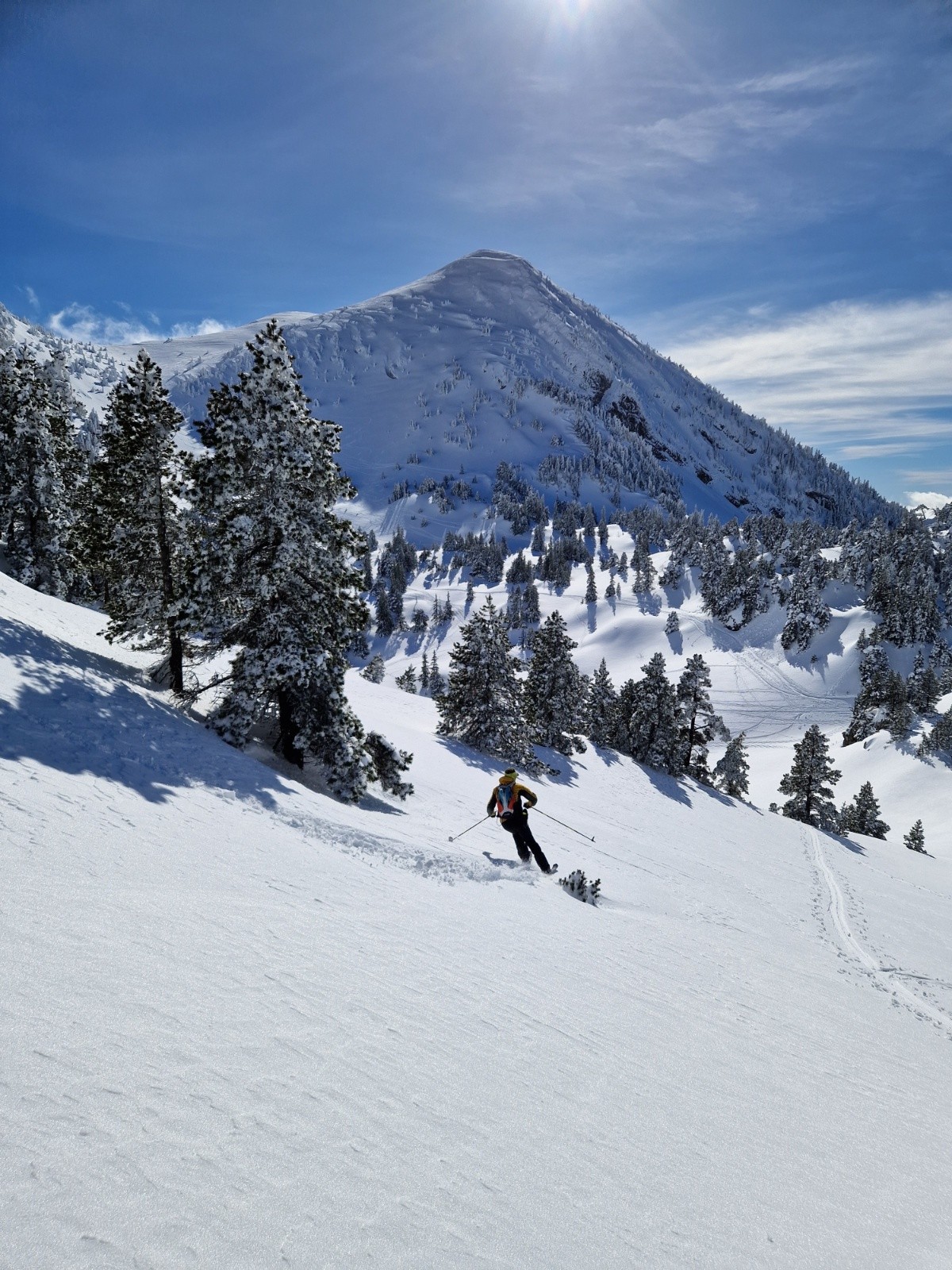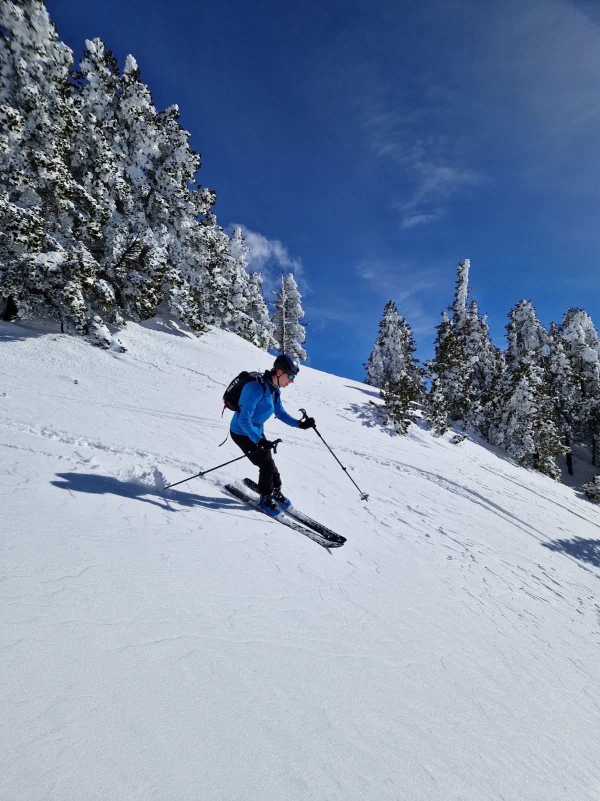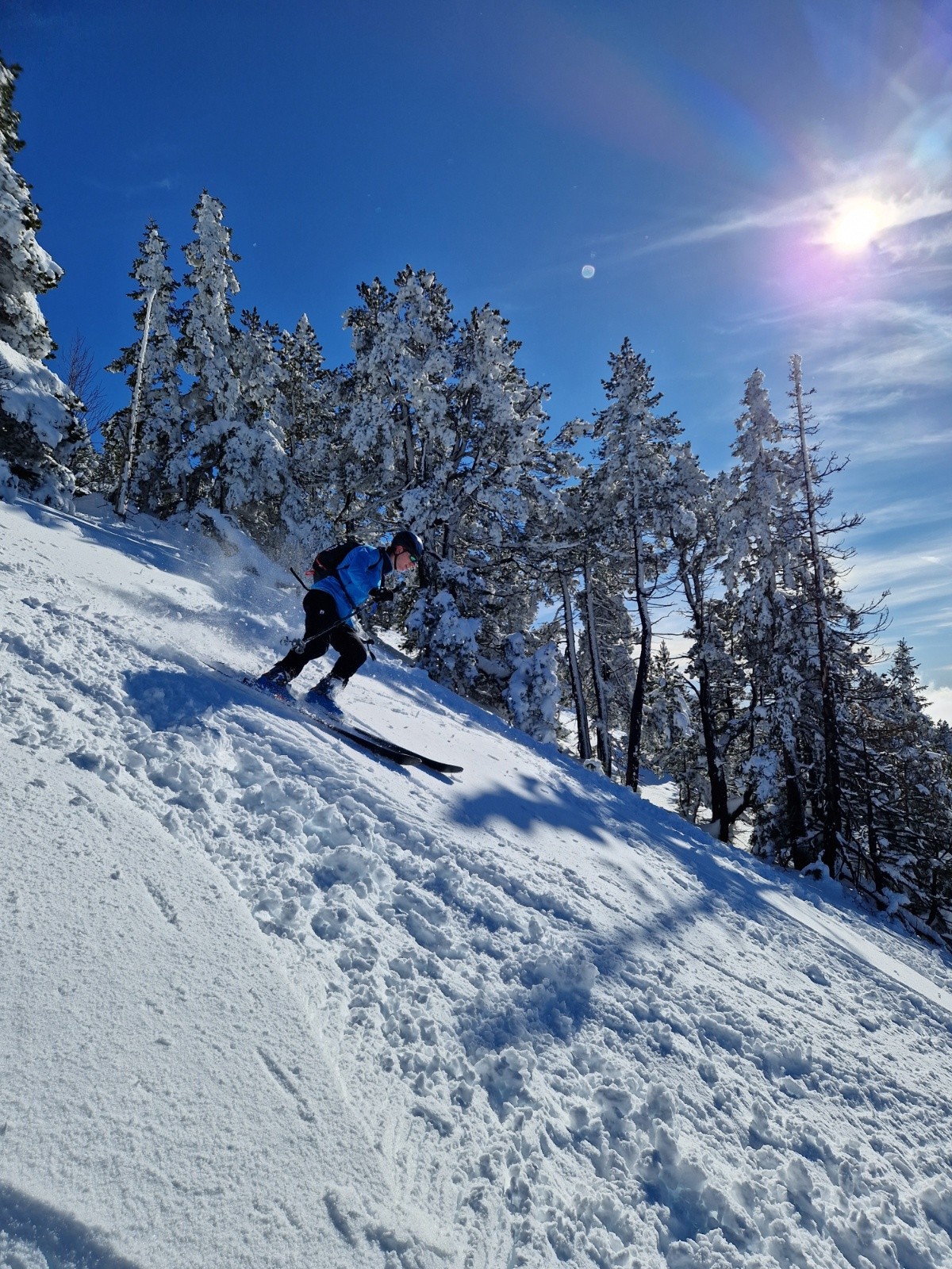 Après ce court repeautage on se lance dans la descente dans les sapins, on a trouvé une ligne assez évidente, très sympa et très ludique. La neige est lourde mais Raphael et moi sommes comme deux enfants dans un parc d'attraction, on s'est régalé😁. Derrière ça descend bien aussi, papa et ses skis 1,78 m se débrouillent comme ils peuvent pour arriver en bas de la première descente de sa saison. Il a raté plein de coches en poudreuse depuis janvier et se retrouve d'entrée dans les sapins et de la neige lourde. La forêt était vraiment agréable à descendre, c'est assez ouvert, il n'y a pas de passages de sangliers. La quantité de neige est incroyable, pas peur de toucher dessous. Aujourd'hui le danger vient d'au dessus, c'est cool les runs dans les sapins mais il ne fallait pas être au mauvais endroit au mauvais moment. Tous les sapins se déchargeaient de la neige lourde sur leurs branches, un coup à se faire assommer🤯