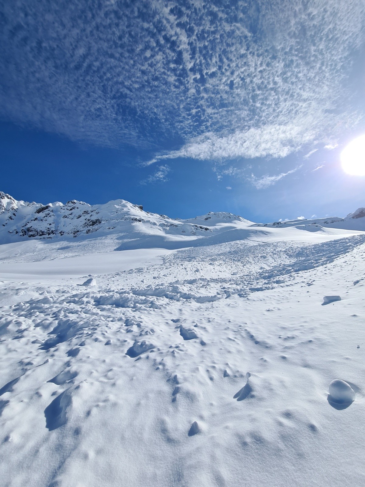 Conditions nivo et activité avalancheuse : enormes coulées neige humide/blocs parties de roselette et de la Cicle, datent probablement de la mi-semaine car recouverte avec un peu de neige