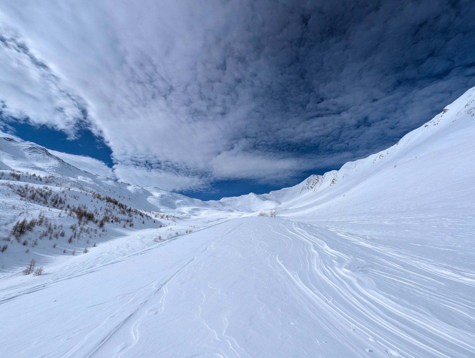 Conditions pour le ski : ça potte déjà dans la forêt mais à la sortie plus , on arrive dans le vallon,toutes les faces ont étaient soufflées ,des plaques à vent de partout je rebrousse chemin je bascule de l'autre côté du versant c'est un peu mieux.