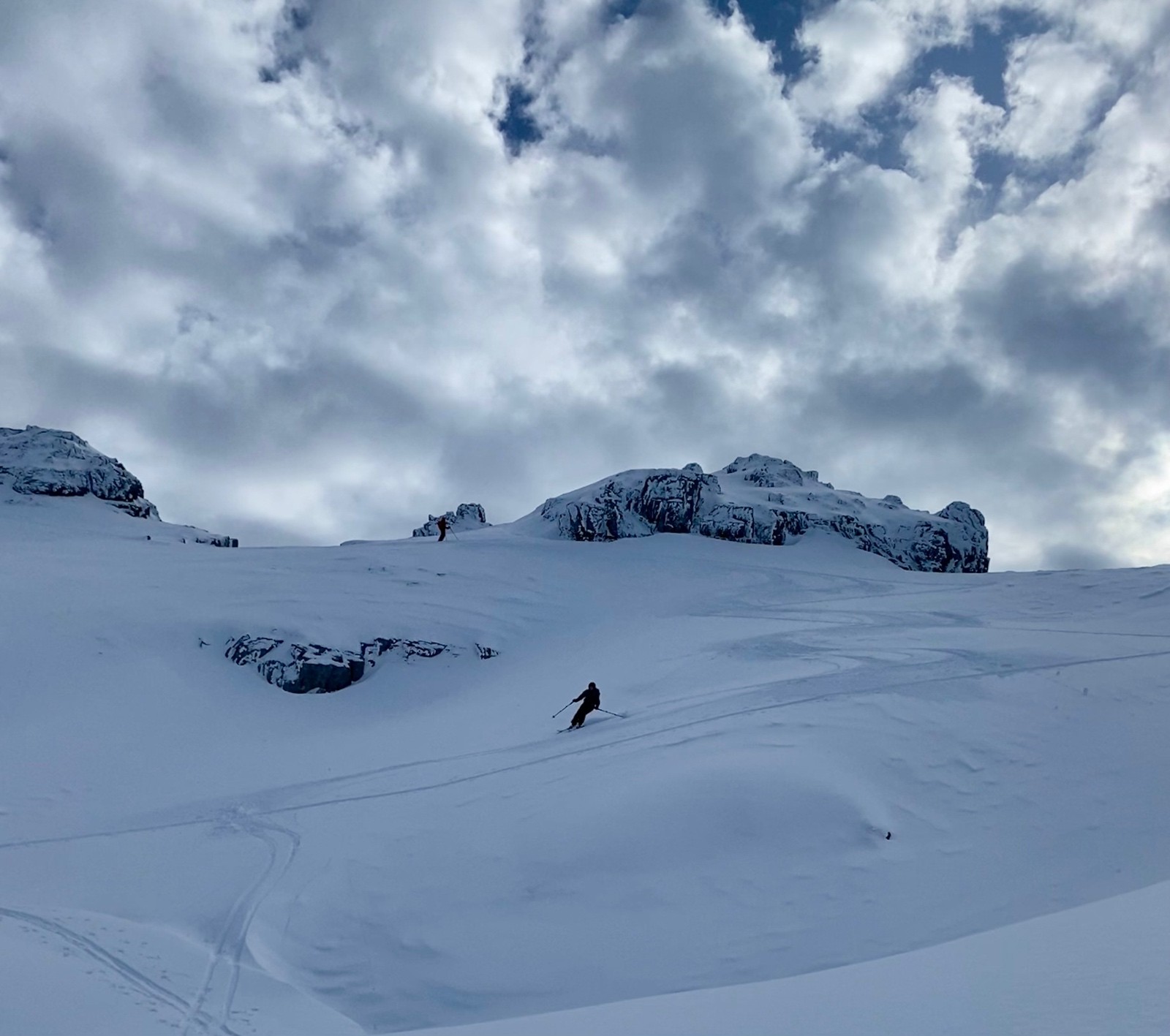 Avec cette qualité de neige et le groupe on prend l’option descente par la forêt, un peu long certes mais ça passe plutot bien. Ça doit bien passer dans le vallon aussi, probablement plus skiant et un peu plus expo.