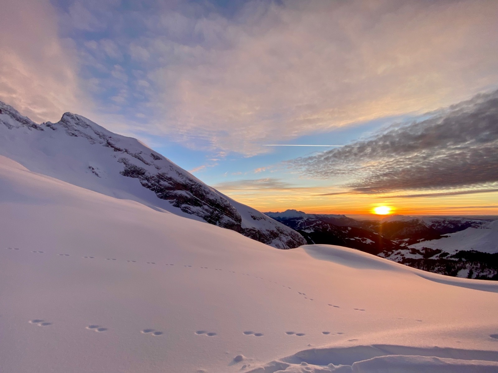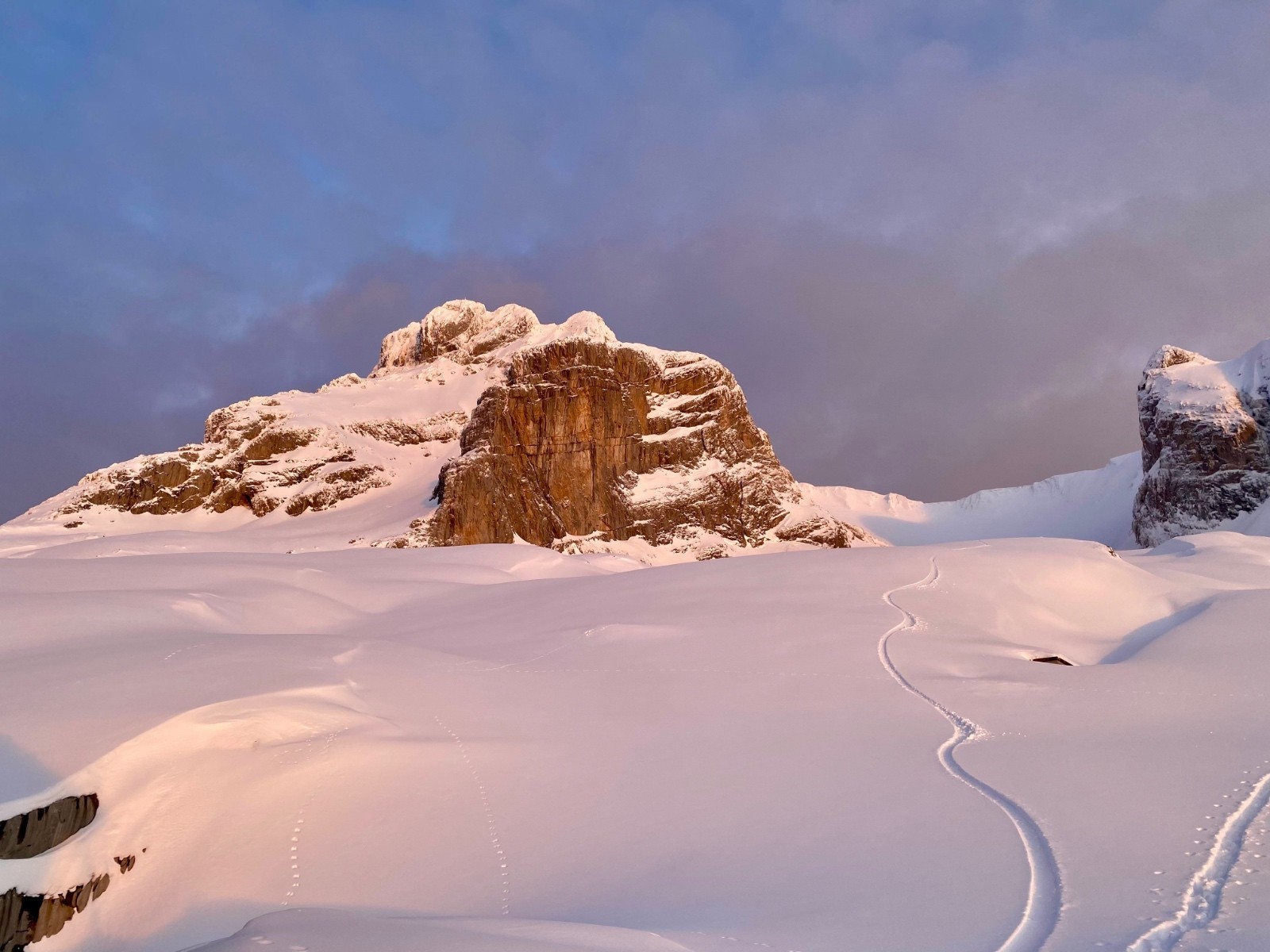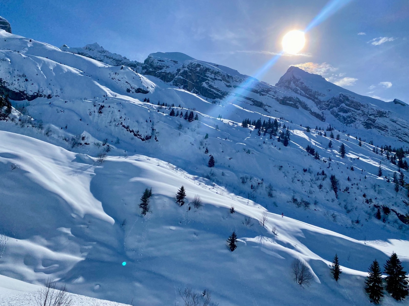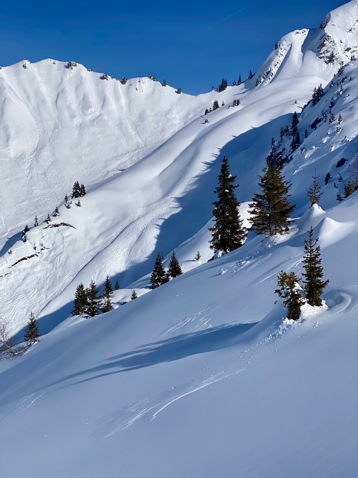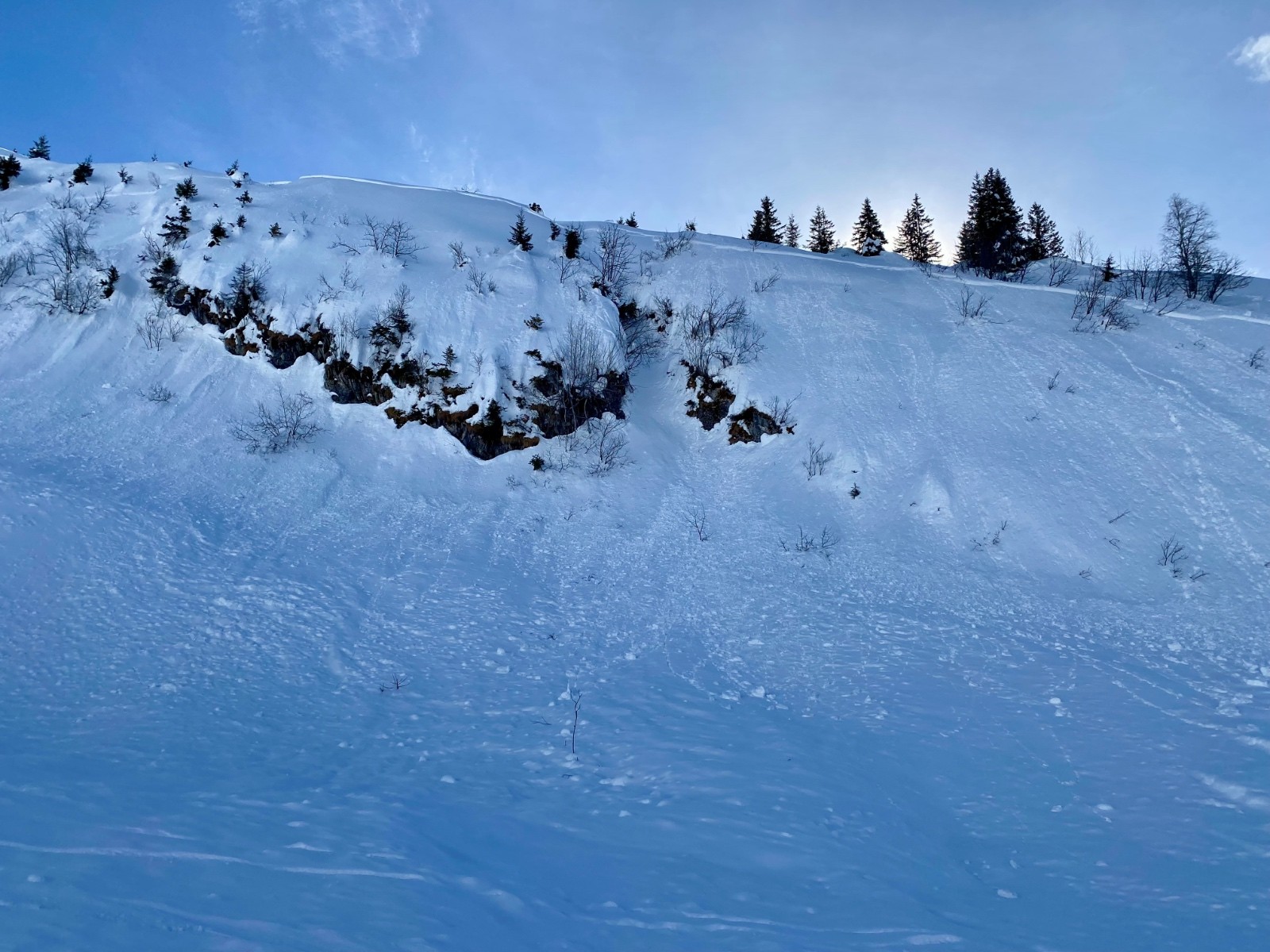 Montée par le chemin d’été dans la forêt jusqu’à Plattuy puis récupéré le GR de pays en descente vers la bombardellaz pour trouver la faiblesse entre les barres qui permet de rejoindre les pentes sous Chombas. Une cinquantaine de mètres bien chargés dans un bon 35 degrés par endroits, ça avait déjà purgé plus tôt, on est monté en restant sur le bord pour limiter l’exposition, au prix de quelques conversions, finalement RAS. Puis on navigue entre les bosses et les épicéas pour (enfin!) sortir sur le quasi plateau sous Chombas. On garde nos distances par rapport à la falaise car vraisemblablement ça n’a pas encore purgé au dessus. Puis montée en traversee ascendante vers le refuge en évitant les qq pentes à plus de 30. Même pour la fin d’accès au refuge j’ai préféré faire le tour par le dessus plutot que passer sous la petite pente juste avant le refuge, elle semblait bien chargée plus le profil concave ne m’inspiraient pas, le petit raccourci ne valait pas le risque additionnel.
