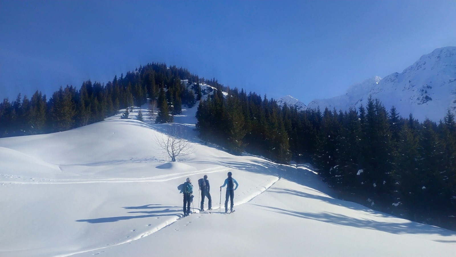 Pour la suite je tire tout droit dans la forêt, toujours super content de naviguer entre les multiples obstacles, les autres suivent sans convictions particulières😂. Ils veulent juste en finir, le plaisir c'était en haut. Heureusement l'enneigement est vraiment incroyable, on est passé sans touchettes et sans en avoir peur. Pour finir on a repris la route dans une neige bien collante, au début il fallait faire un peu de pousse bâton sur le plat mais ensuite il n'y avait plus qu'à se laisser glisser jusqu'en bas en repensant à cette belle journée passée en montagne🥰.