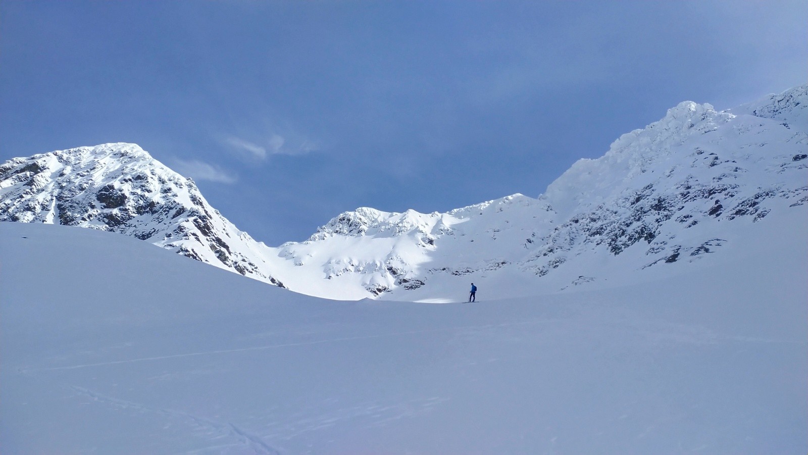 Repeautage au deuxième chalet en discutant avec 3 gars qui faisaient une pause dans leur montée. Après leur avoir souhaité une bonne journée je repars sans me presser pour rattraper mes trois compagnons du jour. C'est maman qui s'est occupée de la trace jusqu'à 2100 m, bravo elle était superbe. Après les avoir rattrapés à cette altitude je prends le relais pour la trace. On passe au moins raide avec l'idée de s'arrêter au pied de la pente finale du col de la Porte de l'Eglise pour faire deux descentes ici. Une fois à 2400 m je m'arrête comme prévu pour ma première descente. En descendant je m'arrête au niveau de maman, Lucie et Ludo pour leur dire que le manteau neigeux paraissait stable mais que je m'étais arrêté pour profiter de la bonne neige du bas car je commençais à botter. Superbe descente en vieille poudreuse, j'ai pu faire de belles traces et repérer où je pourrais faire celle d'après😜.