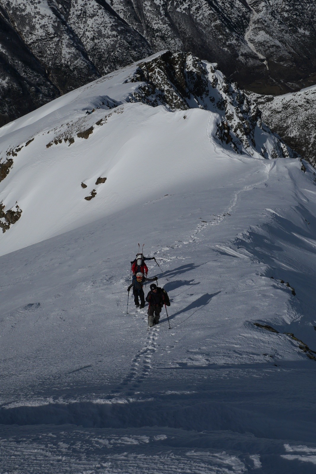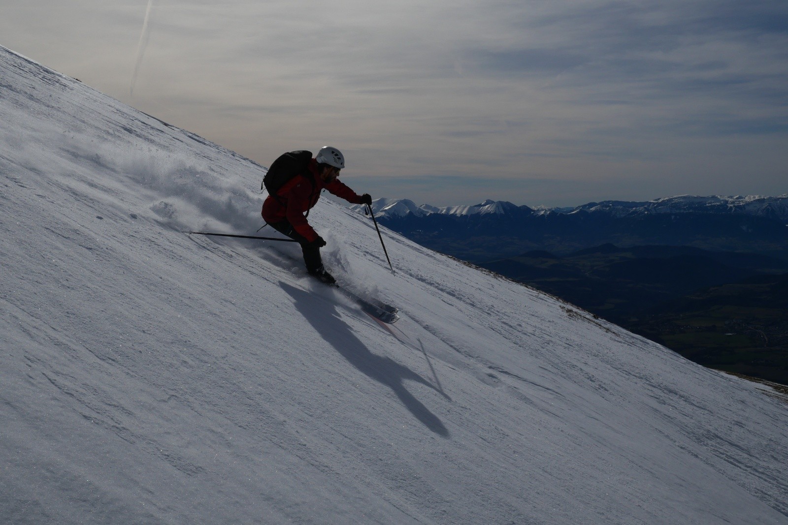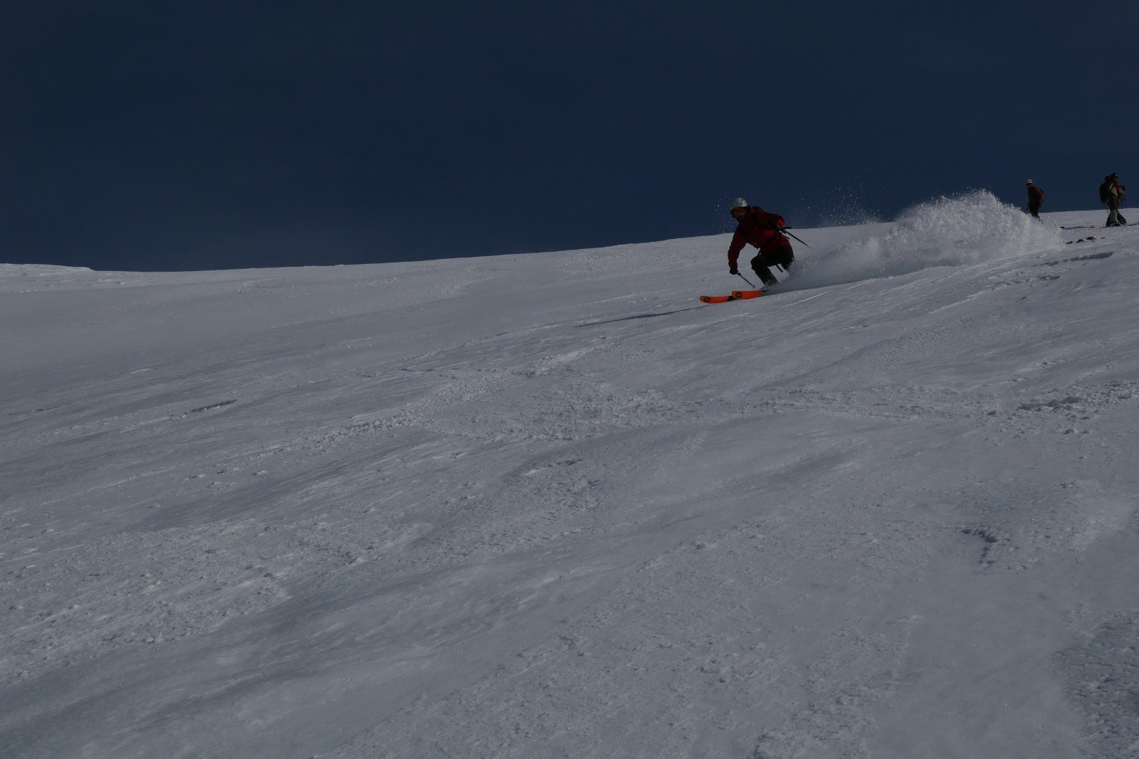 Conditions pour le ski : Neige croutée dans la combe ce jour. Sur la crête, la neige a été soufflée : alternance de zones dégarnies faisant ressortir la vieille moquette plus ou moins vitrifiée et de zones avec du grain fin (poudreuse dense). Agréable à skier dans les 2 cas !