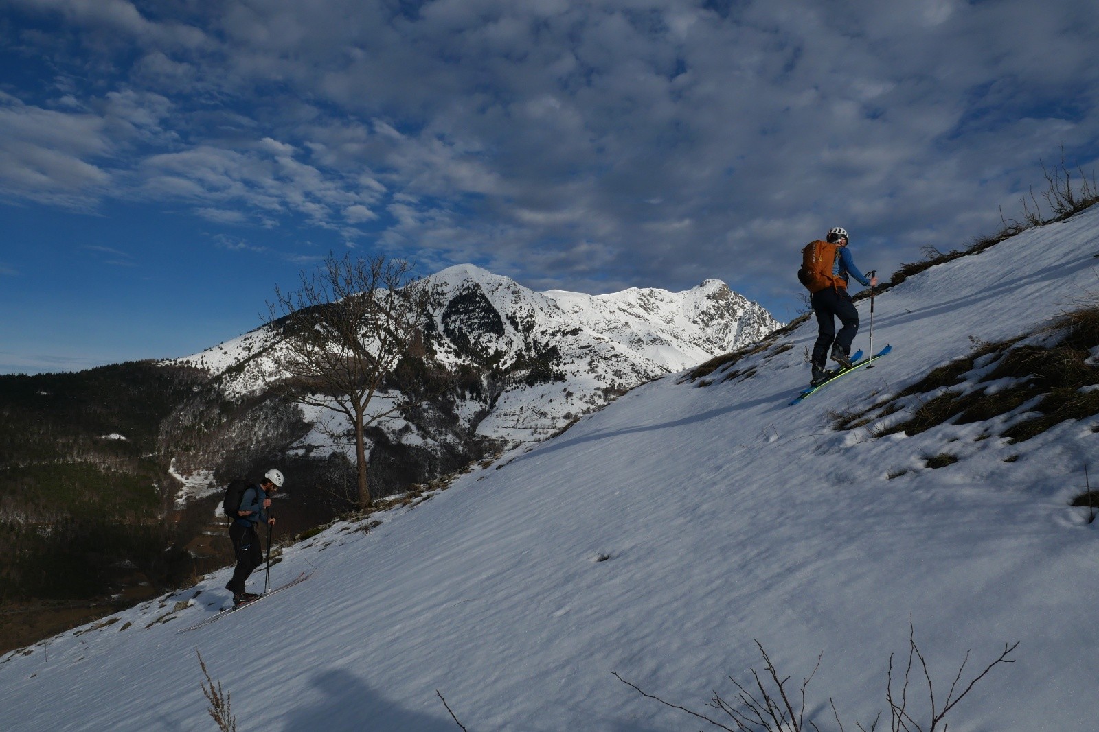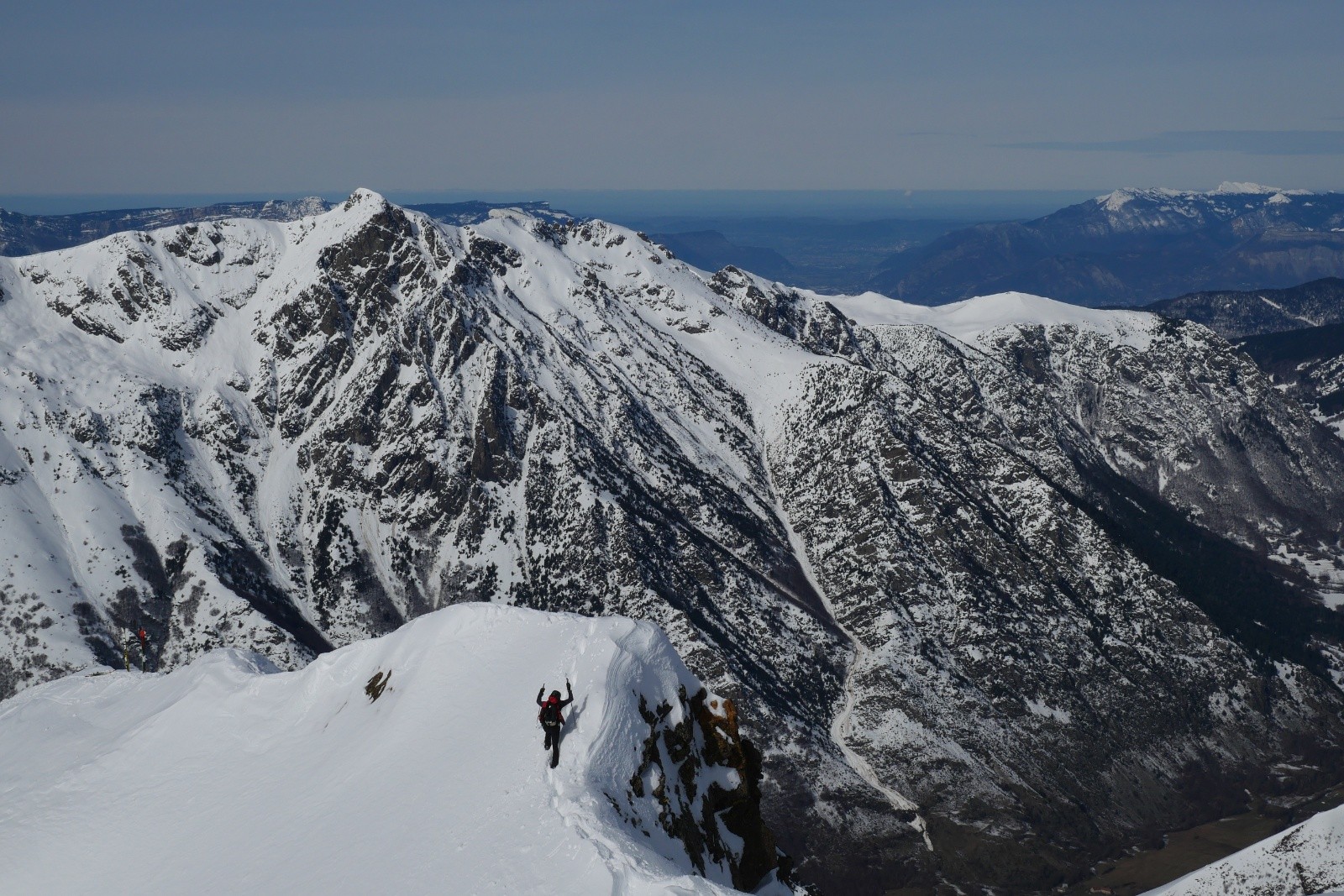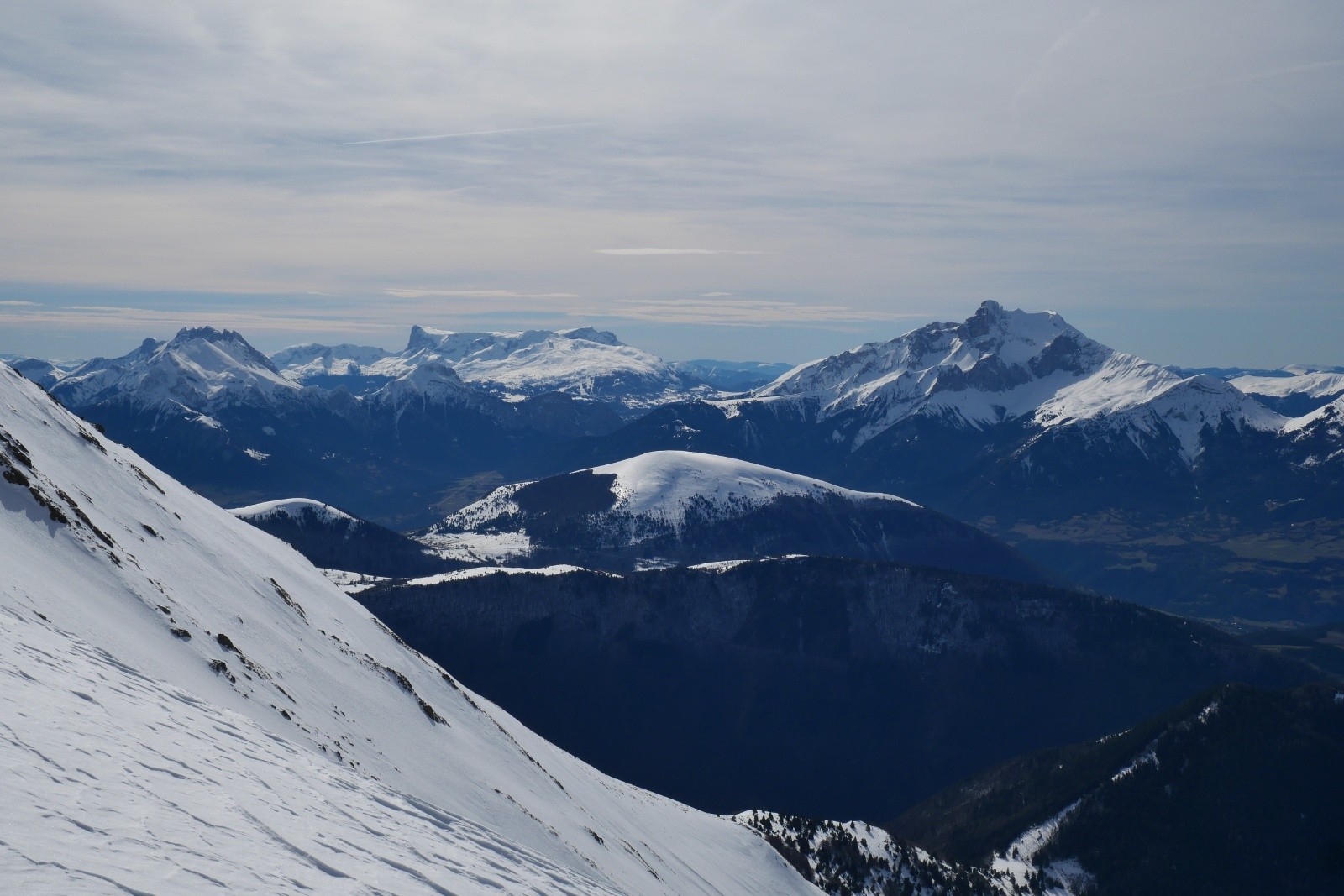 Conditions pour le ski : Neige croutée dans la combe ce jour. Sur la crête, la neige a été soufflée : alternance de zones dégarnies faisant ressortir la vieille moquette plus ou moins vitrifiée et de zones avec du grain fin (poudreuse dense). Agréable à skier dans les 2 cas !