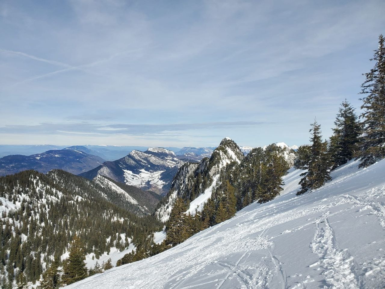 Quand la neige tombe proche de la maison, c'est le moment du précieux ski en chartreuse ! On chausse presque au niveau du parking ce qui fait toujours plaisir. Au début du sentier, il y a quelque arbre tombé en plein milieu, ce qui permet de réviser quelques positions de yoga, histoire de partir bien étirées. À part ça la montée dans la foret est plutôt agréable, la neige est un peu croutée, mais les peaux tiennent plutôt bien. En plus, avec les récentes chutes de neige, c'est la bonne ambiance. Arrivées au col, on se dirige à gauche pour monter la pente un peu raide qui rejoint la crête. Ici la neige est bien croutée, et c'est bien de sortir les couteaux. Une fois sur la crête, un très beau panorama s'ouvre à nos yeux, du mont blanc au pic de bure; en plus, on est très contents de trouver de la belle neige de printemps sous nos semelles. On avance donc bien jusqu'au sommet où on ne traine pas trop, mais en se laissant quand même le temps de papoter un peu avec les gens, compétence essentielle du skieur expérimenté.