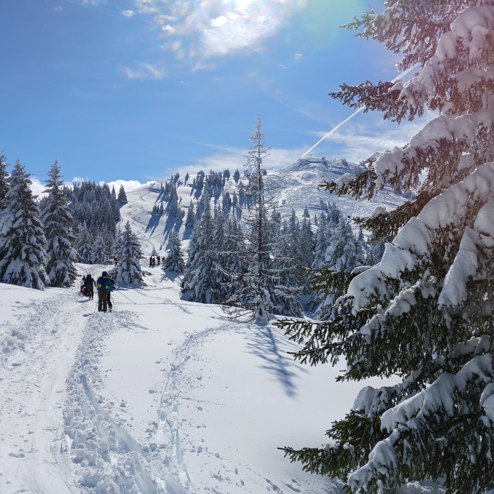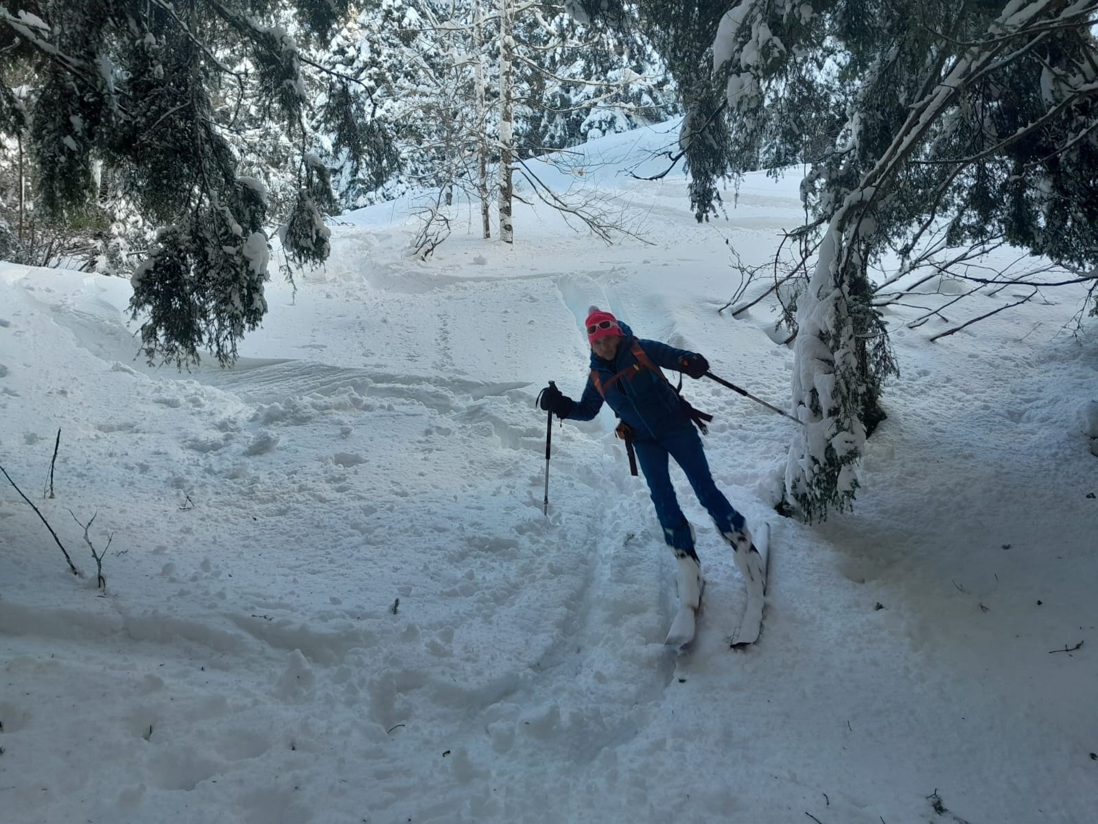 Conditions pour le ski : excellentes sous le sommet, Les pentes Ouest réservent encore de vastes portions non skiées. Excellentes dans les arbres , en descente sanglier bien agréable. Correctes sur la piste de retour, non tracée avant notre passage. Pousse-bâtons pour le premier, cool et reposant pour le second.