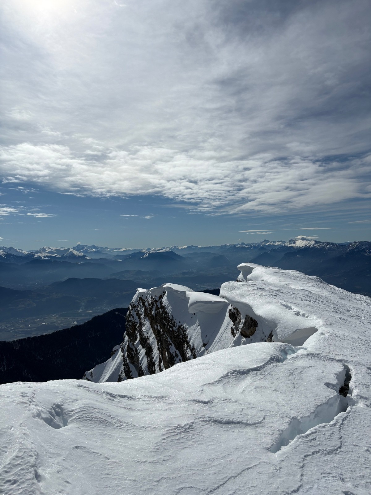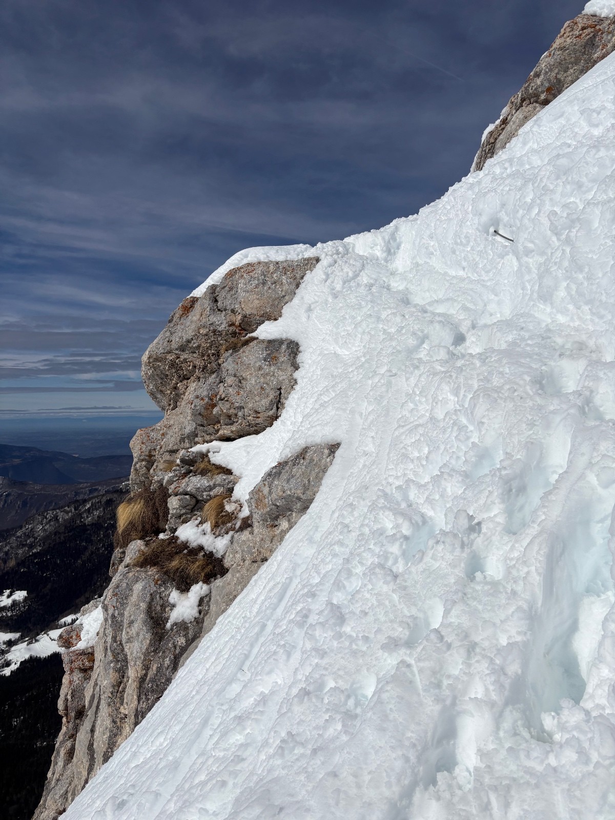 Maxi méfiance sur la corniche sommitale avant le cable, au niveau du petit col final, il y avait des traces de pas sur la corniche. Visible au loin sur une des deux photos