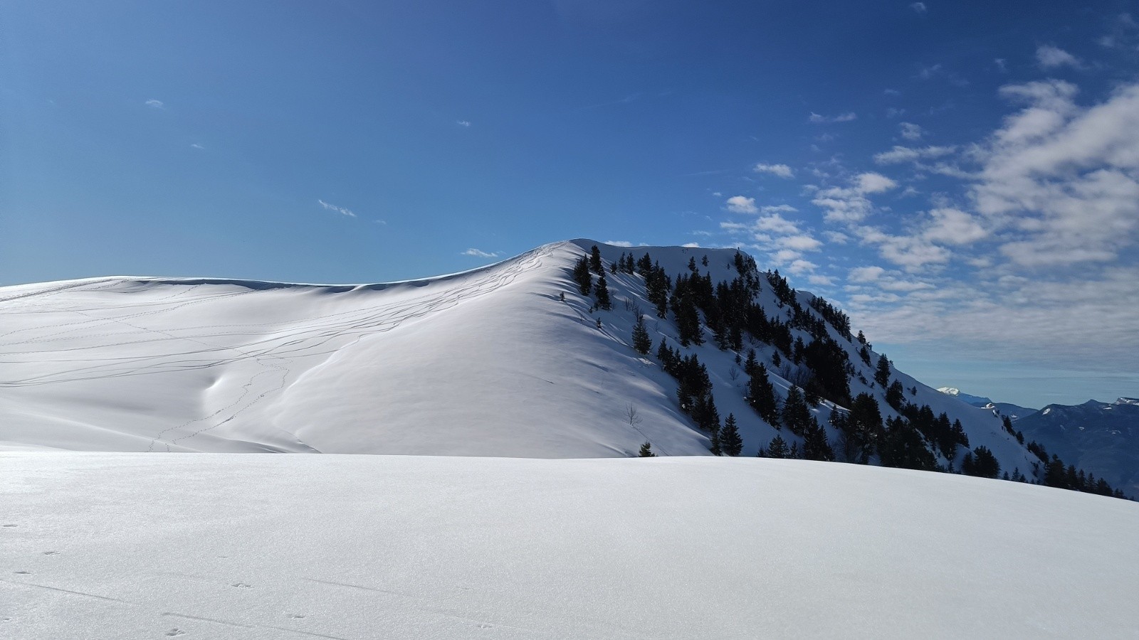 Conditions pour le ski : neige infâme à la descente, versant ouest de l'épaule, neige gelée croûtée, dans la forêt neige très lourde humide, dans le pré descente côté ensoleillé neige humide mais correct à skier.