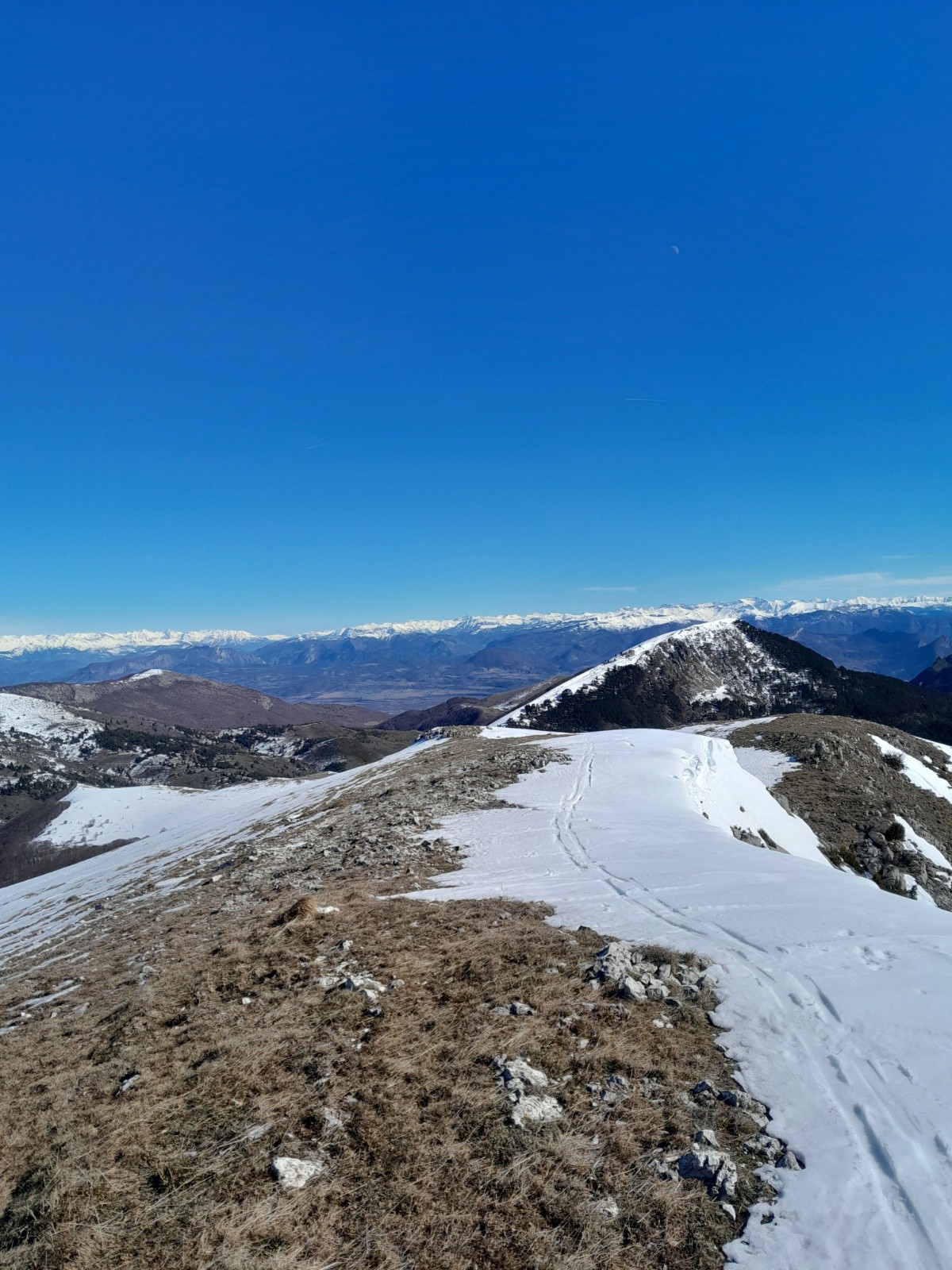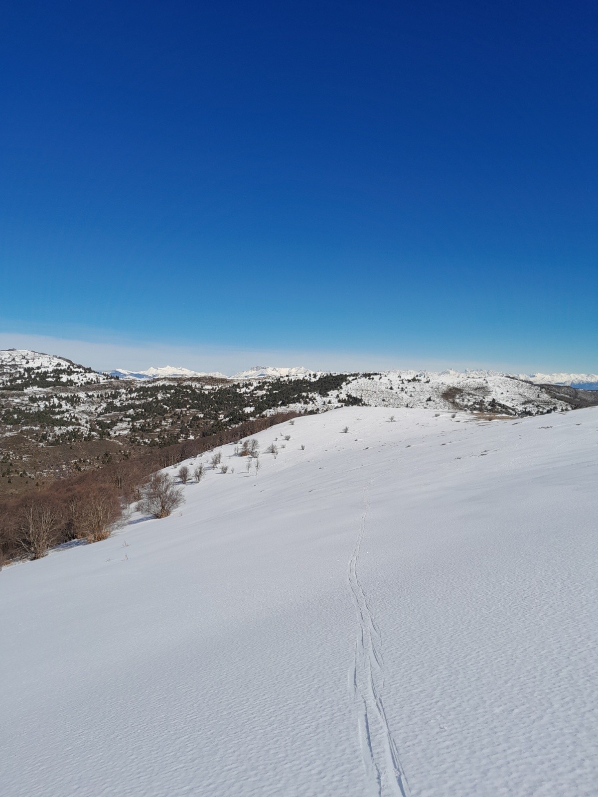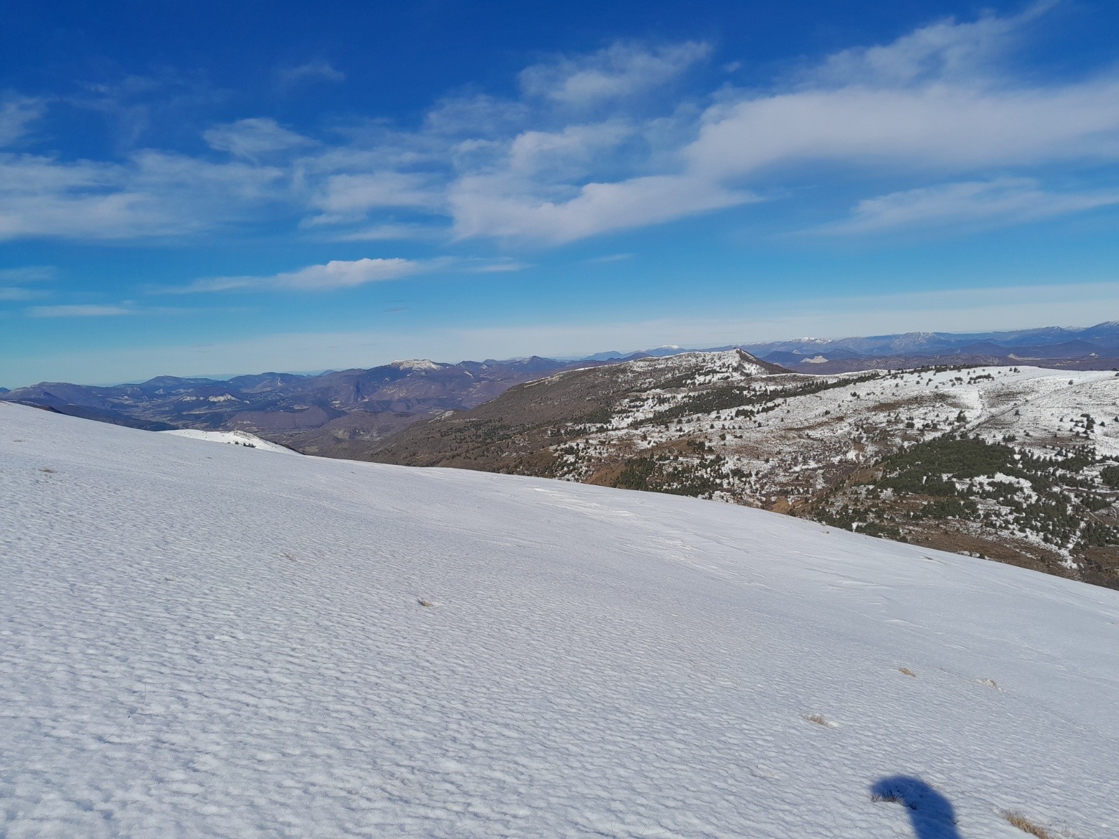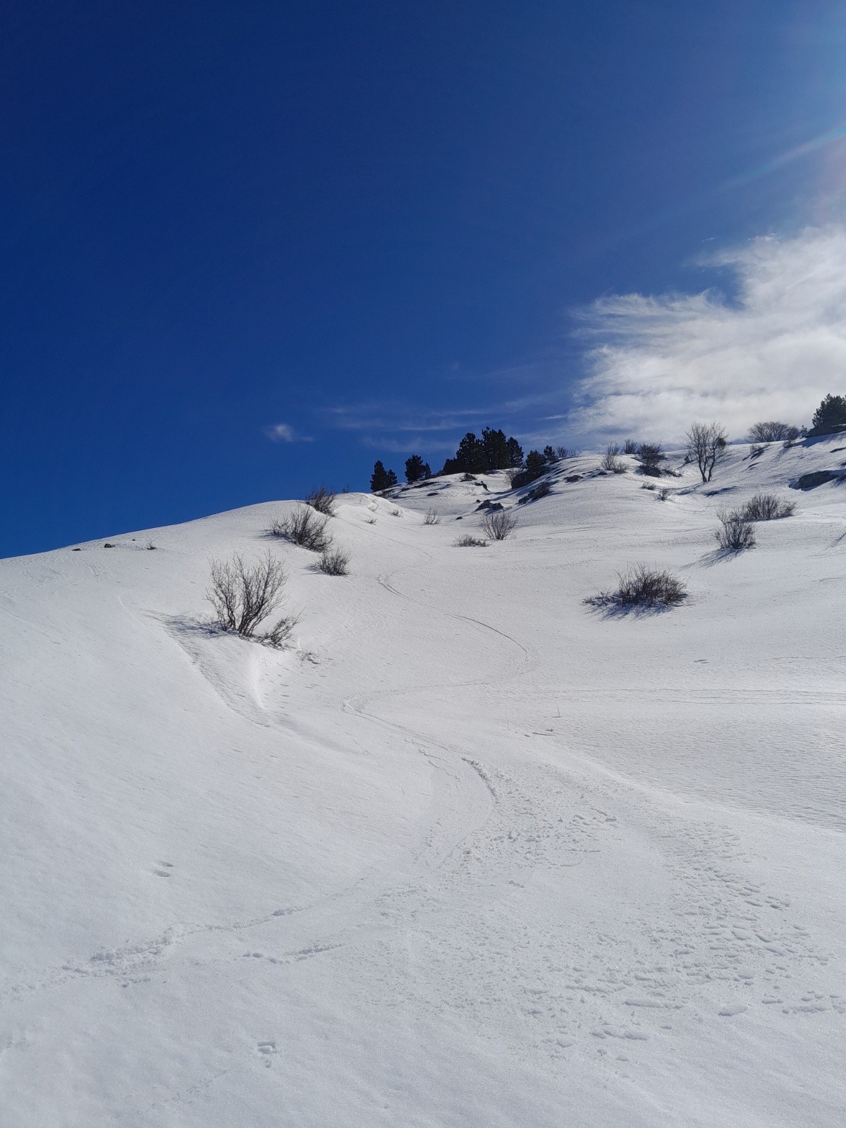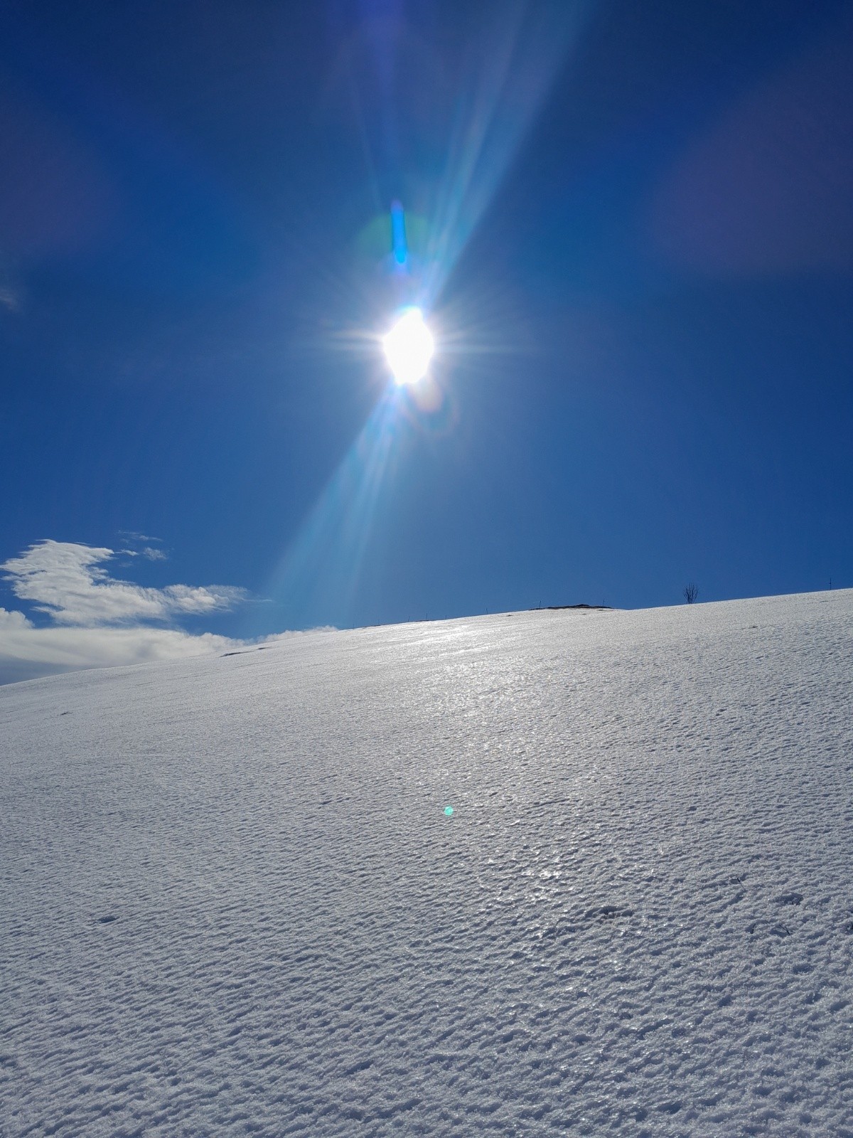 Conditions pour le ski : bonne. Neige de printemps ou dure selon l'orientation. Parfois de la poudre dense dans les micro-vallons à l'abri. Quelques sections de neige pourrie / croûtée.