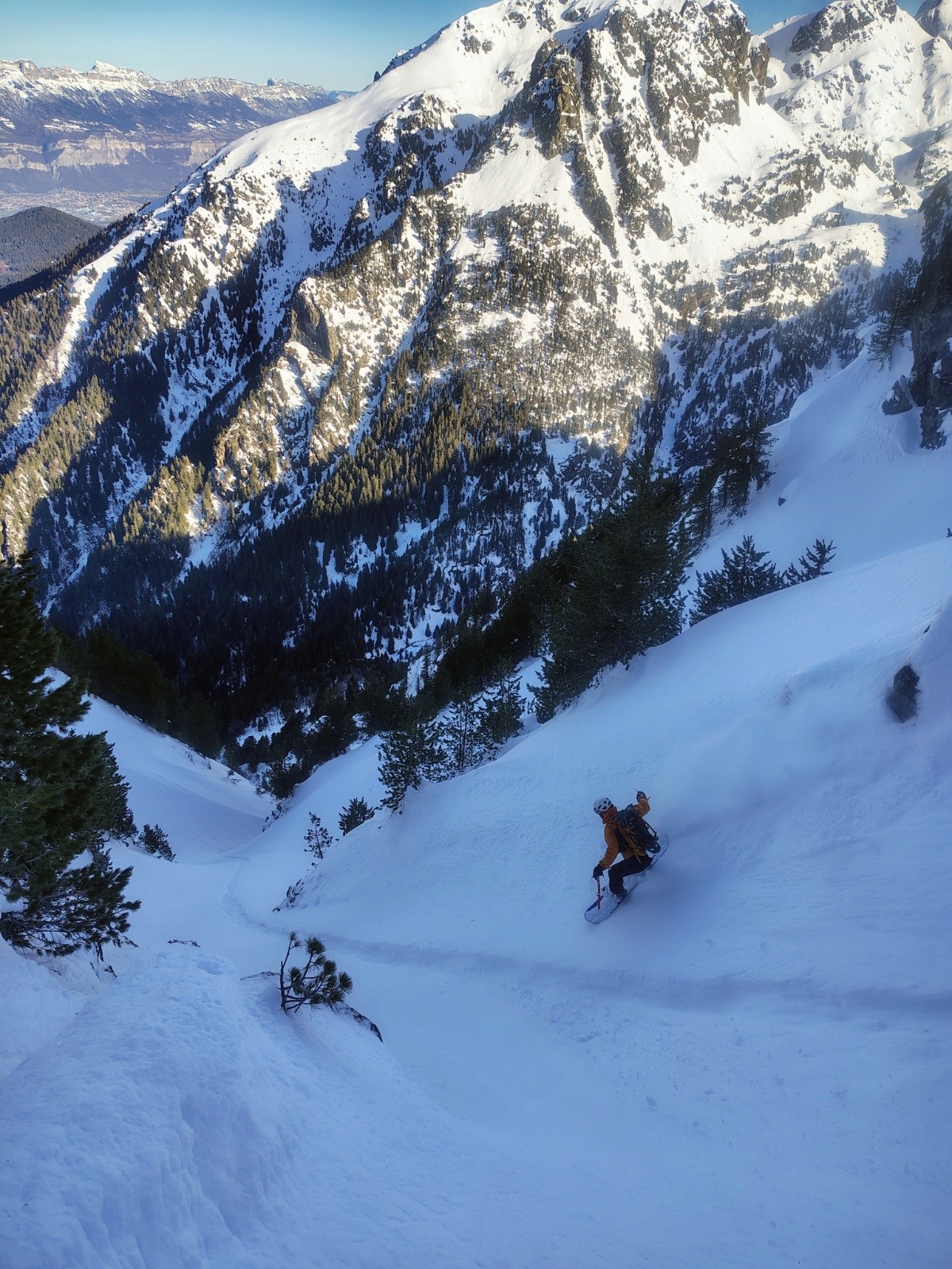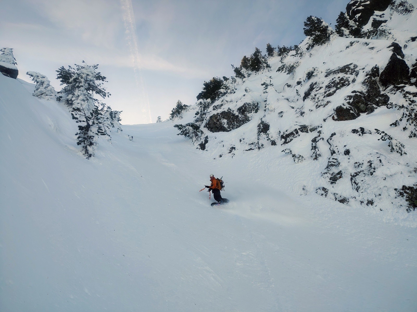 Conditions pour le ski : Super neige bien préservée, poudre tassée. Neige un peu durcie au centre (sûrement une plaque qui est partie). Le bas en neige bien molle, permet de s'amuser dans les traces des anciennes coulées