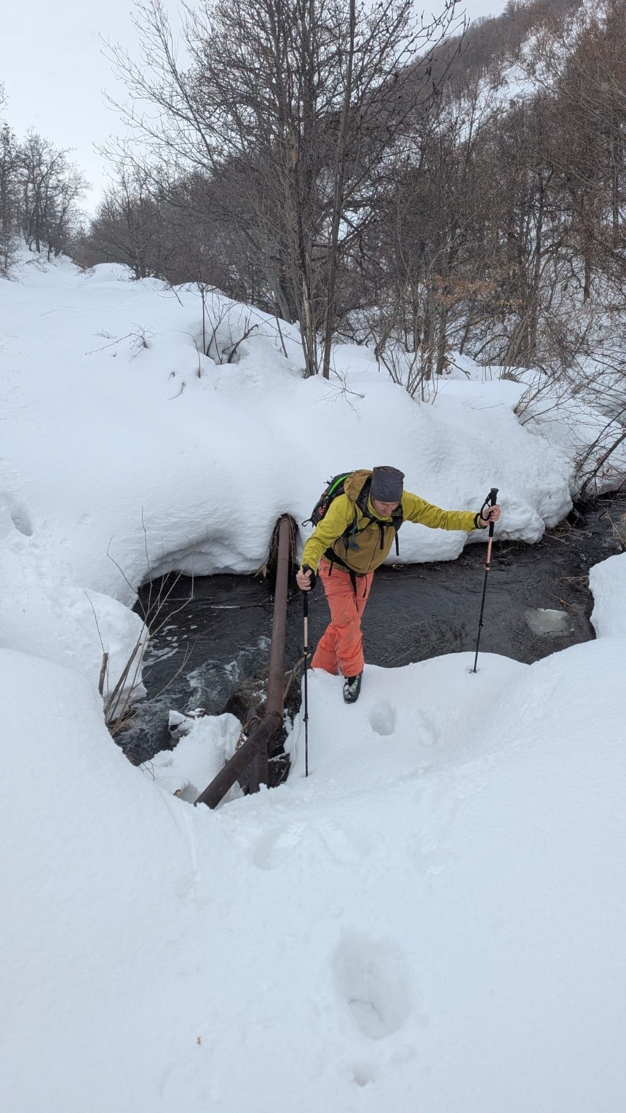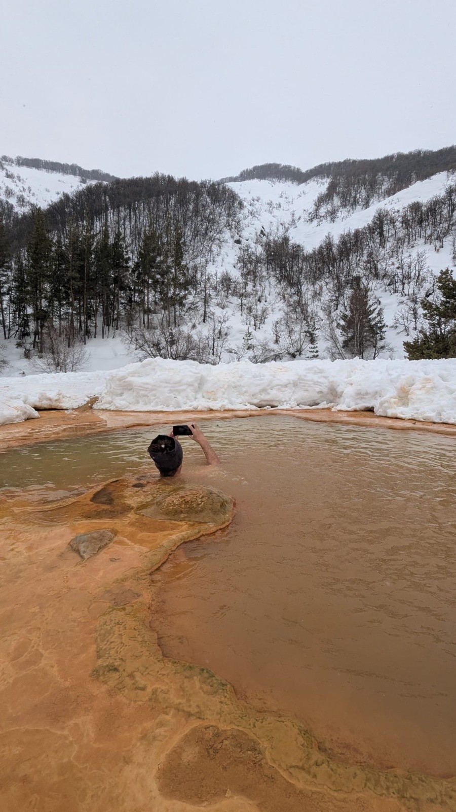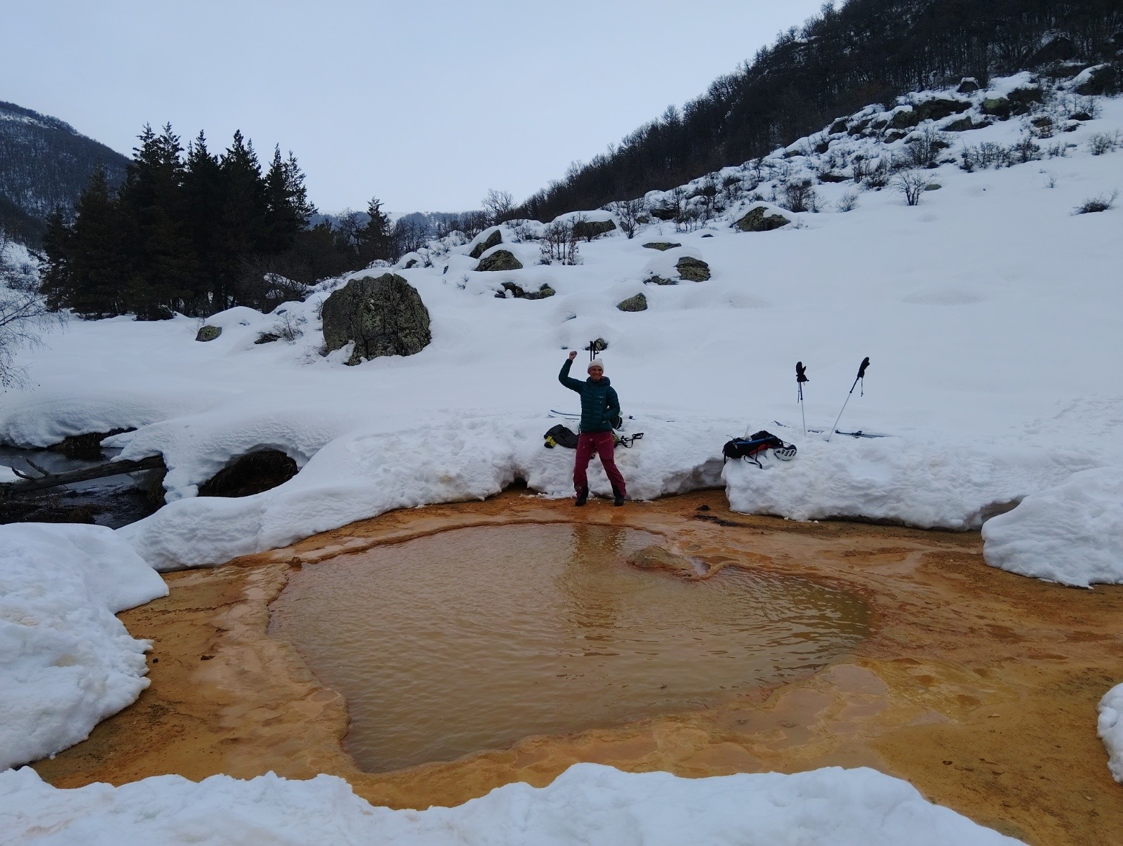 Combiner urbex, source thermale et ski de rando, voilà l'objectif du jour. On s'est garé où on a pu entre les murs de neige, on est monté dans une forêt infestée d'ours sans en voir un. On a franchi la rivière au moins 7 fois sans jamais finir dedans et le Graal c'est cette source thermale au milieu de la forêt pour se baigner pendant la chute de neige