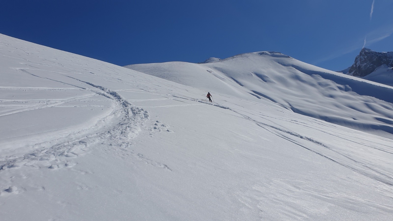 Conditions nivo et activité avalancheuse : neige stable attention si on descend trop tard risque de coulées au passage des 2 couloirs