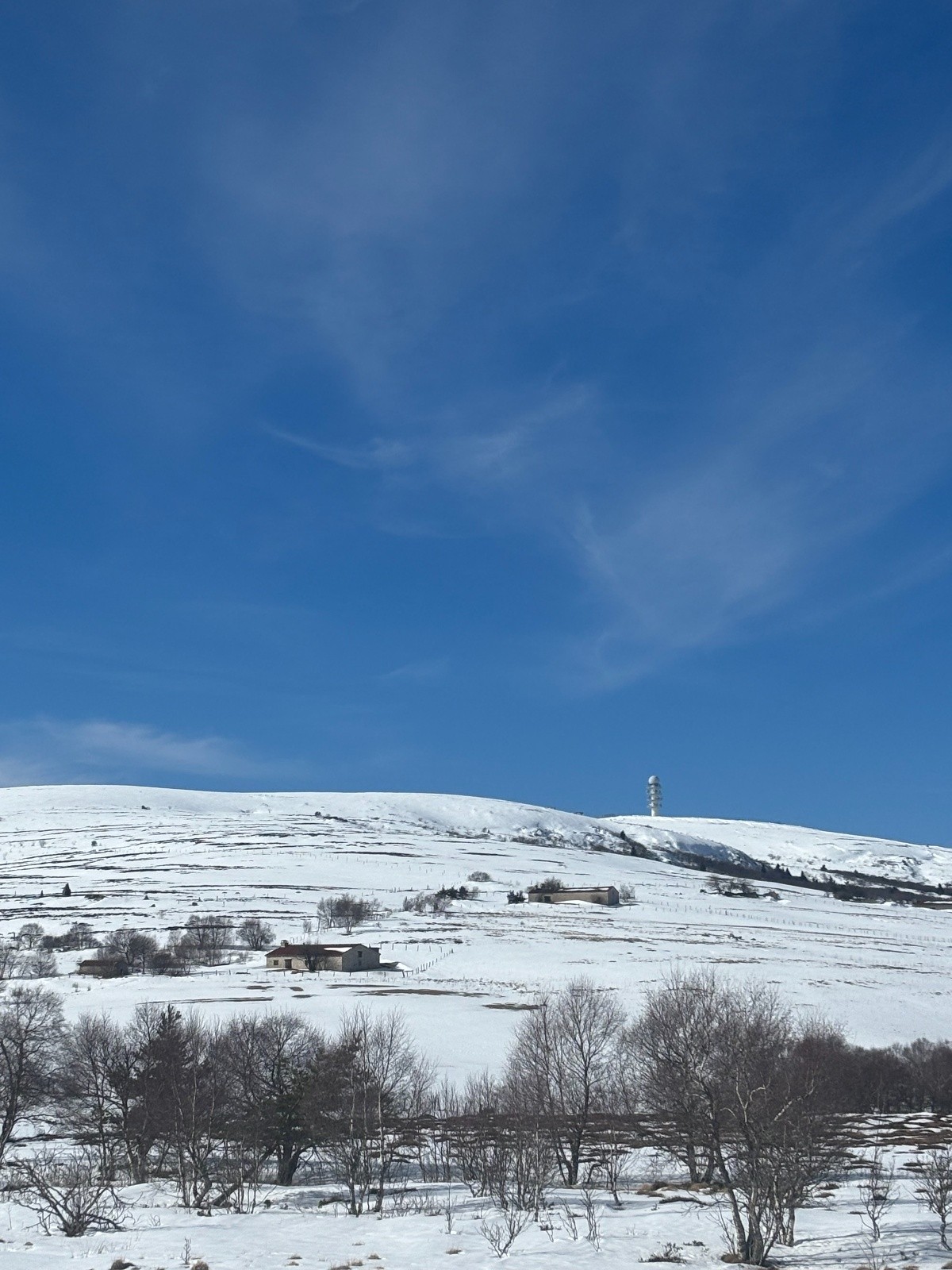 Belle ballade ensuite entre les jasseries et les espaces toujours aussi sauvages et mystérieux des Hautes Chaumes foreziennes. Une neige étonnamment portante permet une progression facile. Depuis la crête, vue splendide à 360°, du Mont-Blanc jusqu'aux Écrins, Pilat, Monts d'Ardèche, Sancy, Puy de Dome, Jura... ambiance printanière entre pins et grand soleil, pendant que la plaine du Forez et le Lyonnais semblent encore dans la brume. Pas un chat, la seule rencontre du jour se fera avec trois Rafales survolant de très près Pierre-sur-Haute et sa base militaire.