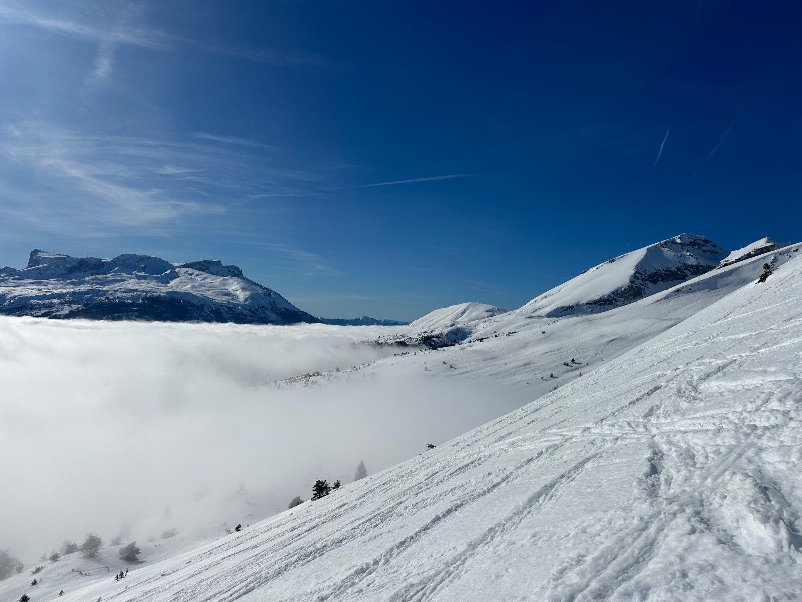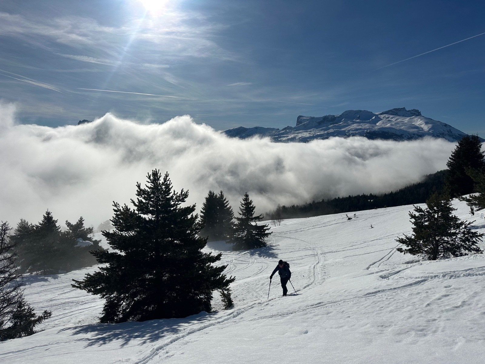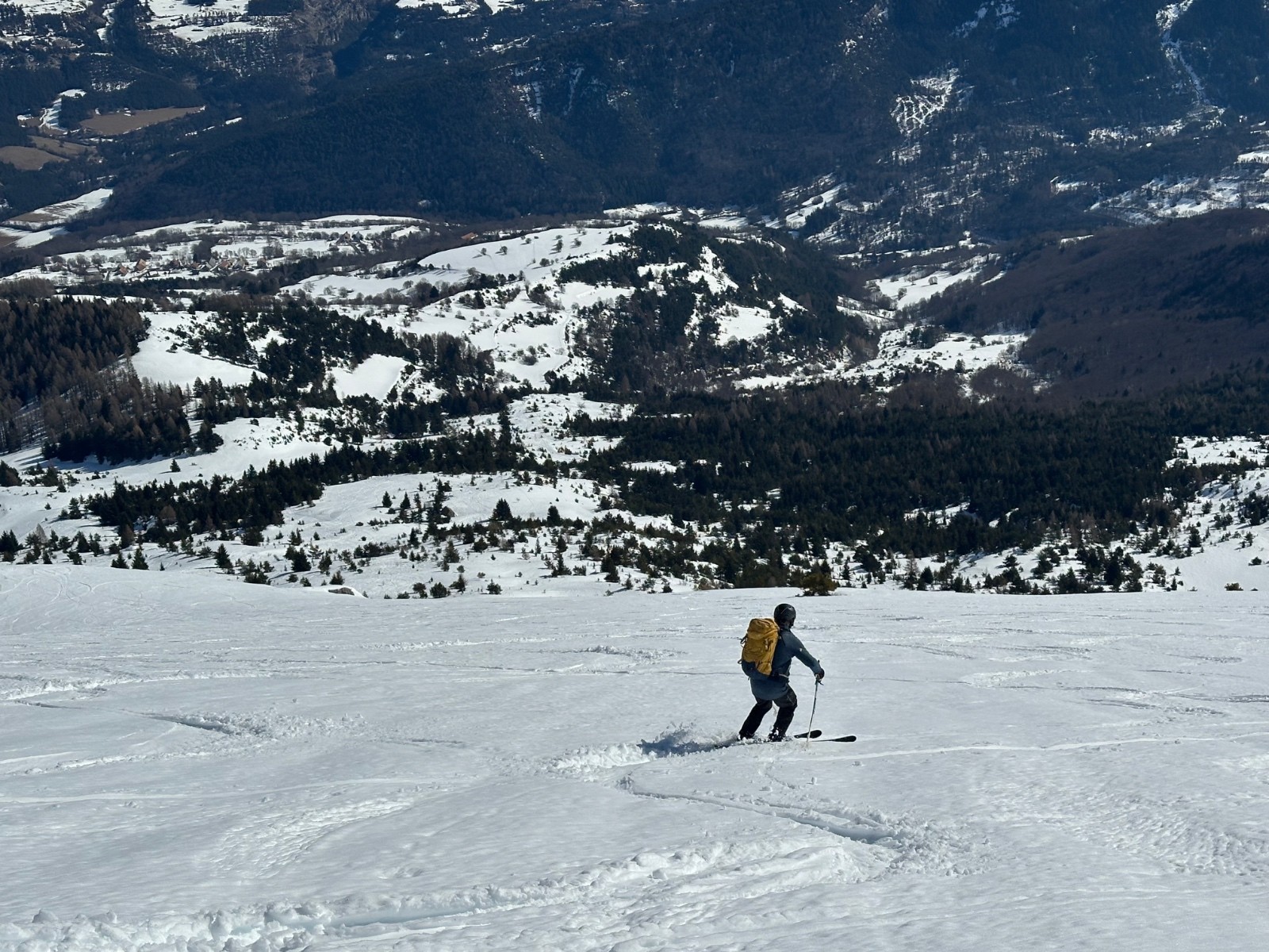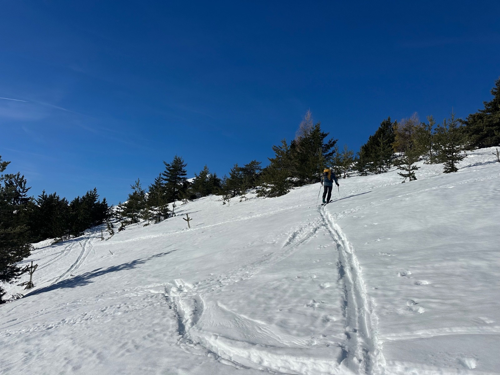 Conditions pour le ski : excellentes en haut, mais la neige devient vraiment molle à partir de 1900. Et à ne s’arrange pas sous la cabane, dans les genèvriers.