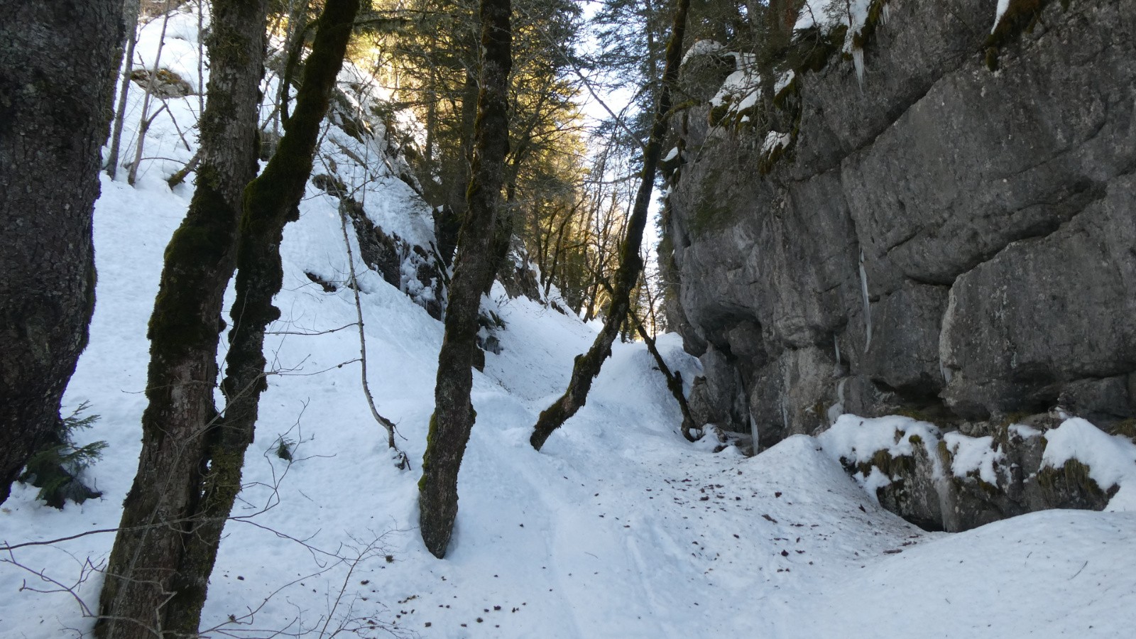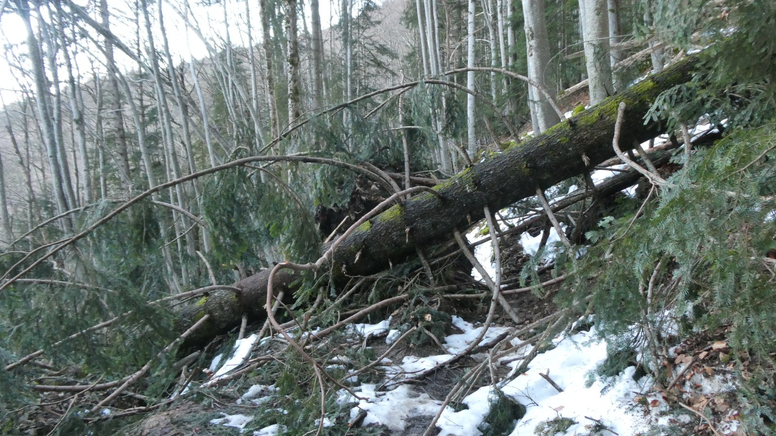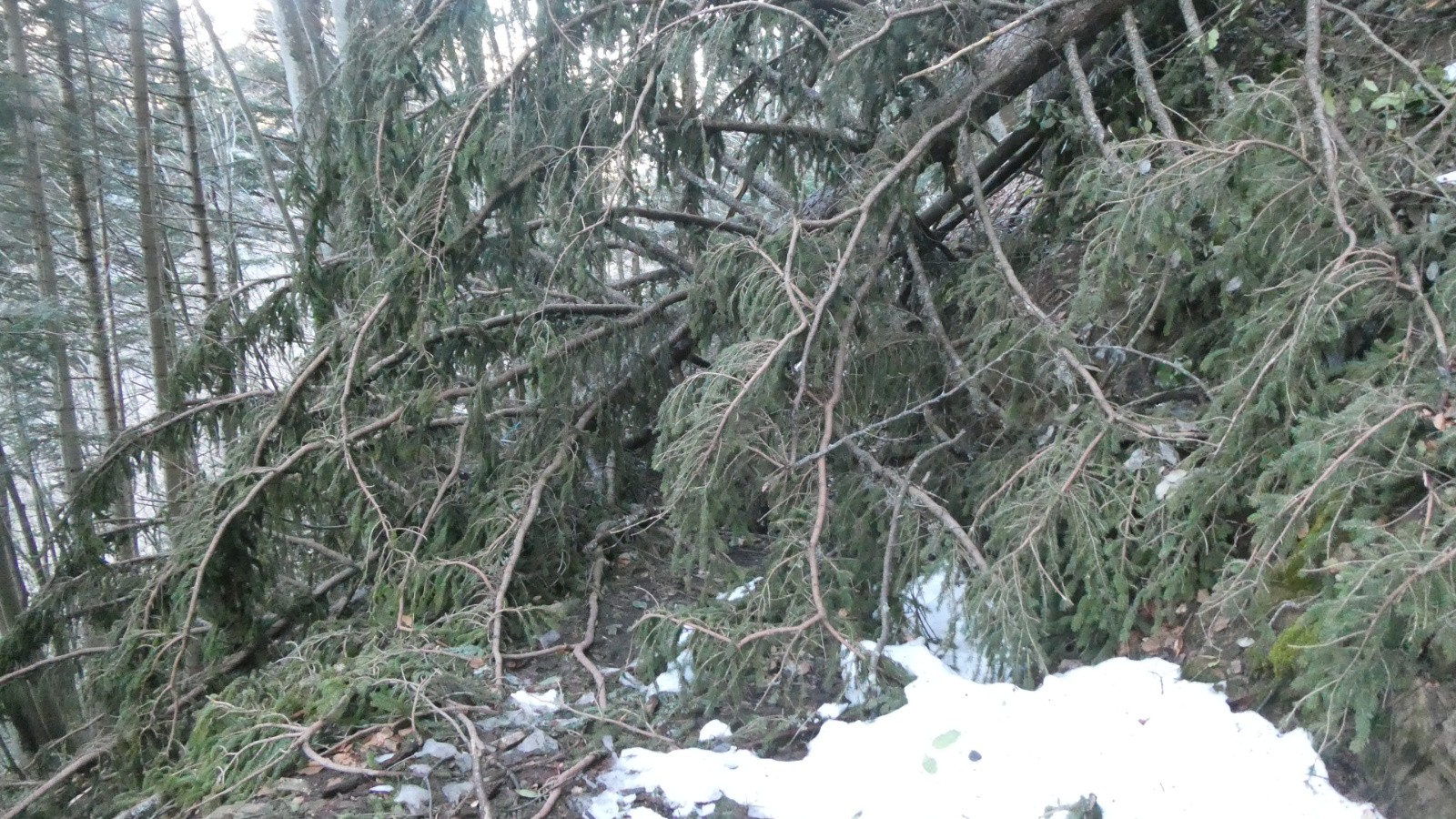 - la partie boisée est quasiment inskiable : neige molle en profondeur rendant même la marche laborieuse et périlleuse (enfoncement), neige jonchée de branches et de bouts de bois - partie basse de la forêt avec des obstacles de taille qui obligent à 2 reprises de déposer sac et skis, les faire passer de l'autre côté puis les rejoindre en marche accroupie dans la boue