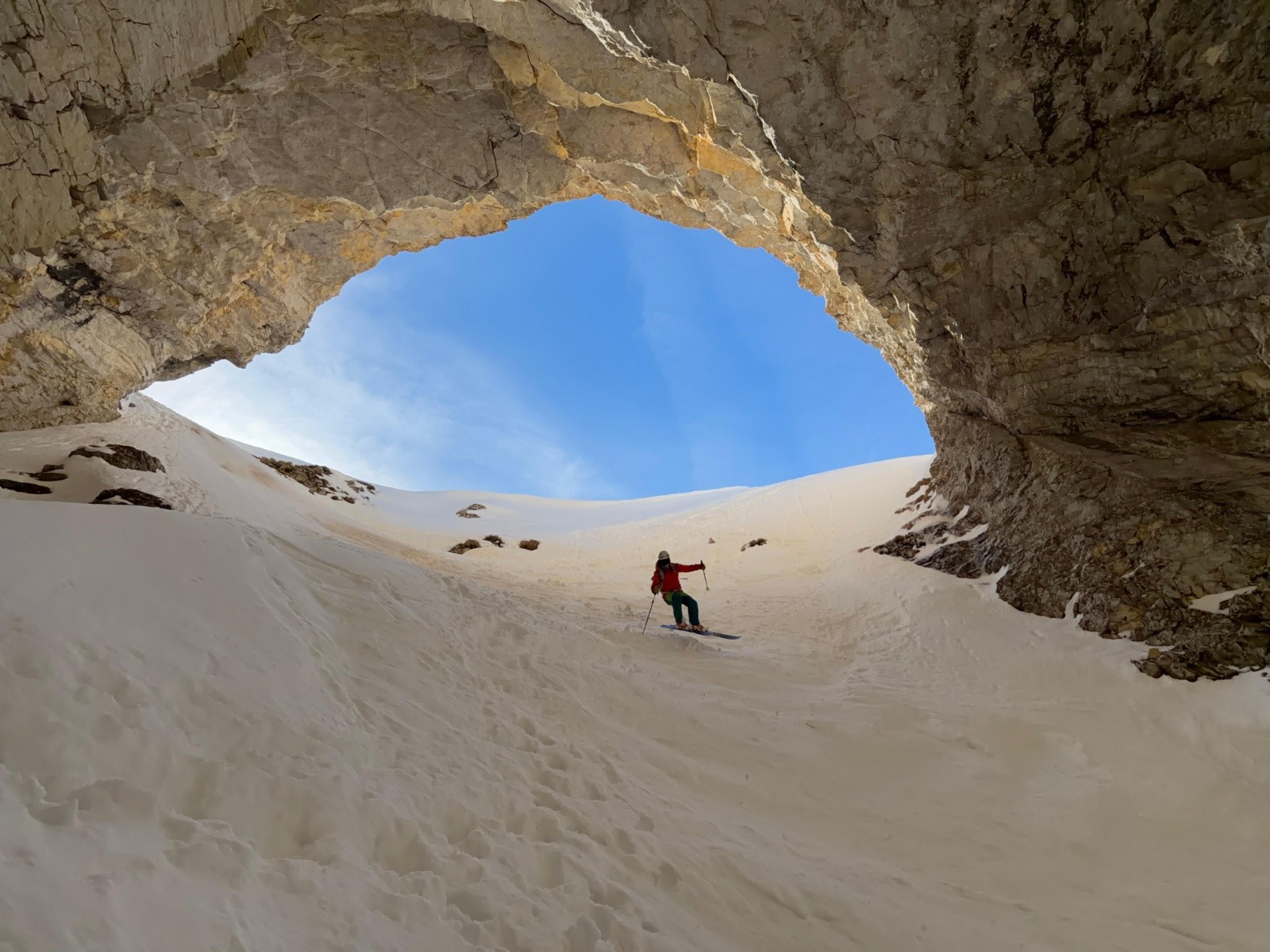 La grotte est percée de part, il y fait très clair, et la hauteur sous plafond ravirait un haut fonctionnaire parisien. C'est une belle ambiance, plus accueillante que dans les Chorums Olympiques. On sort facilement en haut vers 9h30 avec l'intention de chausser vite et redescendre avant l'arrivée de nos poursuivants.