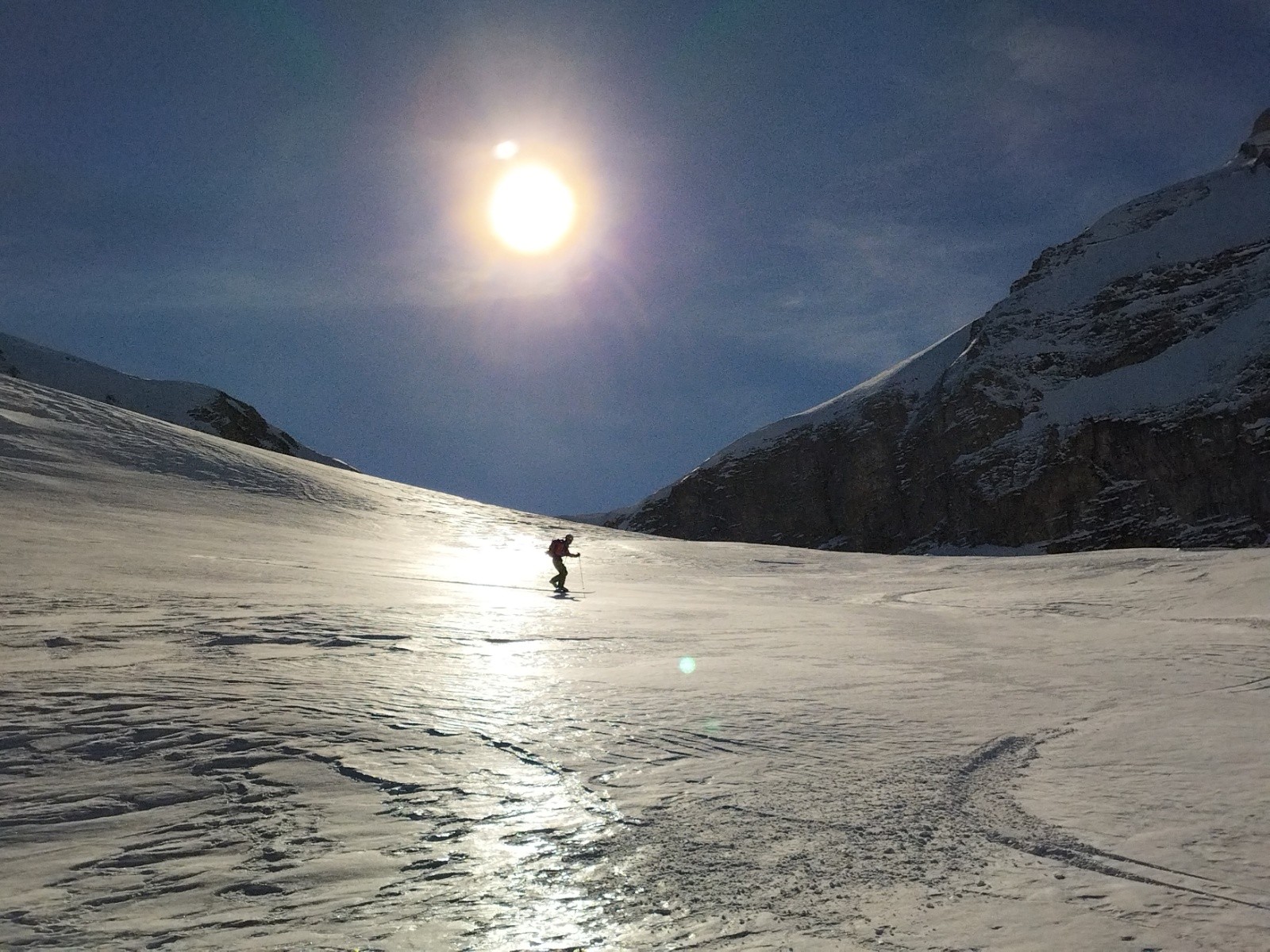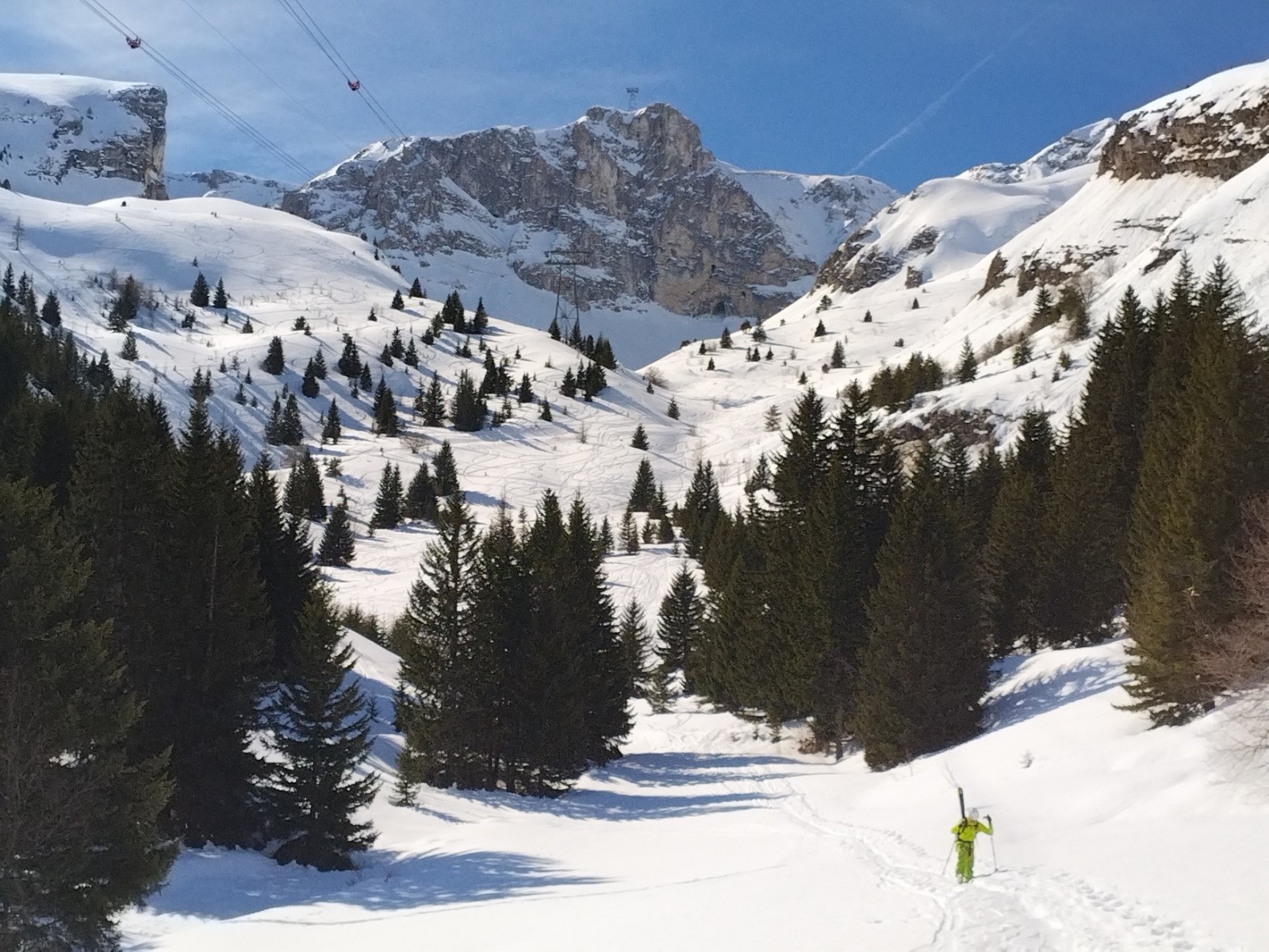 Conditions pour le ski : Un bon regel dans la combe mais pas dans la traversée en elle meme, neige compacte et lourde. à midi, le retour en plein soleil s'est fait sur neige collante.