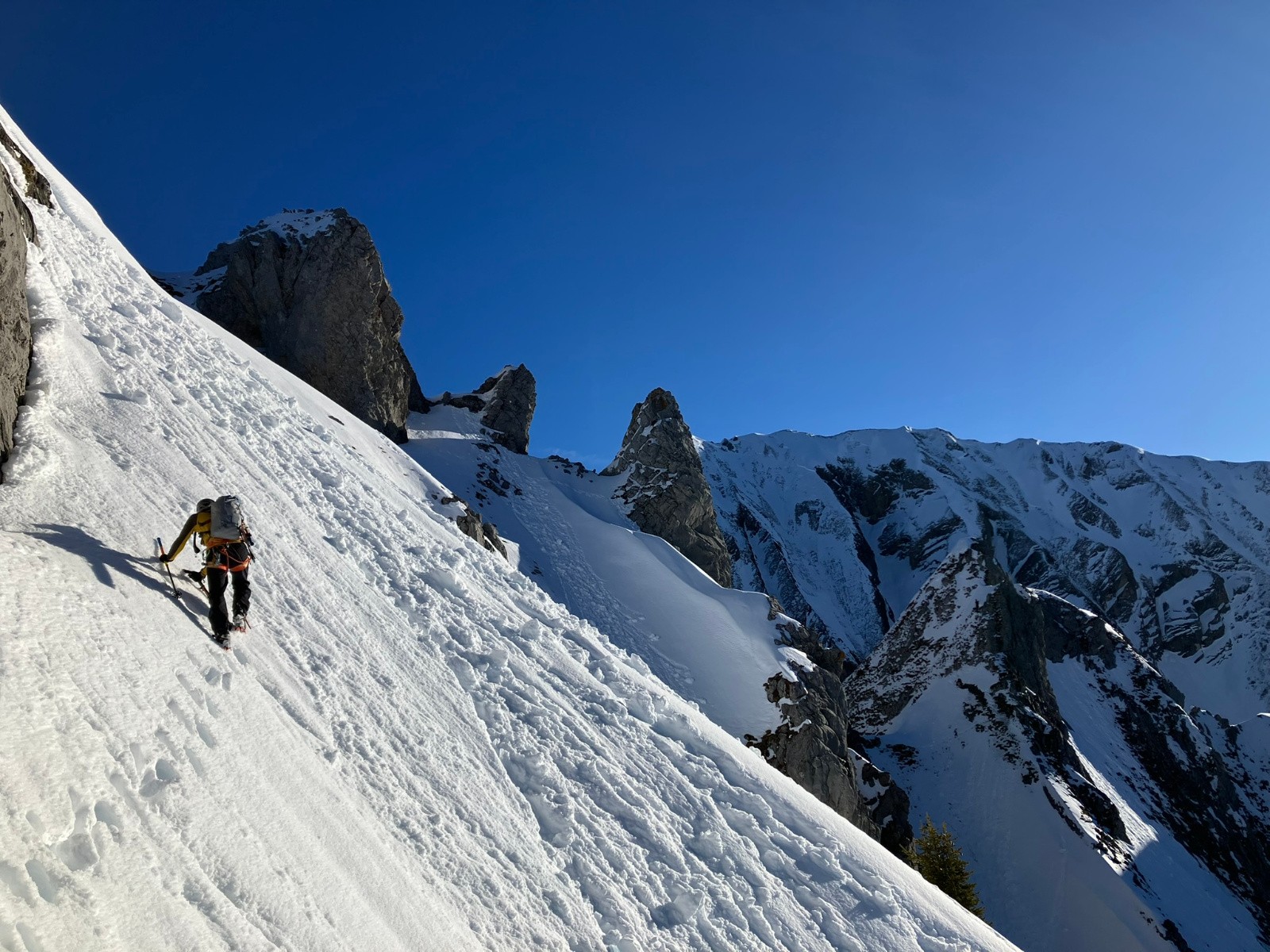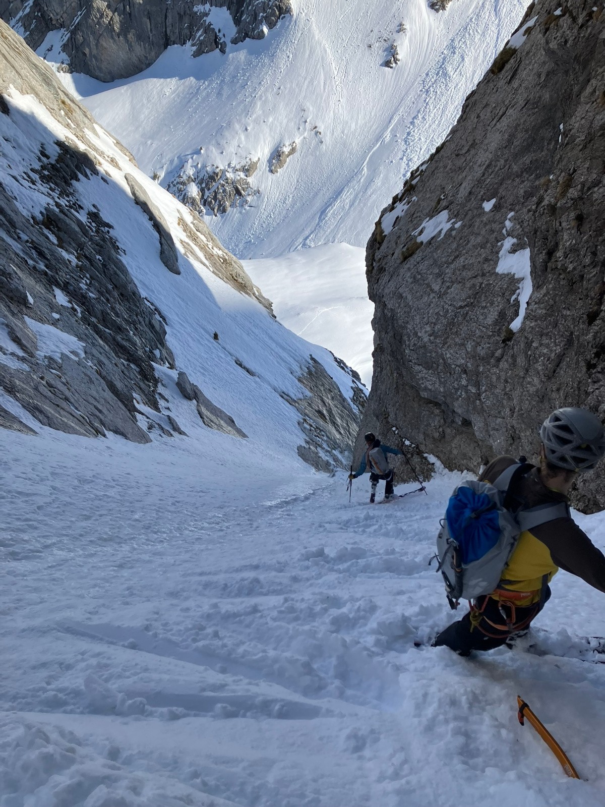 Maigre tentative de descendre la goulotte, mais conditions de neige pas folles, ça fait peur, on remonte c'est plus facile et sage.