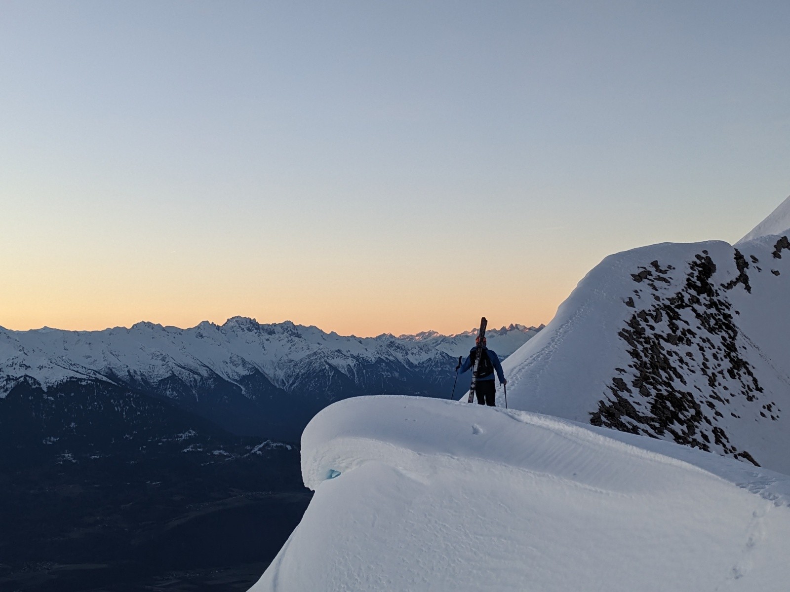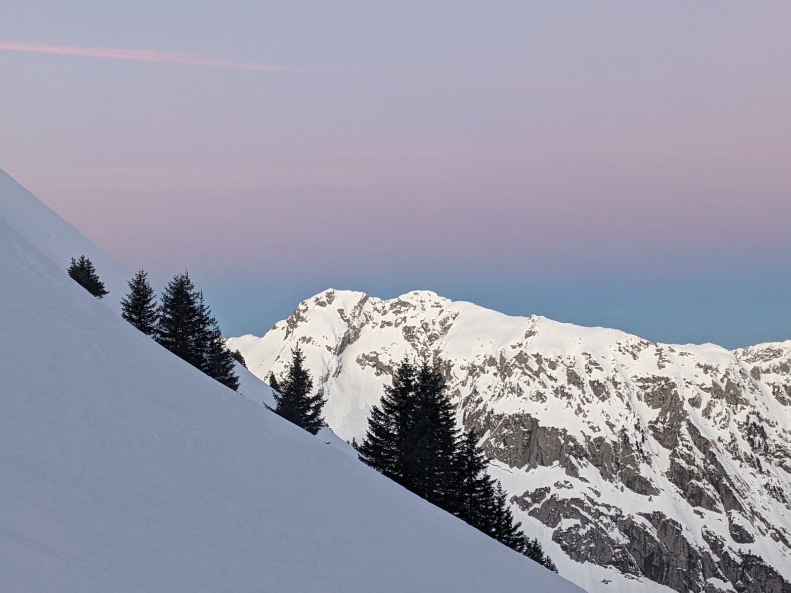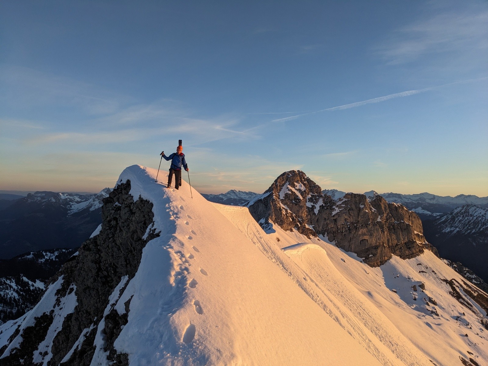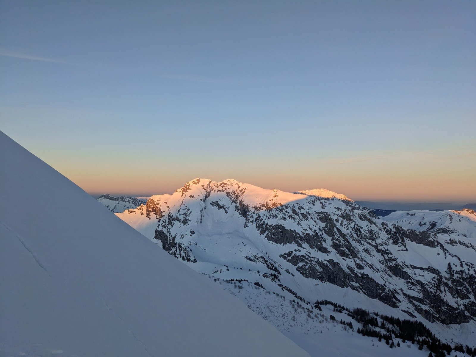 Combe de la petite Chaurionde, la trace zip avec les peaux trop usées, c'est pas très agréable mais ça monte efficacement en passant a côté. Arrive un peu avant le soleil pour l'arrête. Manip pour mettre les crampons, c'est bien parce qu'on les a monté la, il n'y en a pas vraiment besoin. Levez de soleil au milieu de l'arrête superbe, c'est la belle saison des matinales, faut espérer qu'elle dure un peu.