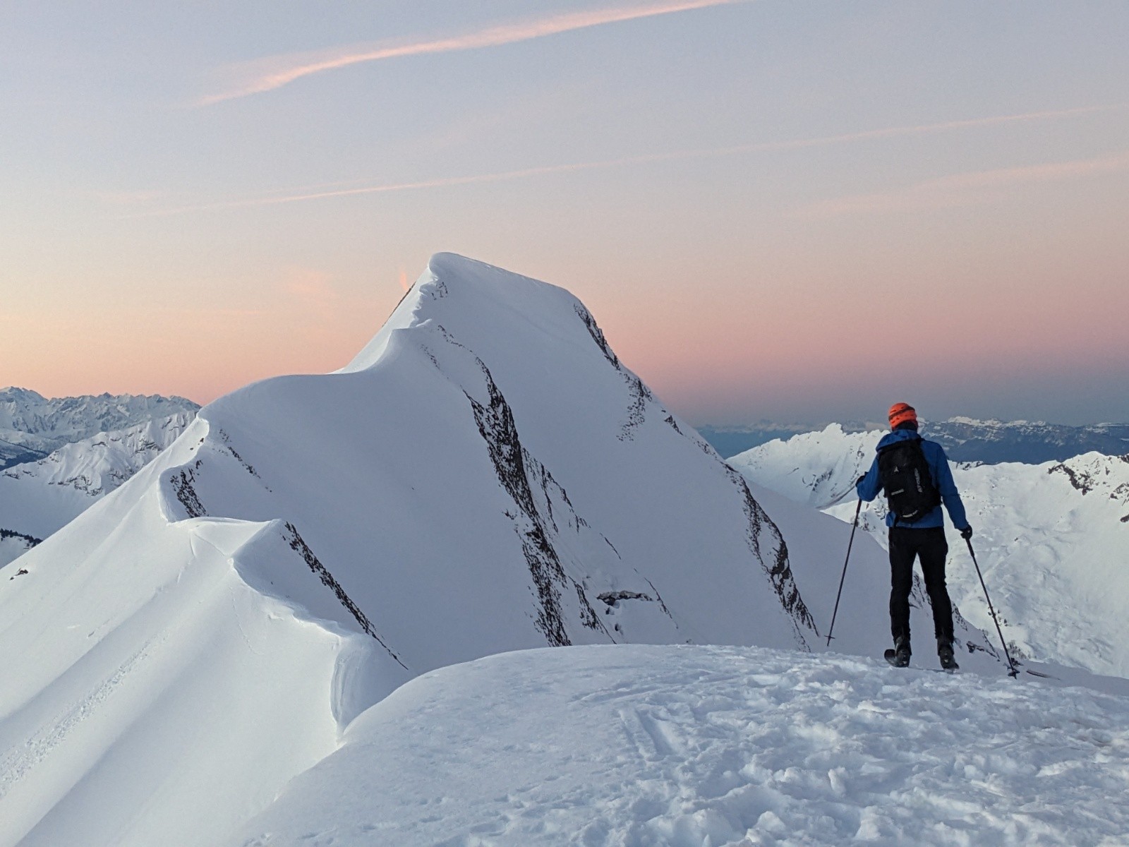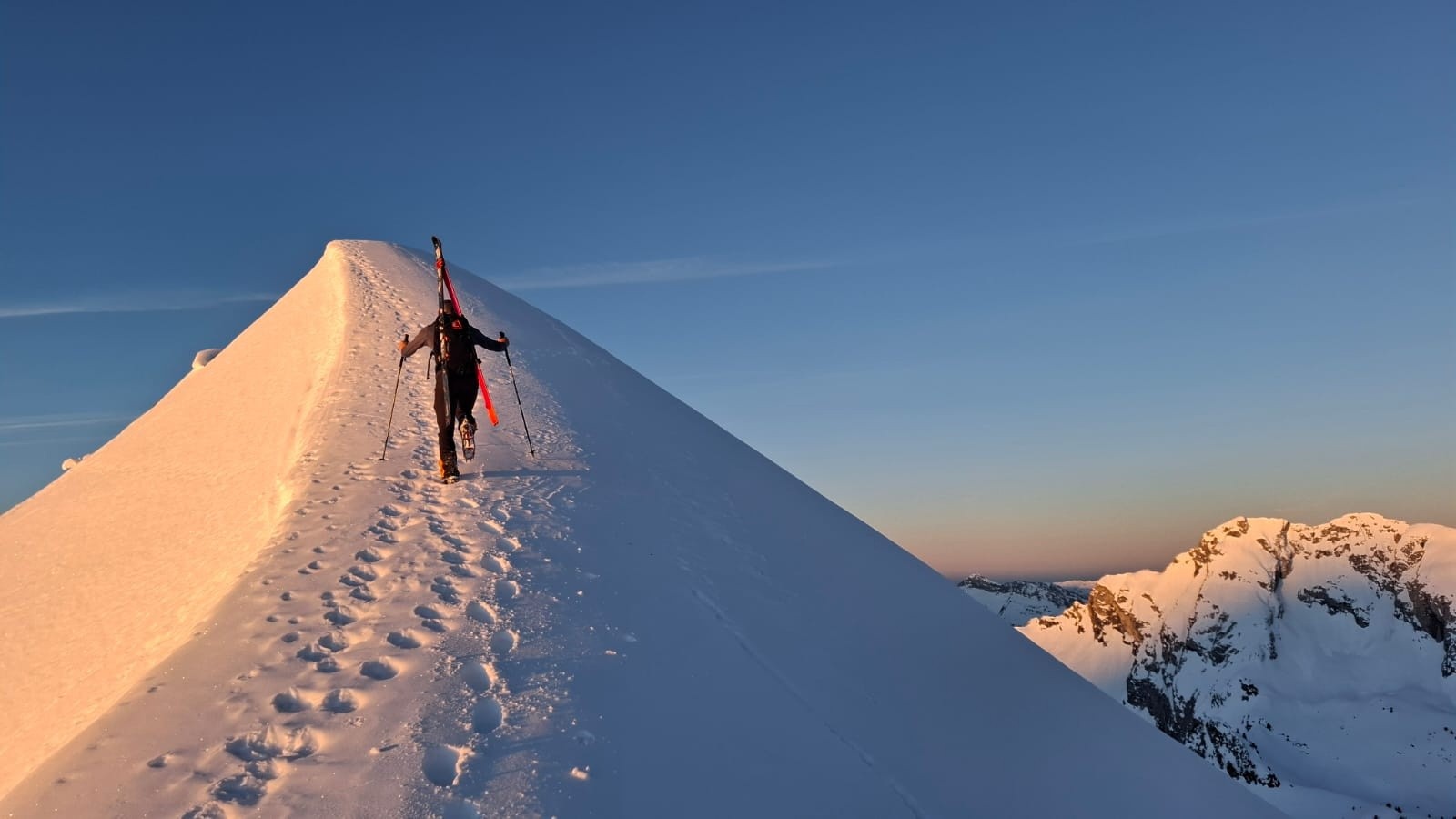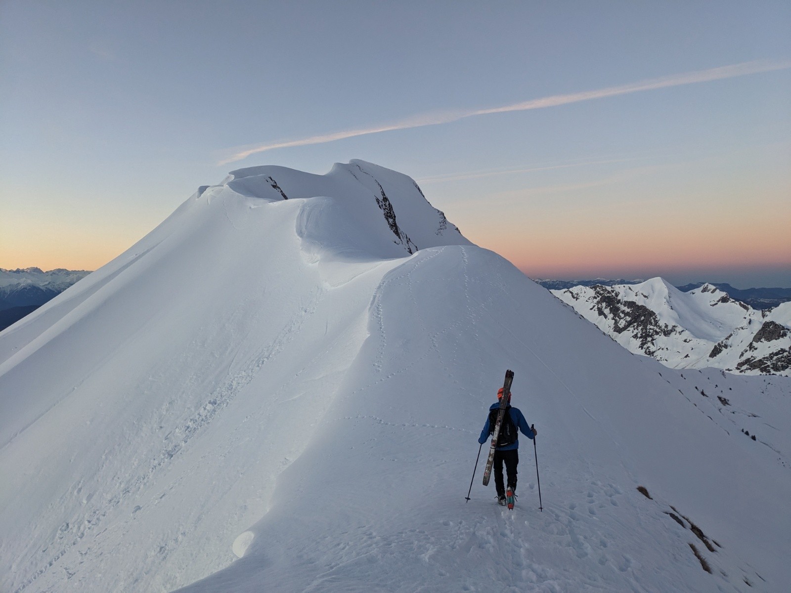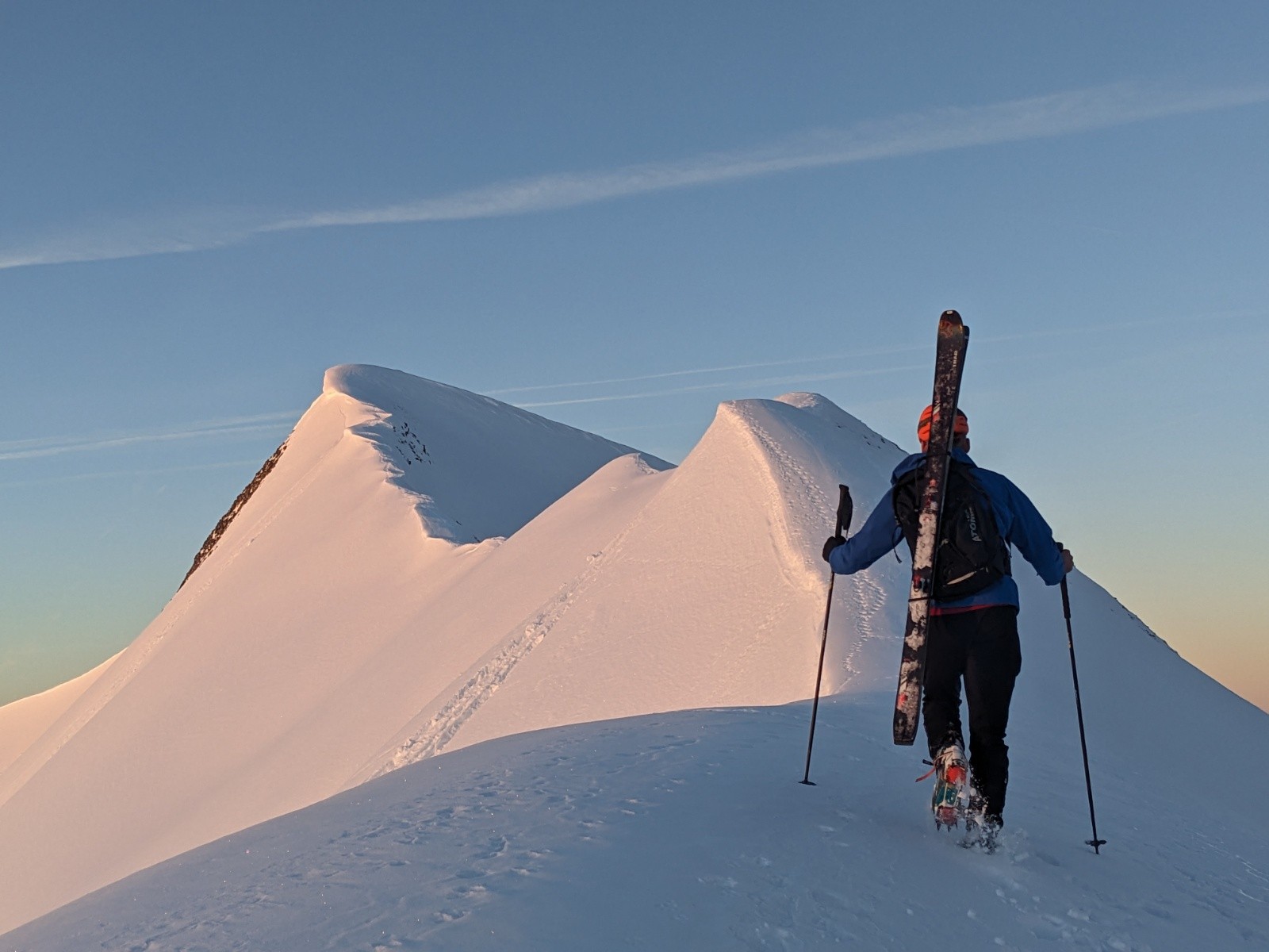 Combe de la petite Chaurionde, la trace zip avec les peaux trop usées, c'est pas très agréable mais ça monte efficacement en passant a côté. Arrive un peu avant le soleil pour l'arrête. Manip pour mettre les crampons, c'est bien parce qu'on les a monté la, il n'y en a pas vraiment besoin. Levez de soleil au milieu de l'arrête superbe, c'est la belle saison des matinales, faut espérer qu'elle dure un peu.