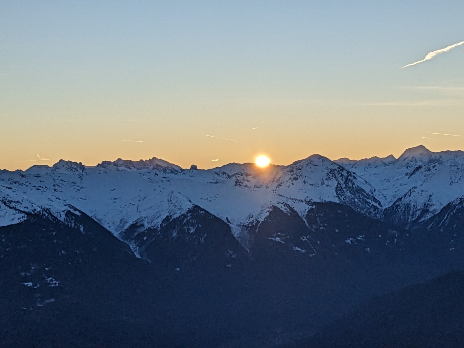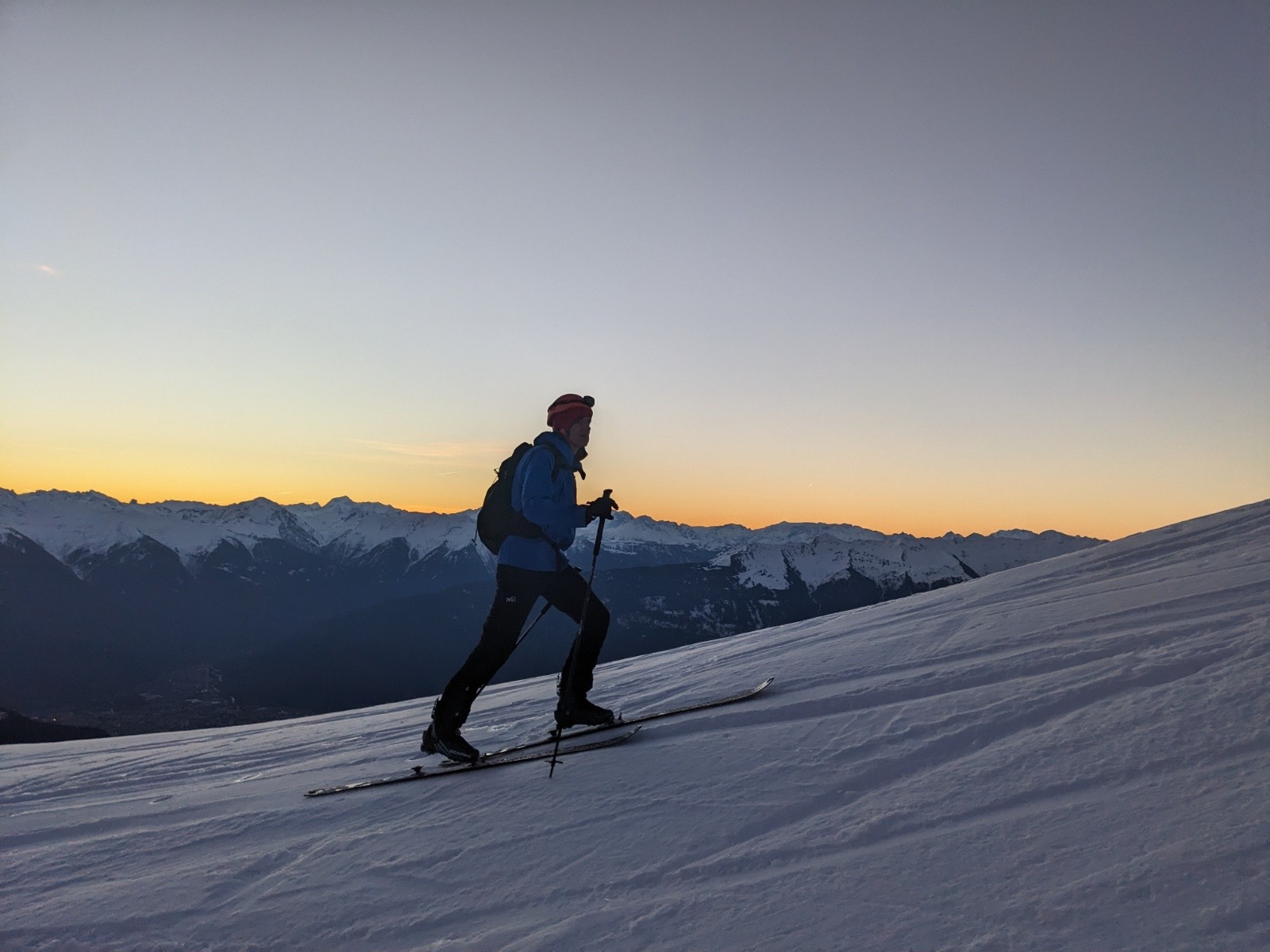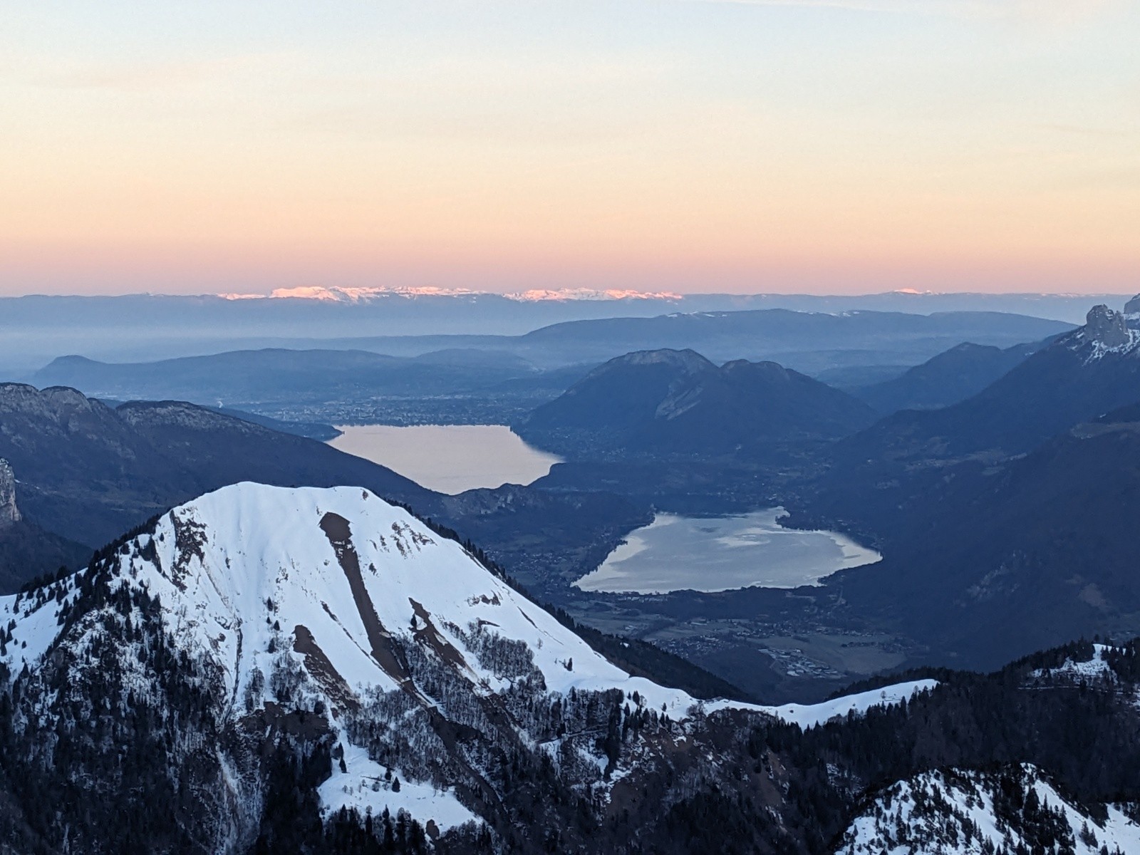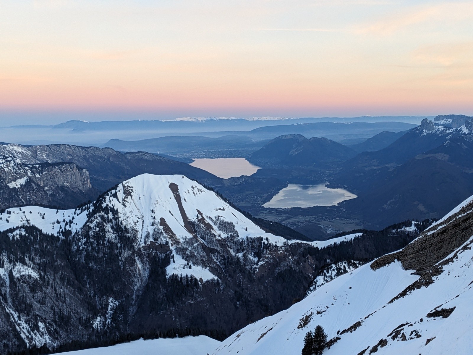 Combe de la petite Chaurionde, la trace zip avec les peaux trop usées, c'est pas très agréable mais ça monte efficacement en passant a côté. Arrive un peu avant le soleil pour l'arrête. Manip pour mettre les crampons, c'est bien parce qu'on les a monté la, il n'y en a pas vraiment besoin. Levez de soleil au milieu de l'arrête superbe, c'est la belle saison des matinales, faut espérer qu'elle dure un peu.