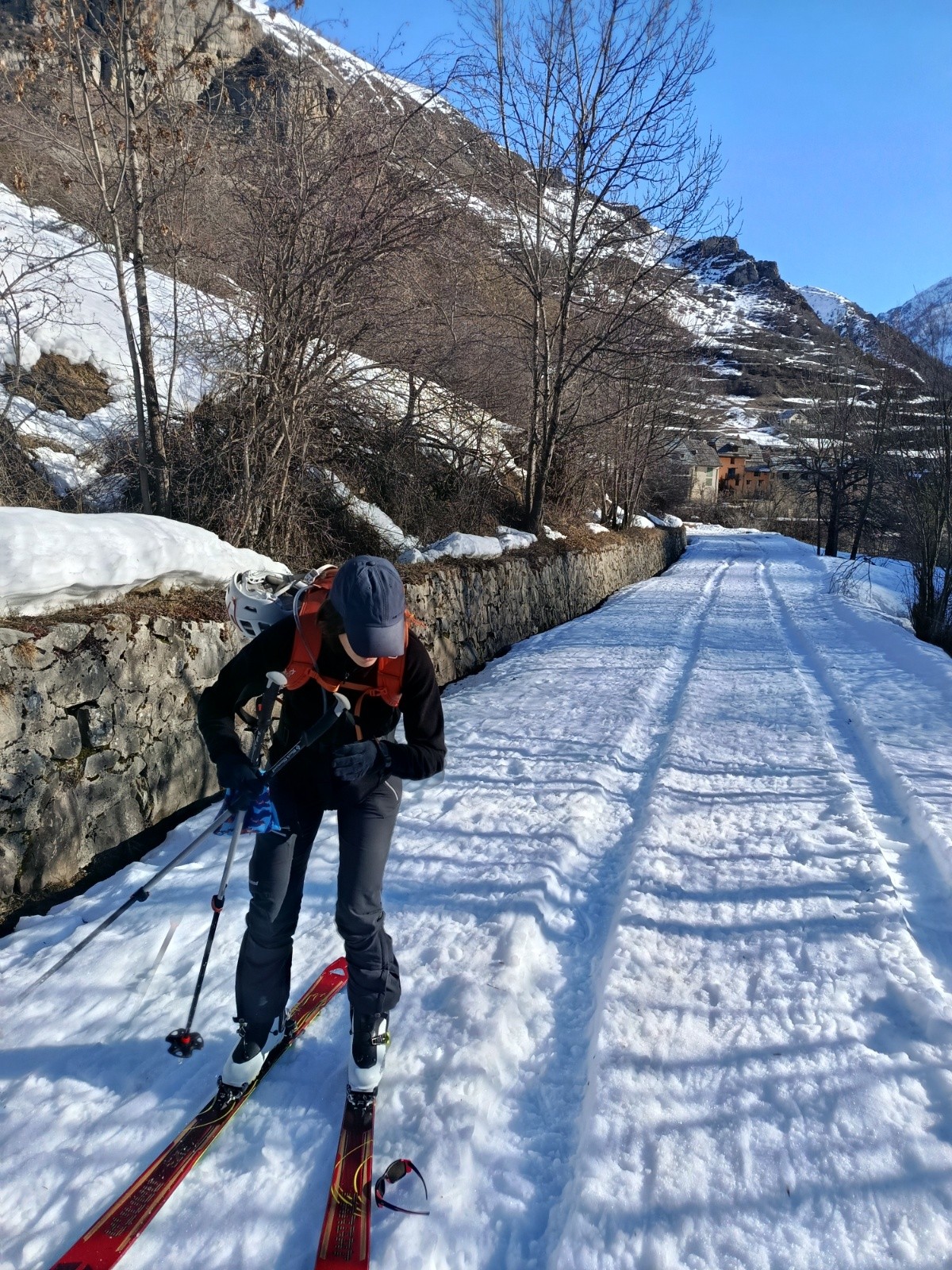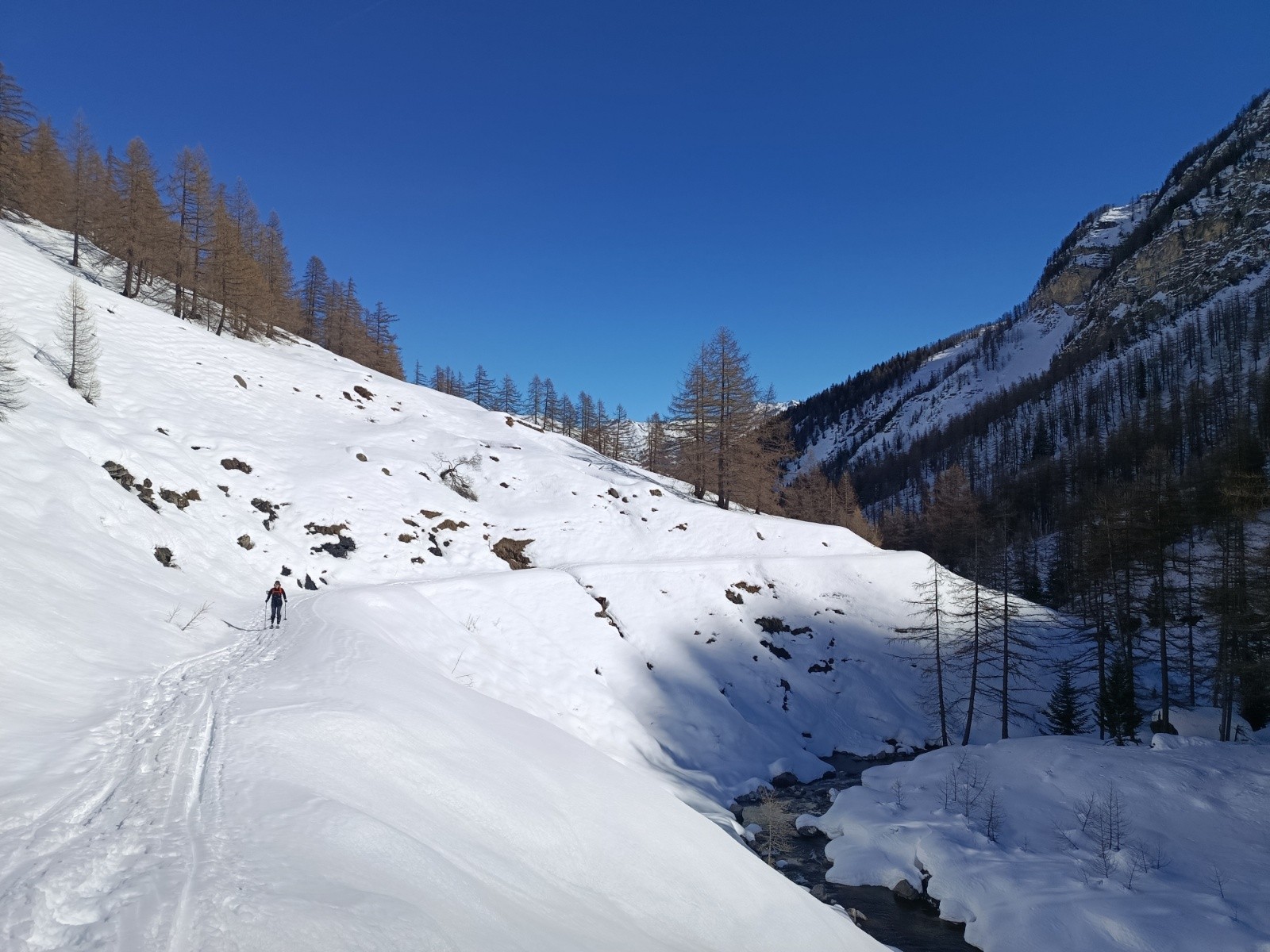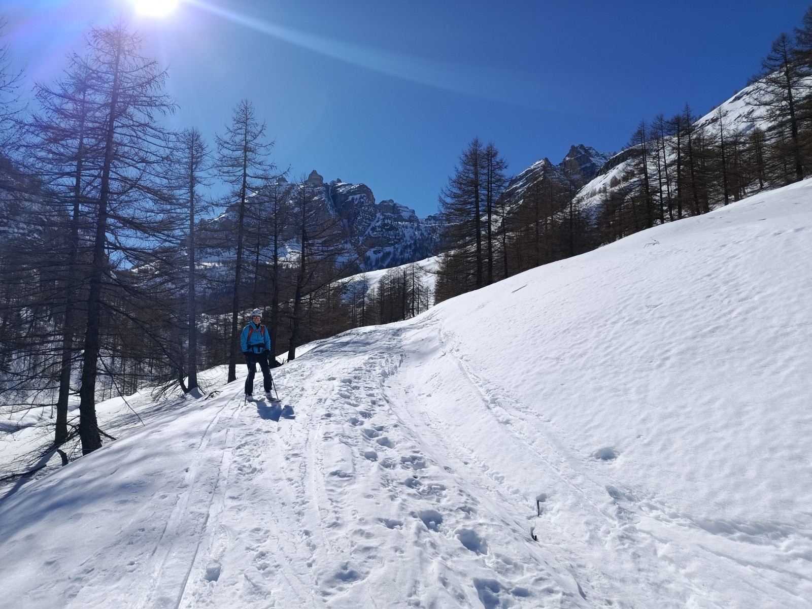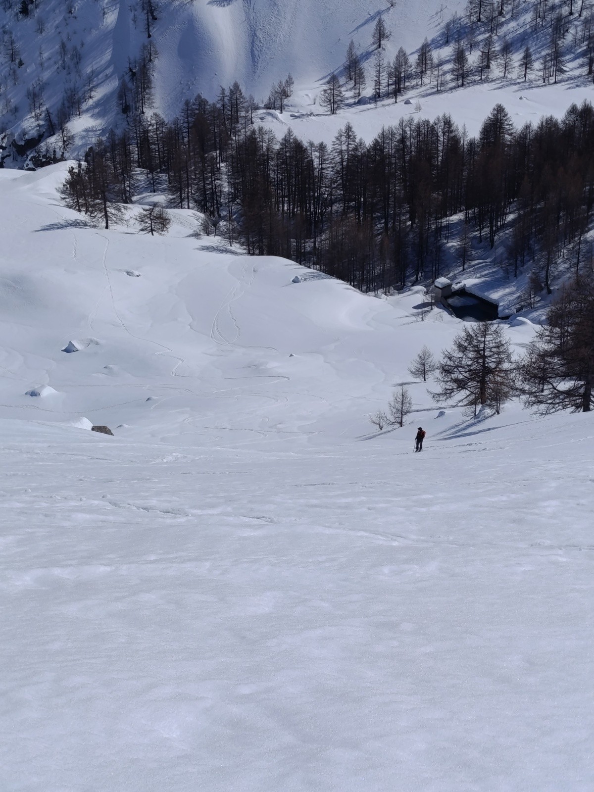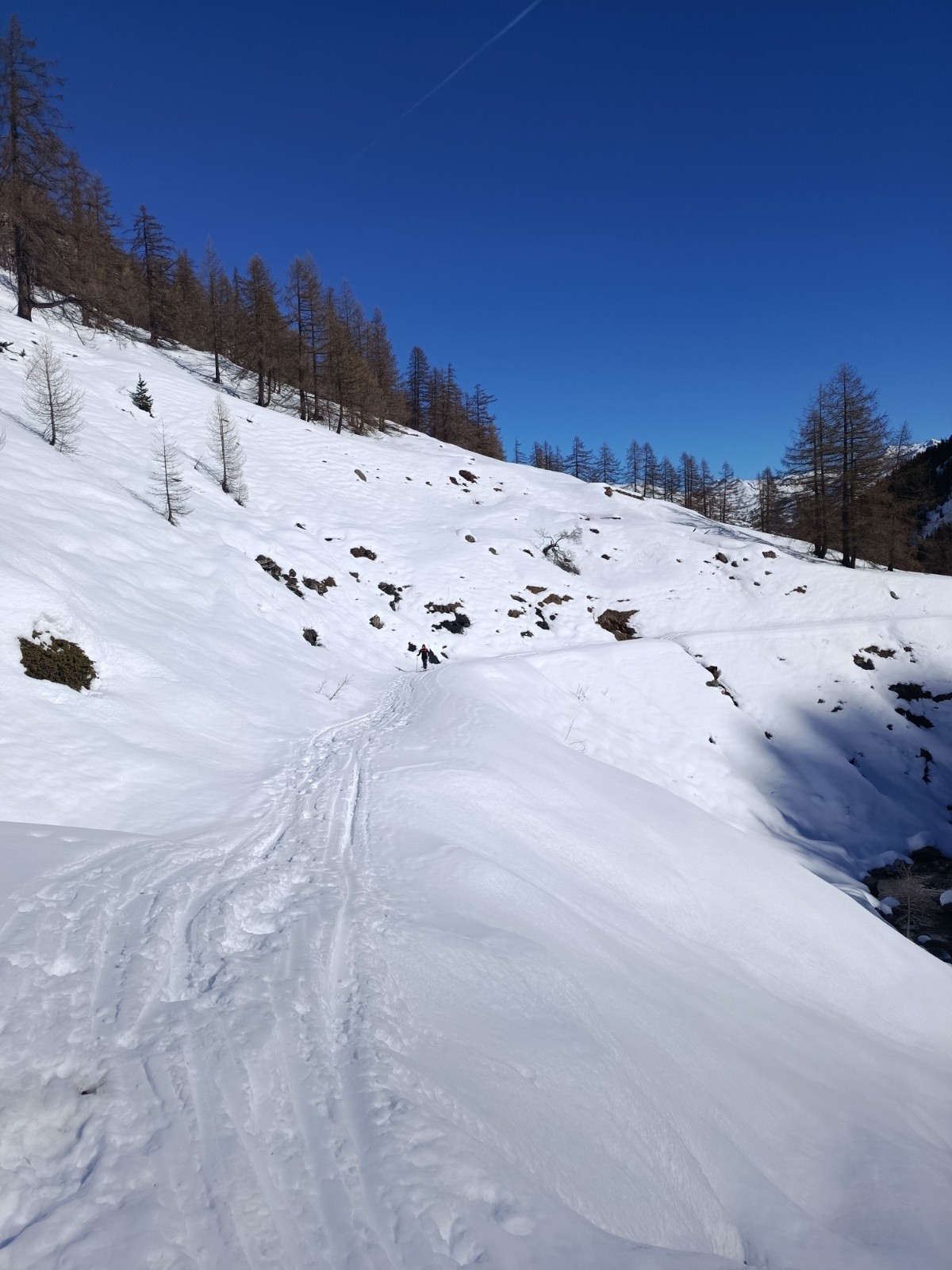 La piste passe bien malgré quelques coulées à franchir. (Seulement) 3 déchaussages! Glacée à l'aller , soupe au retour mais pas de cailloux et facile à skier.