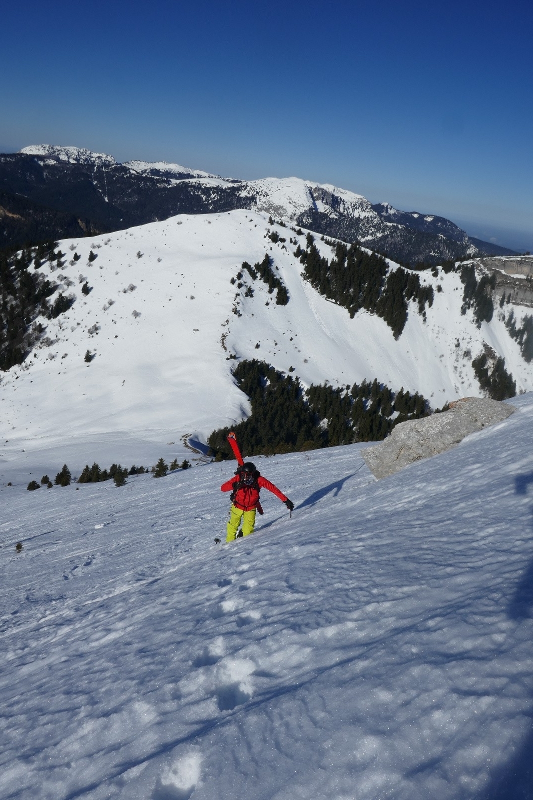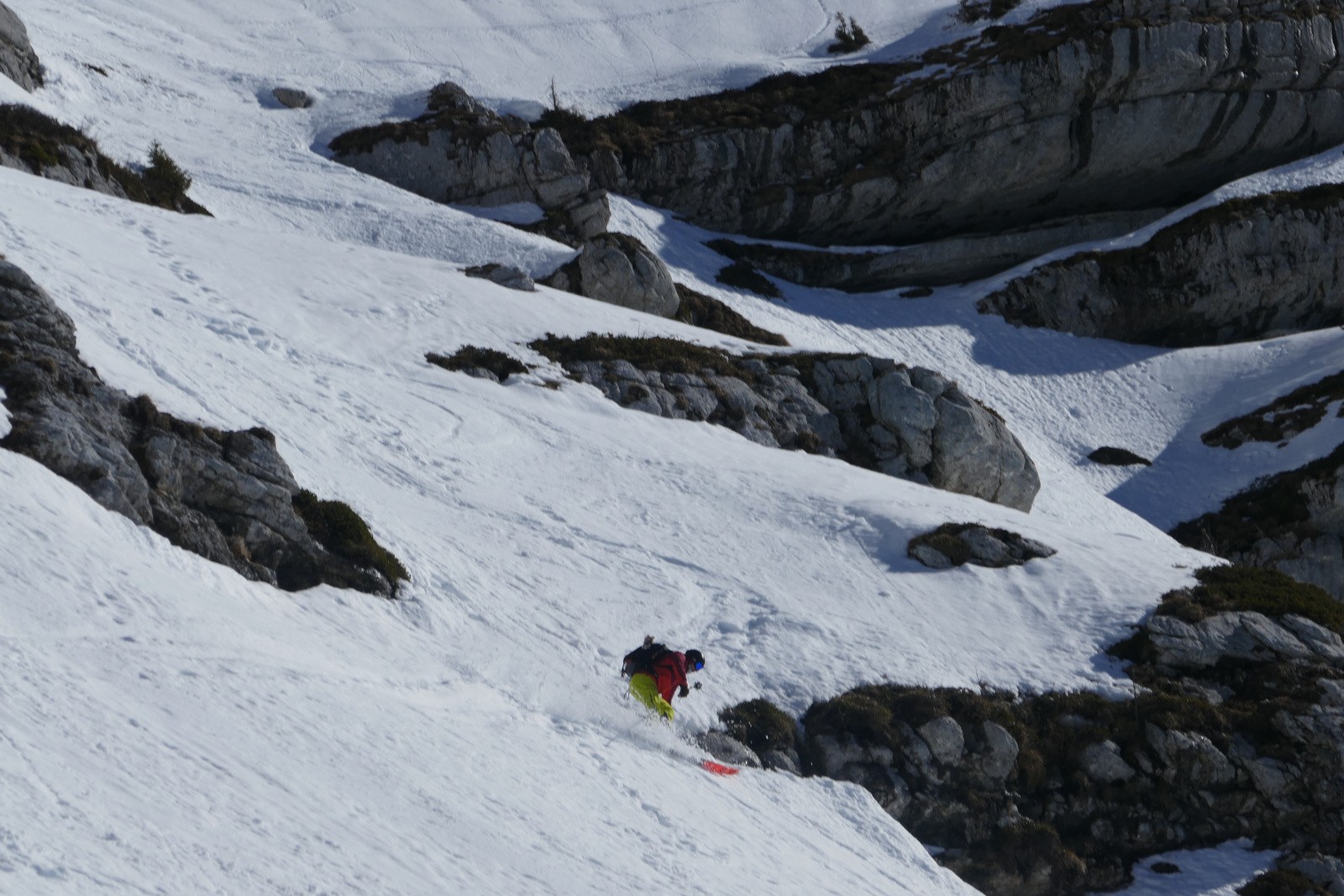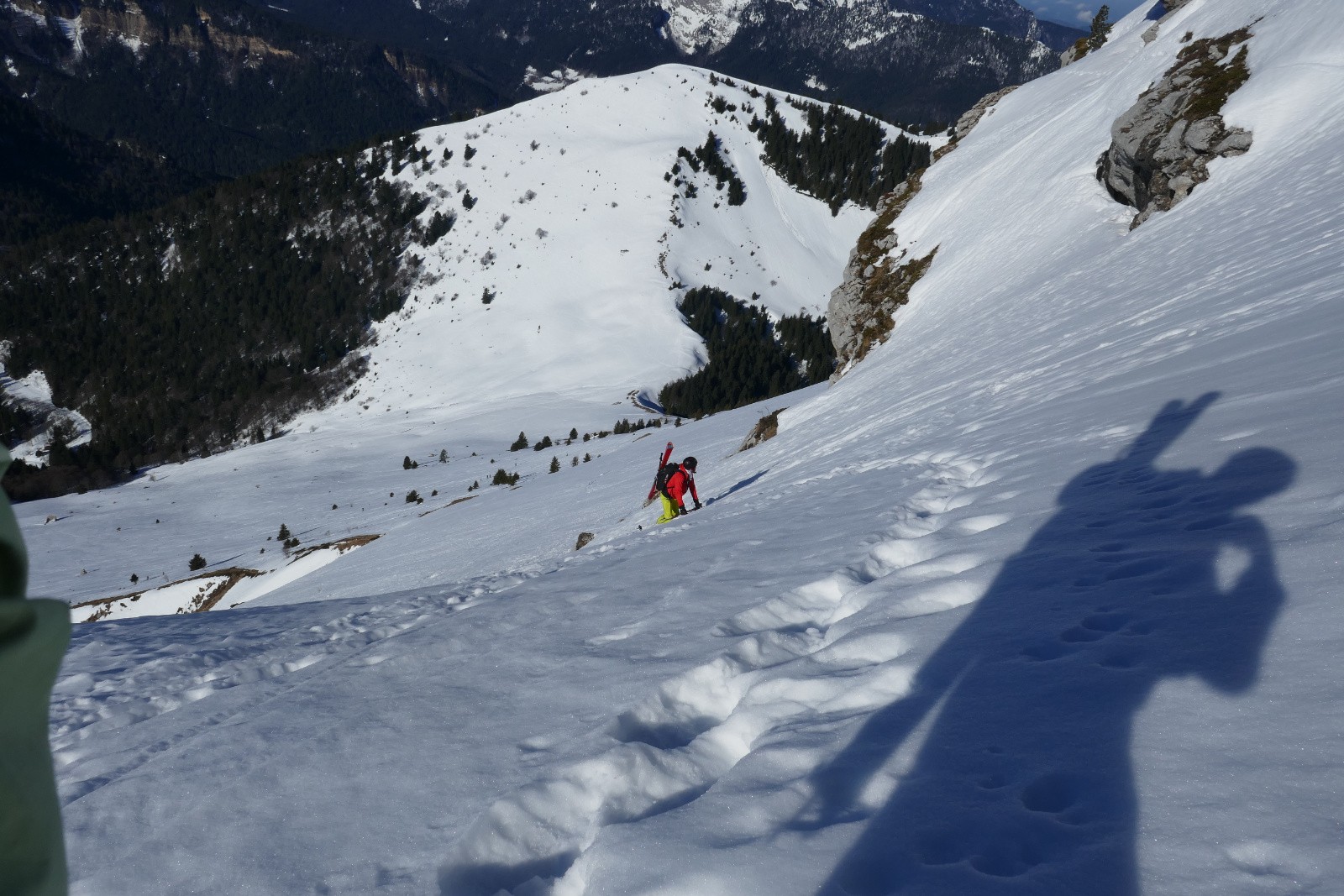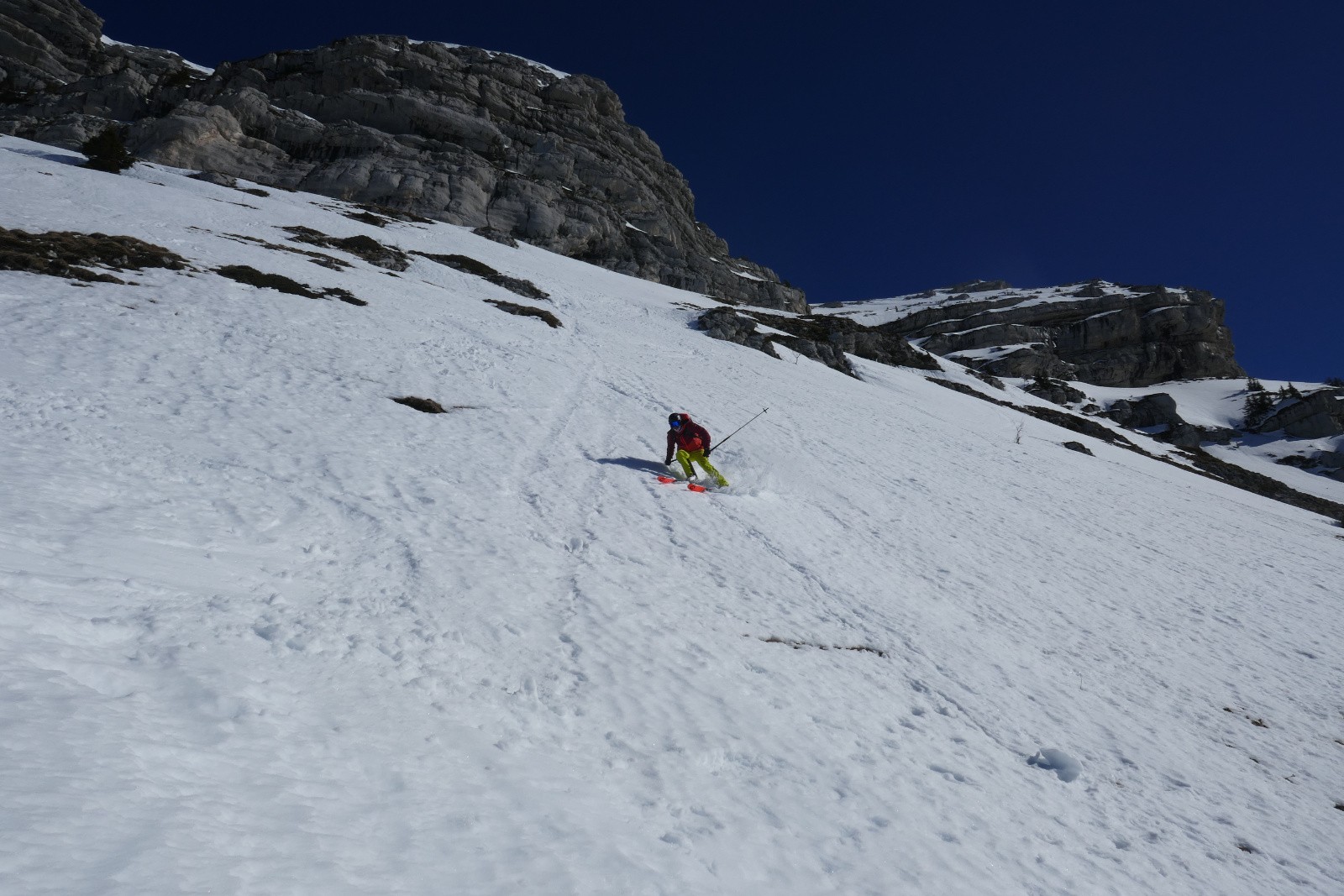 Nous empruntons le chemin de la Gorgette pour débuter quasi au sec jusque vers 1300m puis nous chaussons. Le regel apparait dans la prairie, il est relativement limité mais suffisant pour monter efficacement. Nous passons en crampons par confort dès 1850m puis atteignons le sommet à 10h30. Là, un vent d'Est désagréable apparaît; Bon, il est trop tôt pour le pas, on file faire quelques bon virages sur neige dure en nord. Plutôt agréable car très peu de traces et un excellent grip. On remonte au sommet où nous croisons un groupe de 6 jeunes; On emboitera leur pas pour la descente dans une neige venant juste de décailler dans le Pas de l'Oeille.