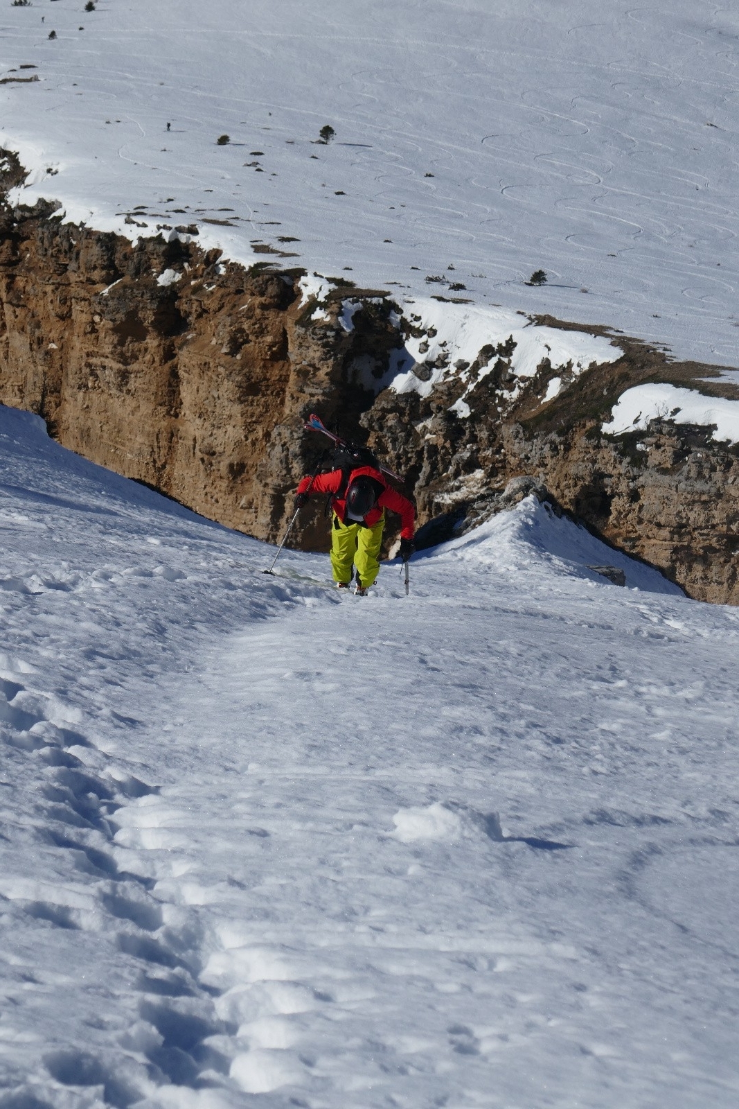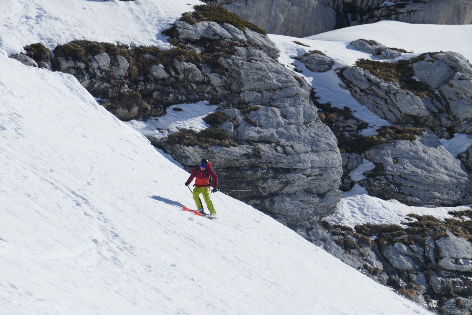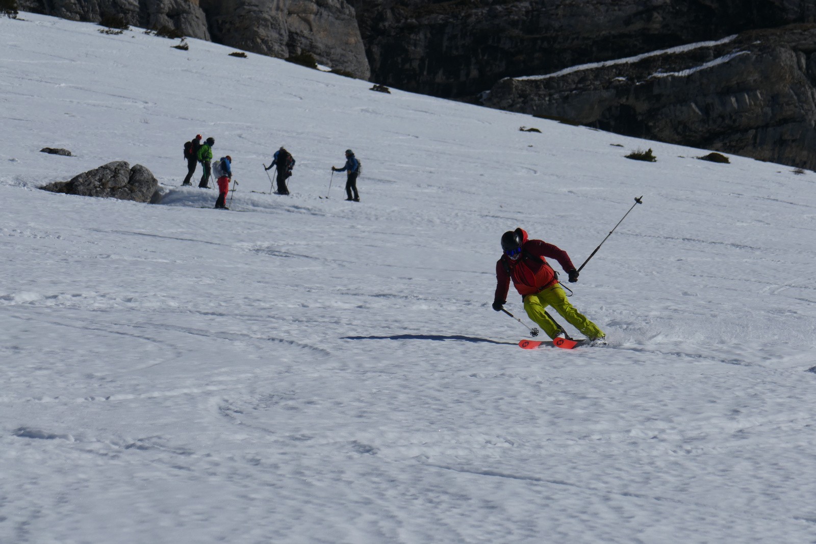 Nous empruntons le chemin de la Gorgette pour débuter quasi au sec jusque vers 1300m puis nous chaussons. Le regel apparait dans la prairie, il est relativement limité mais suffisant pour monter efficacement. Nous passons en crampons par confort dès 1850m puis atteignons le sommet à 10h30. Là, un vent d'Est désagréable apparaît; Bon, il est trop tôt pour le pas, on file faire quelques bon virages sur neige dure en nord. Plutôt agréable car très peu de traces et un excellent grip. On remonte au sommet où nous croisons un groupe de 6 jeunes; On emboitera leur pas pour la descente dans une neige venant juste de décailler dans le Pas de l'Oeille.