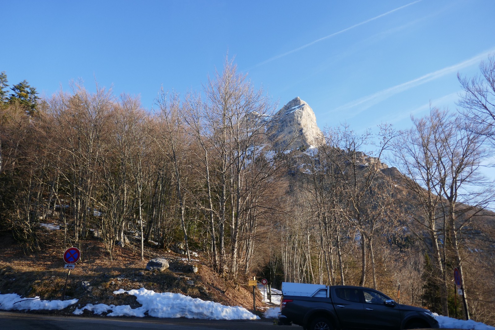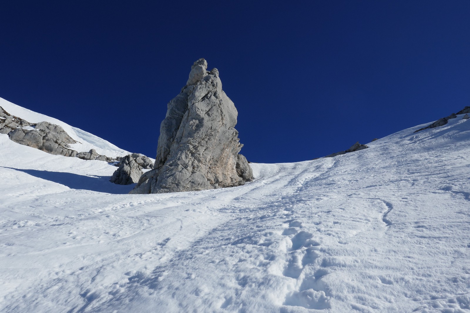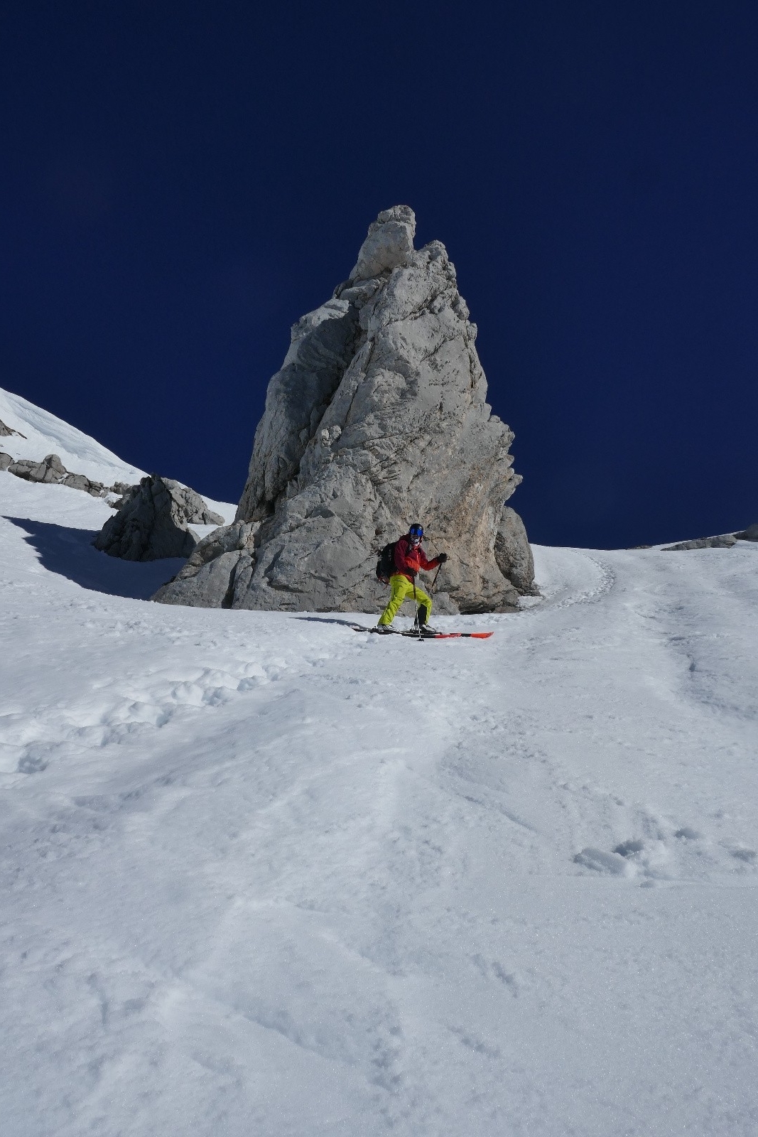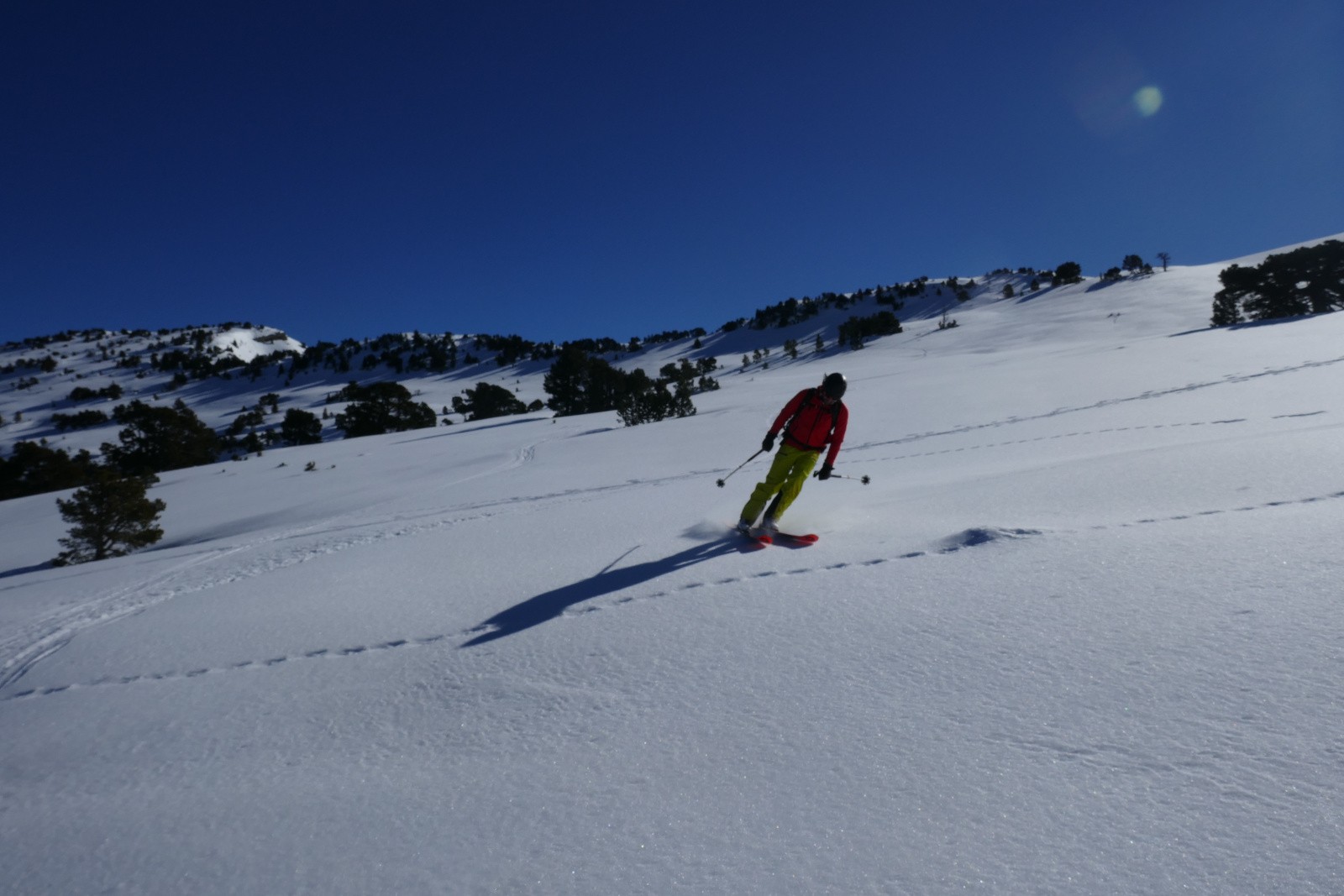 Nous empruntons le chemin de la Gorgette pour débuter quasi au sec jusque vers 1300m puis nous chaussons. Le regel apparait dans la prairie, il est relativement limité mais suffisant pour monter efficacement. Nous passons en crampons par confort dès 1850m puis atteignons le sommet à 10h30. Là, un vent d'Est désagréable apparaît; Bon, il est trop tôt pour le pas, on file faire quelques bon virages sur neige dure en nord. Plutôt agréable car très peu de traces et un excellent grip. On remonte au sommet où nous croisons un groupe de 6 jeunes; On emboitera leur pas pour la descente dans une neige venant juste de décailler dans le Pas de l'Oeille.