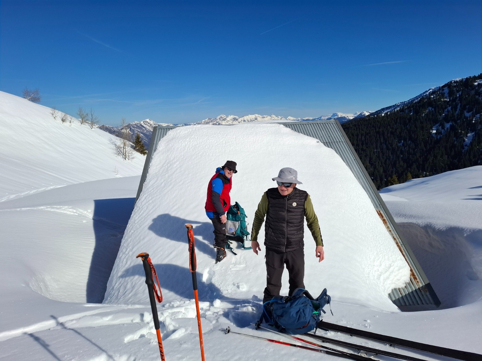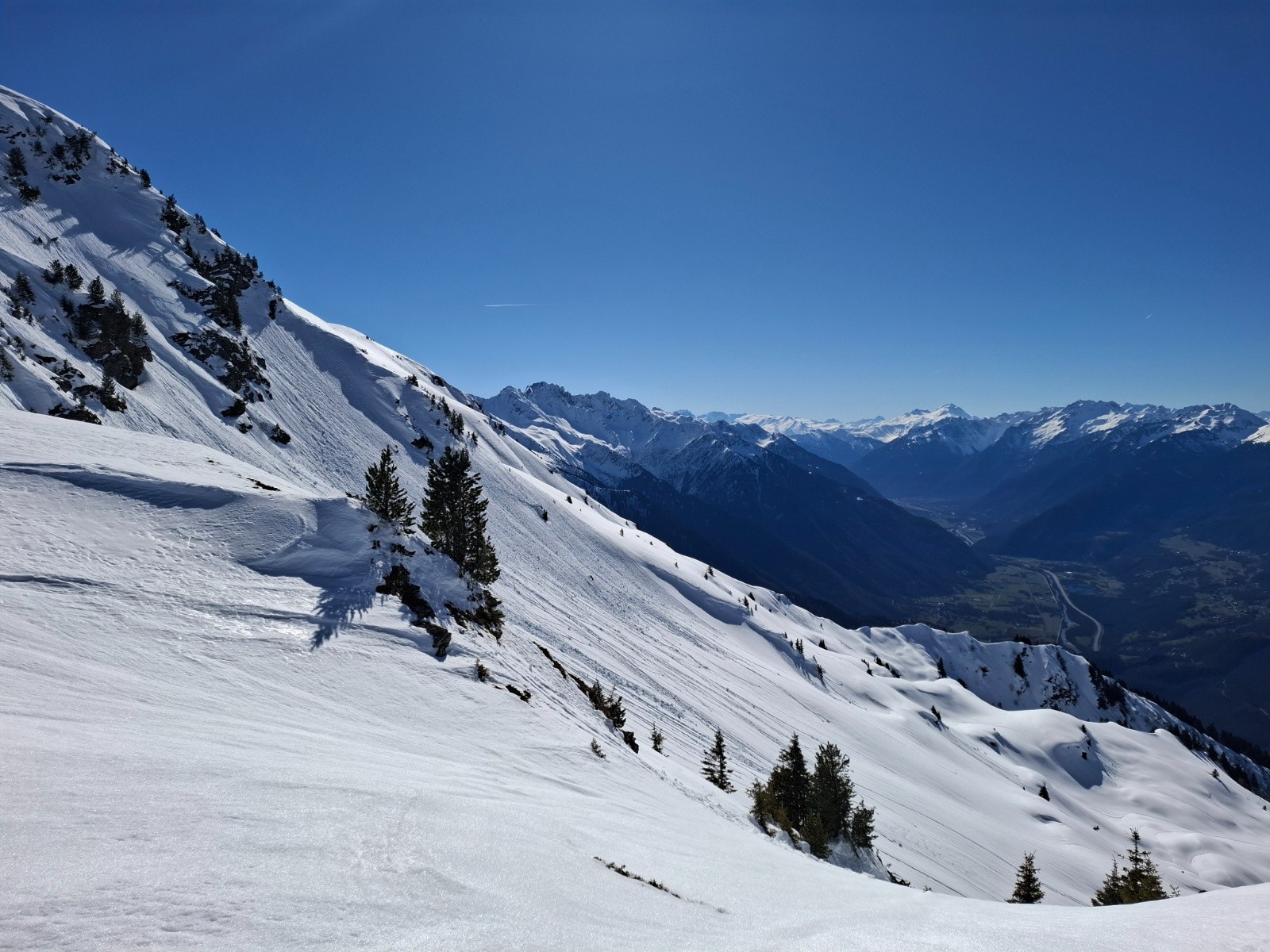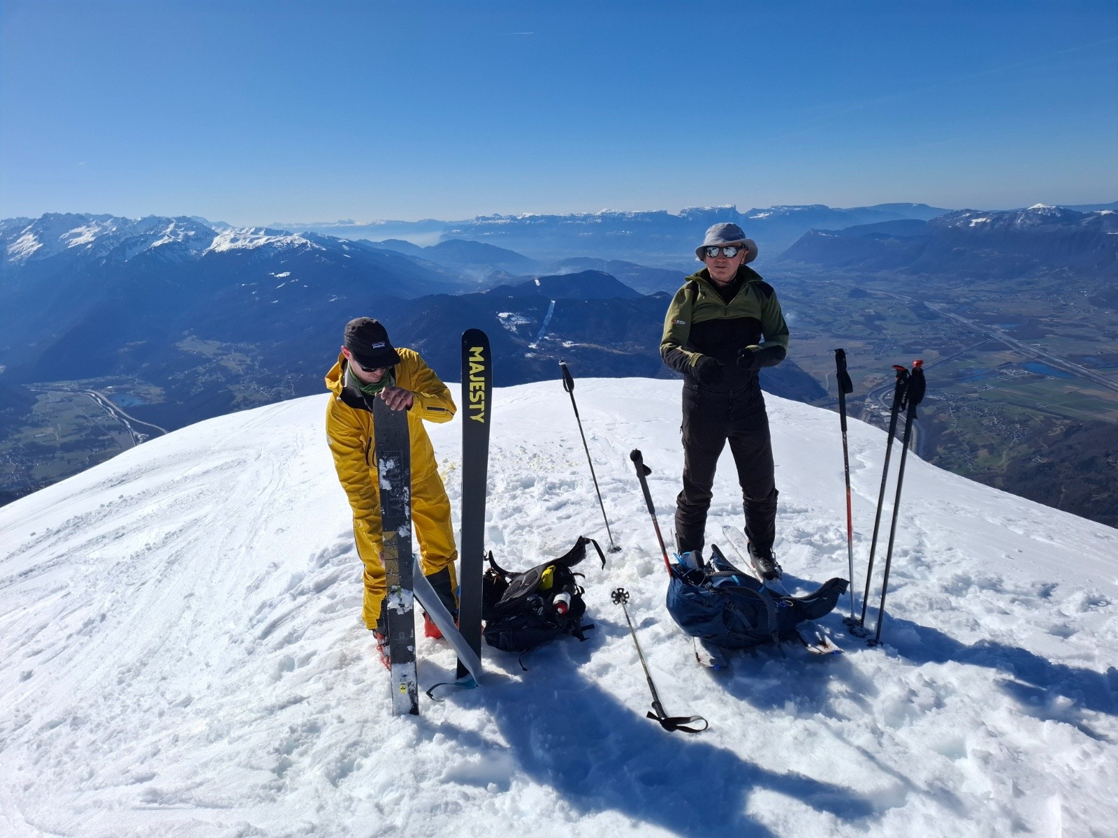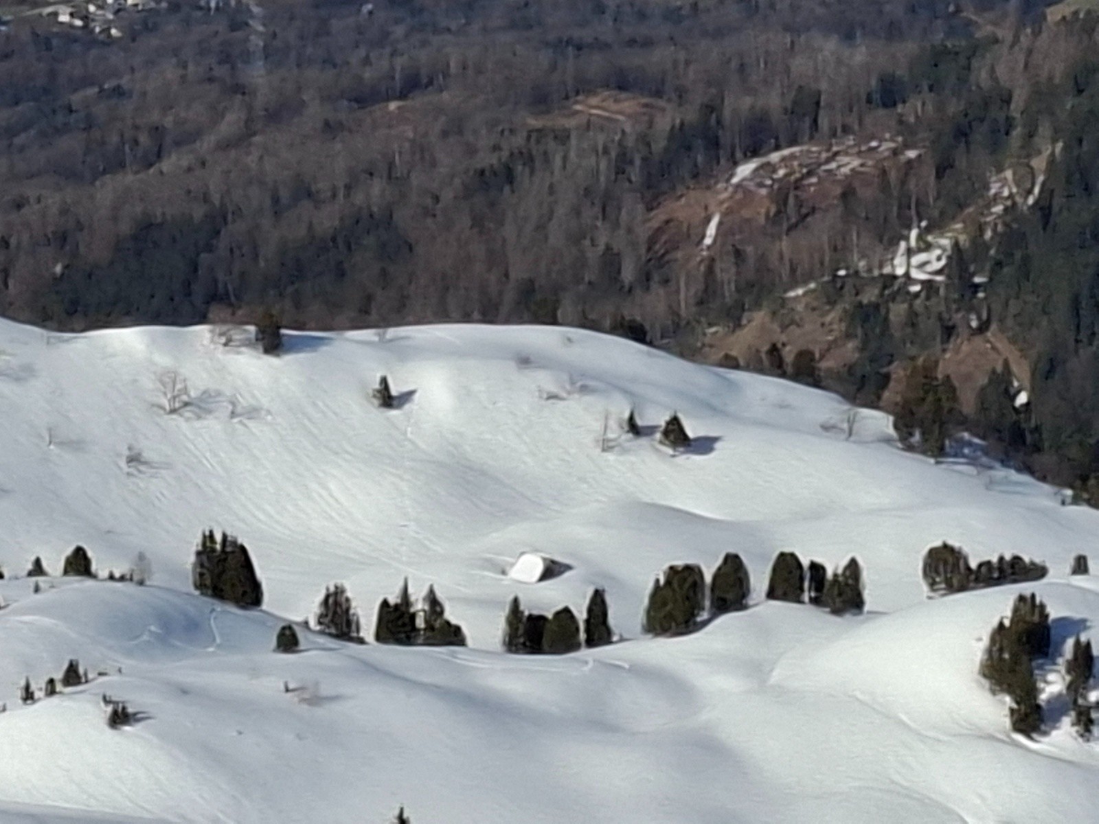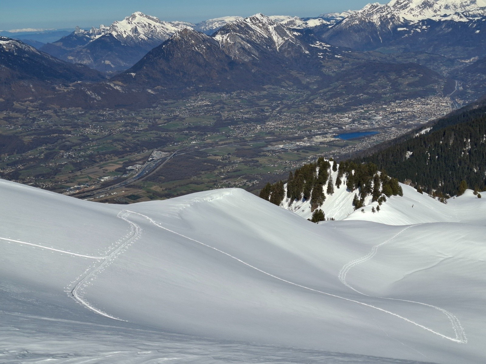 Récit : Réveil et démarrage matinal pour éviter une très grosse chaleur au retour (ca nous change 😂), pas de réel regel, neige légèrement dure en suivant la trace, cassante en sortant de cette dernière. Montée au Petit Arc en suivant une belle trace en zig zag pas très raide, merci aux traceurs👍. Nous étions partis initialement pour le Grand Arc mais nous nous contenterons du Petit Arc comme la personne qui nous a précédé et celles qui nous suivent. L'arête pour rejoindre le Grand Arc n'est pas jouable à moins de la faire en piolet crampons ( et encore😒). Redescendre et traverser en dessous du grand Arc pour rejoindre un col à droite de ce dernier et rejoindre le sommet, ne nous inspire pas non plus à cause de grosses cassure sous le grand Arc. Du coup , explorateurs, nous basculons en nord en direction de la forêt communal de Bonvillard. Seuls au monde, une bonne neige qui commence à ramollir dans les coins ensoleillés et une vielle poudre dans les coins à l'ombre. Pour de la moquette il faudrait encore attendre à minima 1h. Stop à coté d'un petit chalet (Chalet du Maret) vers 11H pour un long et bon casse croute. Remontée au petit arc (merci à notre traceur Rémi) en rejoignant l'arête gauche de ce dernier puis descente finale. La neige est bien molle, des escargots partent par endroit, nous avons bien fait de ne pas descendre plus tard. Petit bière en final au bar du parking pour clôturer cette belle journée et la découverte du versant sauvage coté Bonvillard.