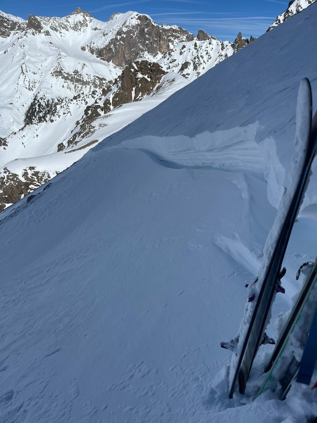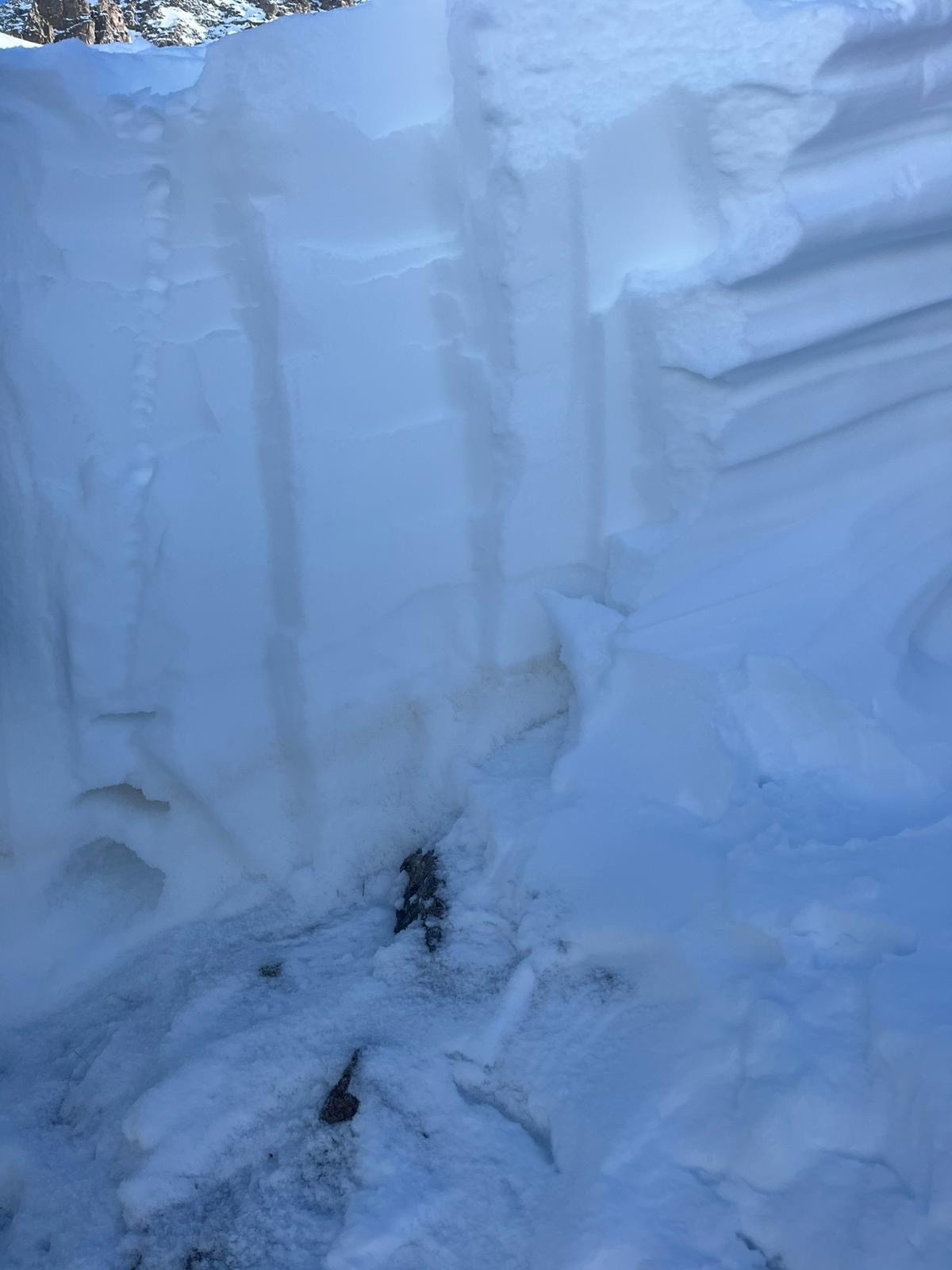 Conditions nivo et activité avalancheuse : objectif de la sortie : faire une coupe nivologique de la cassure d’avalanche récente du vallon de Combeynot (https://www.data-avalanche.org/avalanche/1771490283365) avec notre formateur ANENA. Coupe de 120cm, au plus profond de la combe on a sondé à 240cm.