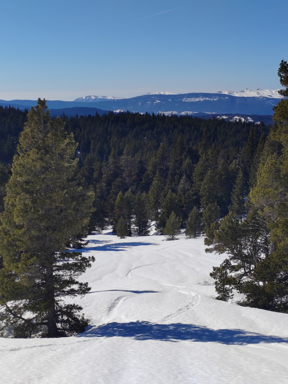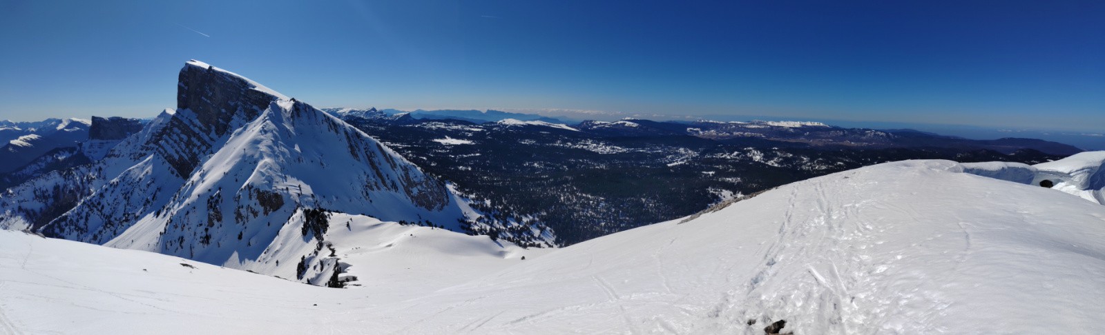 Je remets les skis pour une arrivée à l'antécime de Pierre Blanche à 12h30. Superbe paysage!