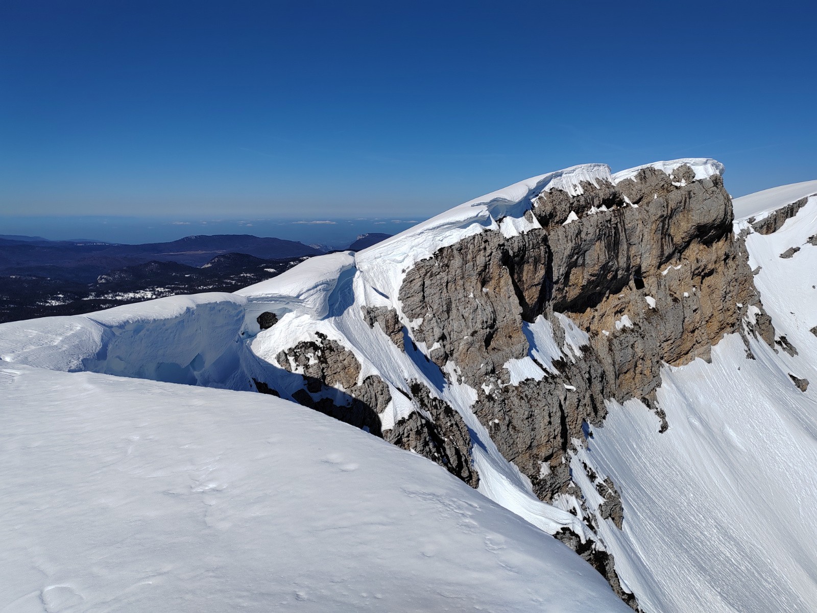 Passage de l'arête (100m) en crampons (ça passe probablement à pied). Beaucoup de neige fondue et on s'enfonce beaucoup. Attention aux corniches, j'ai vu des traces de pas dessus!