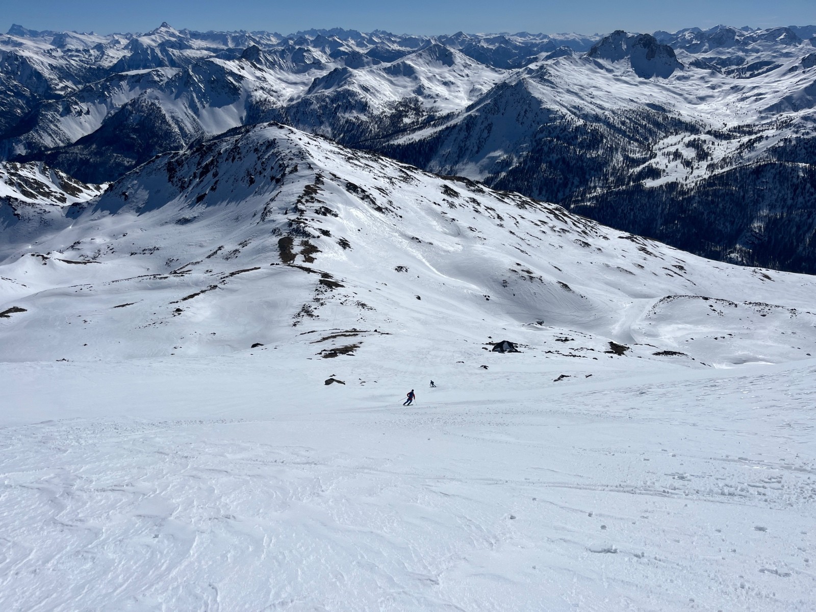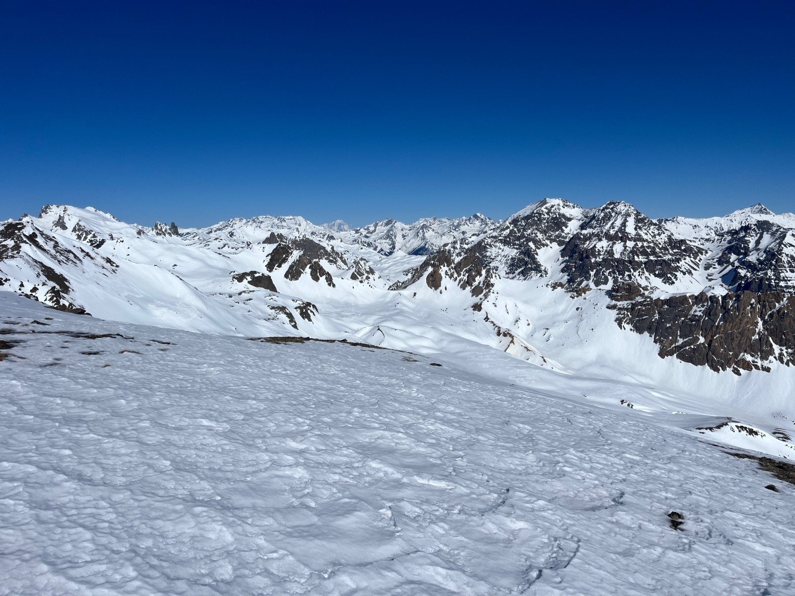 Conditions pour le ski : superbe moquette du sommet jusqu’à 2200/2300 m environ, en visant bien les pentes les plus lisses. Neige transformée de plus en plus épaisse en dessous.