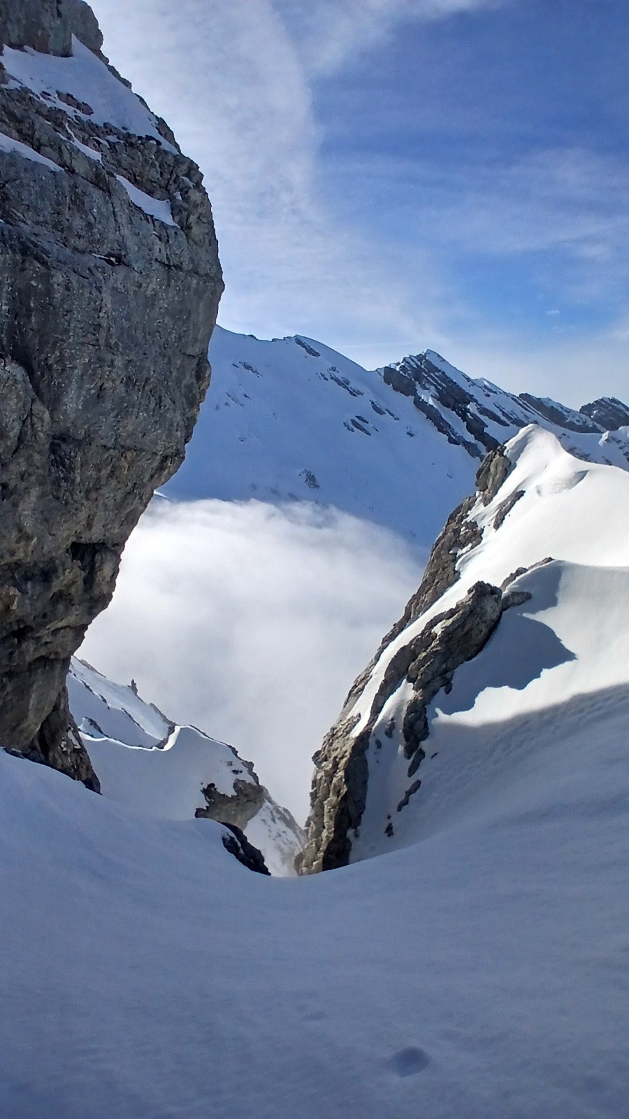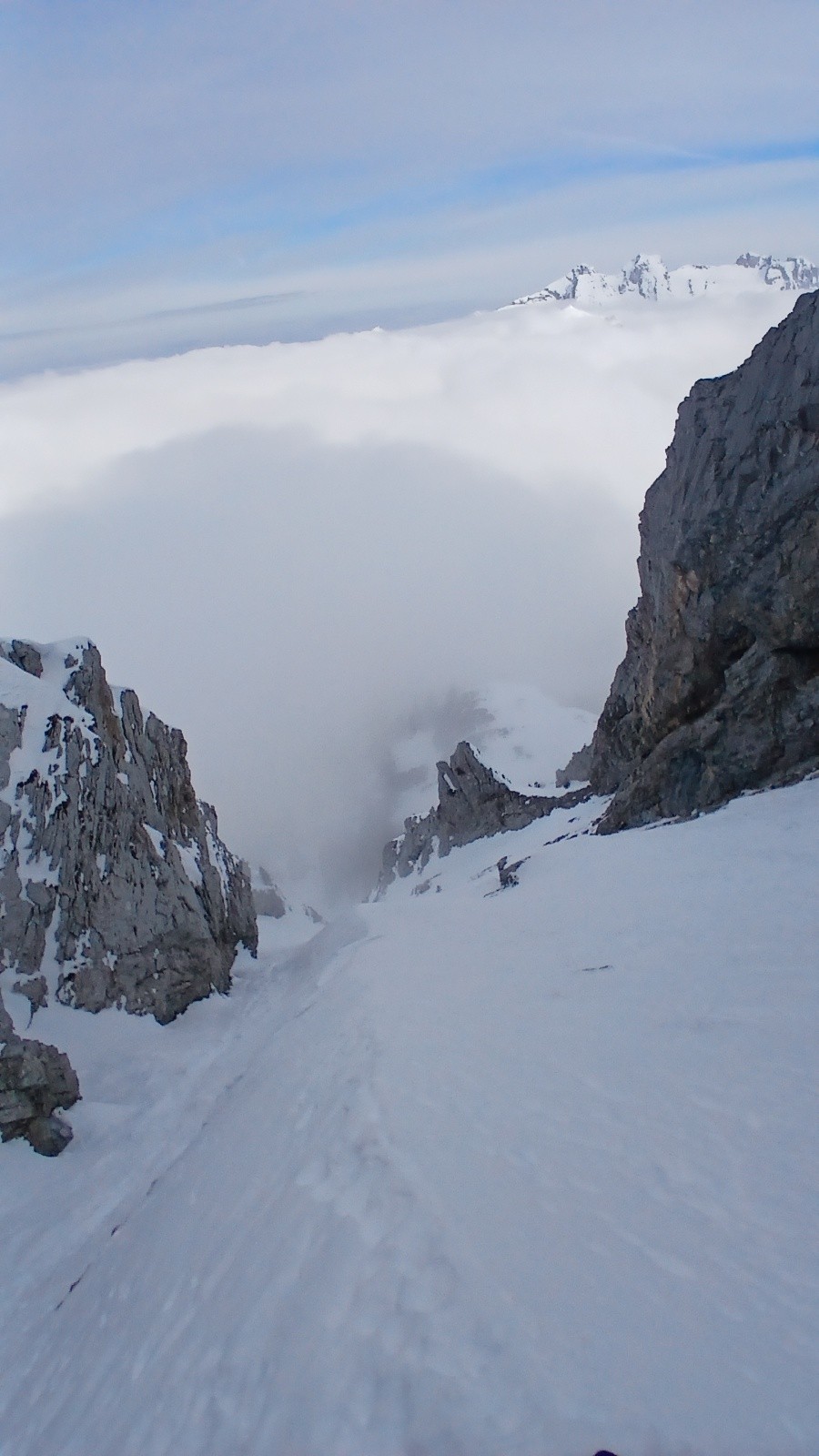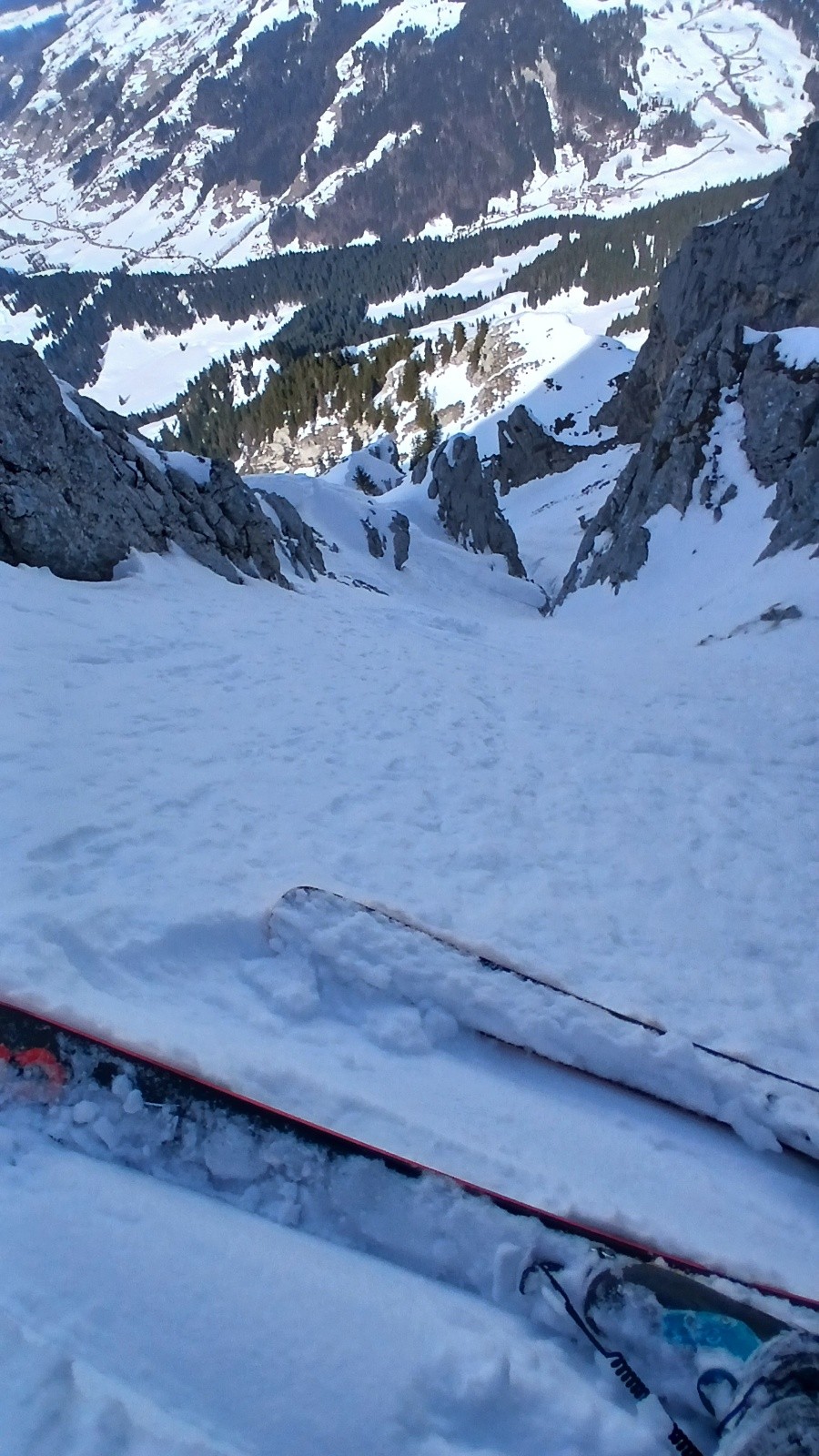 Conditions pour le ski : dans l'ensemble plutôt pas mal: neige gelée avec bon grip, poudreuse, neige dense et neige de pritemps. Seule l'entrée du couloir (en bas) est vraiment gelée. Les couteaux sont bien confortables pour accéder au bas du couloir.