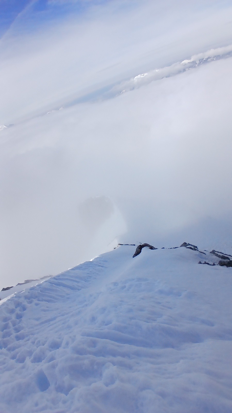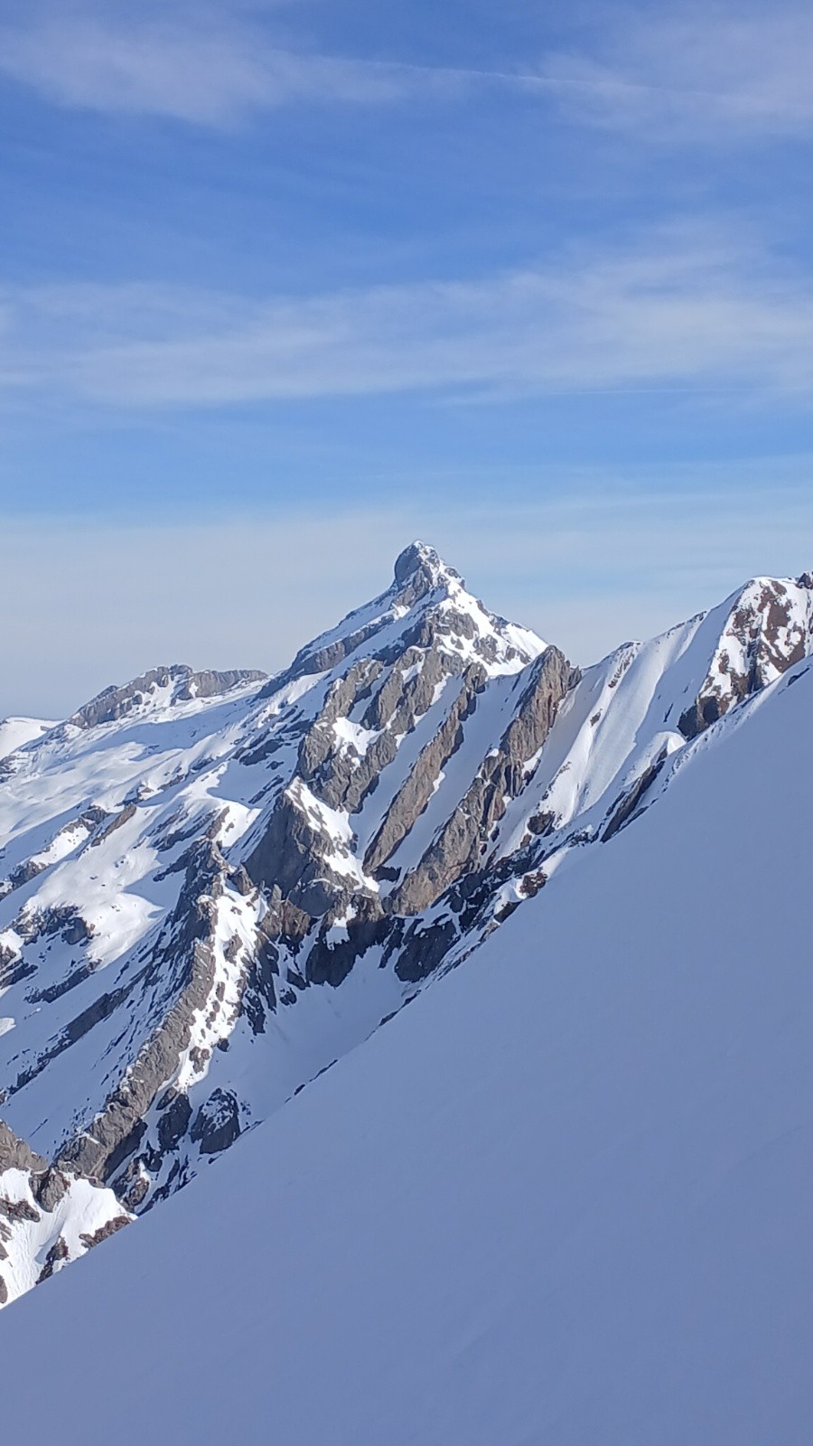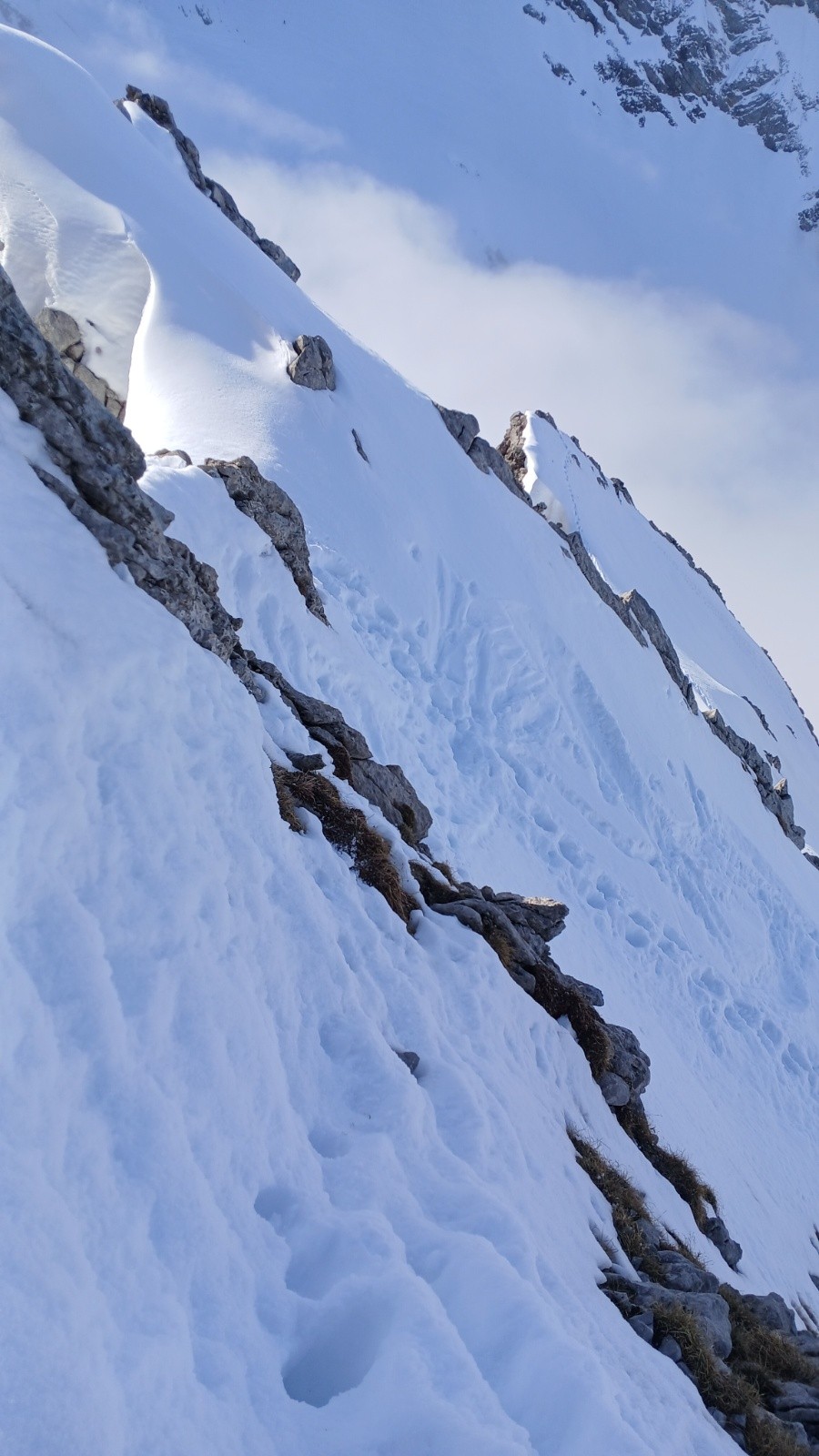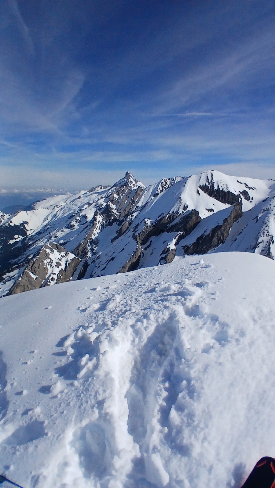 Conditions pour le ski : dans l'ensemble plutôt pas mal: neige gelée avec bon grip, poudreuse, neige dense et neige de pritemps. Seule l'entrée du couloir (en bas) est vraiment gelée. Les couteaux sont bien confortables pour accéder au bas du couloir.