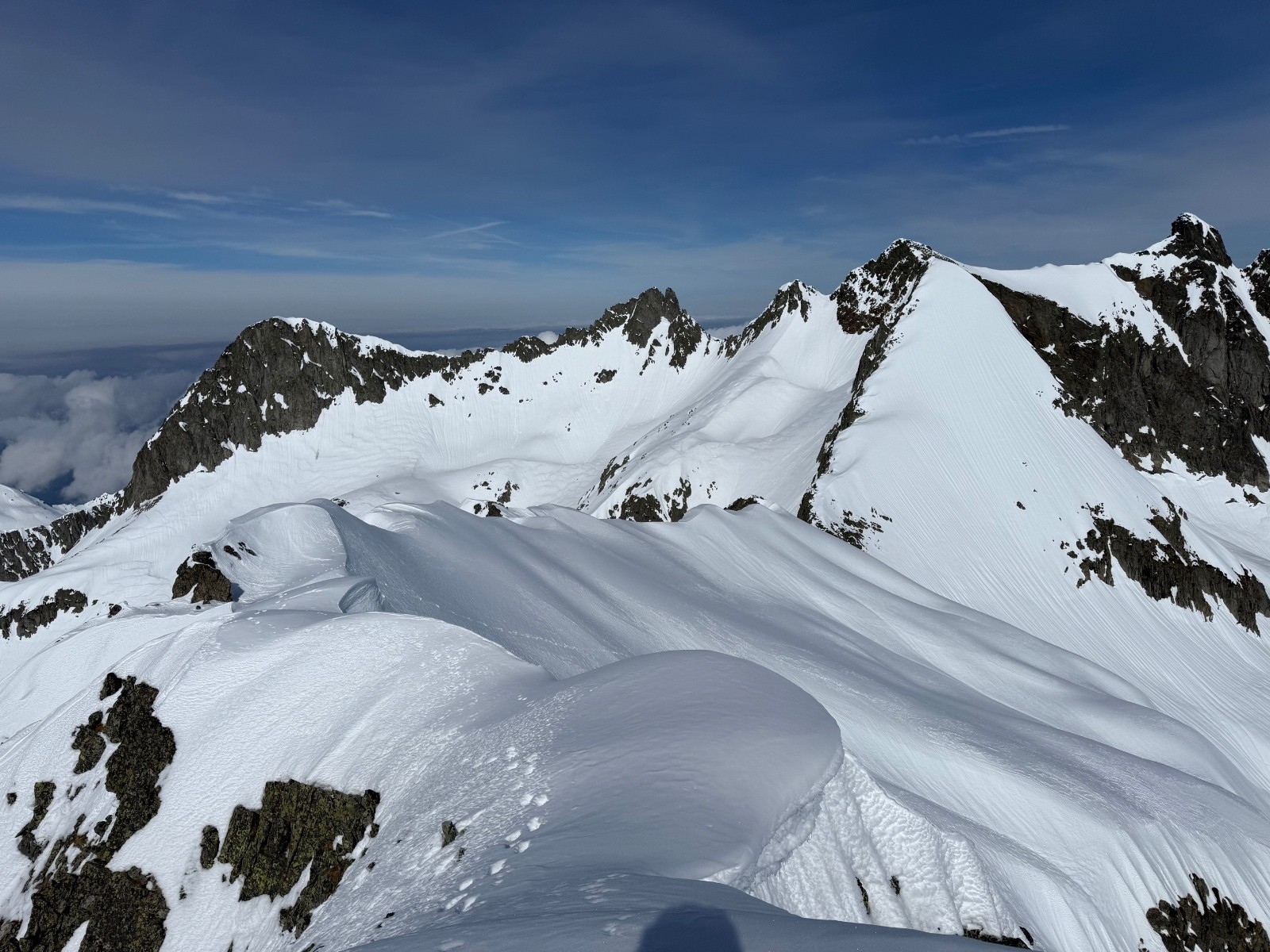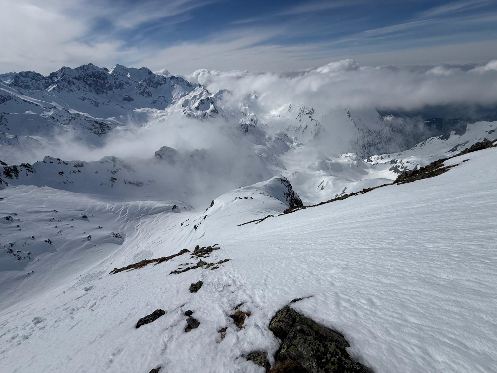 Météo/températures : voile nuageux le matin (limitant bien le réchauffement), puis grand soleil et vers 14h, arrivée de nuages se plaquant bien sûr les sommets côté Grésivaudan. Du vent d’Ouest dans la Combe du Merlet et en montant au Pas de la Fenêtre. Ambiance globale plutôt fraîche à cause du vent.