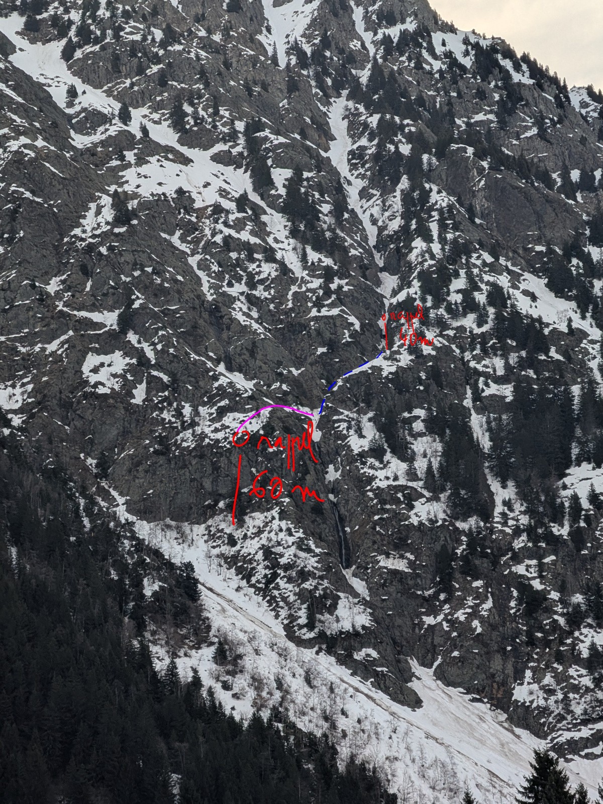 Itinéraire suivi : ne pas tenter de passer à la montée par la cascade du dard. On a buté. On est passés par l'ardoisière et la face ouest (ma compagne m'a laissé là). Du point 2468 descendre en Sud et rattraper une selle de cheval neigeuse (la première). Possibilité depuis le sommet de descendre directement et rejoindre le couloir.